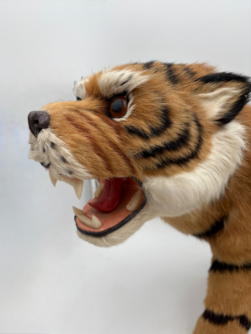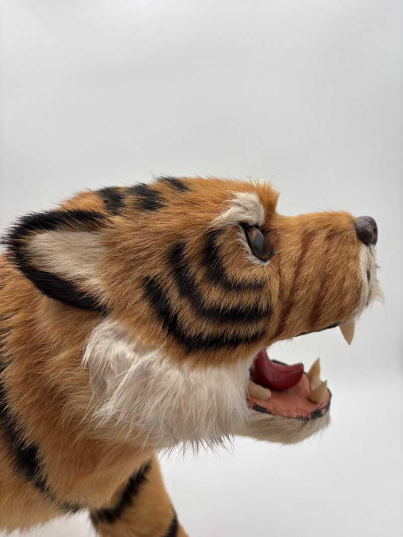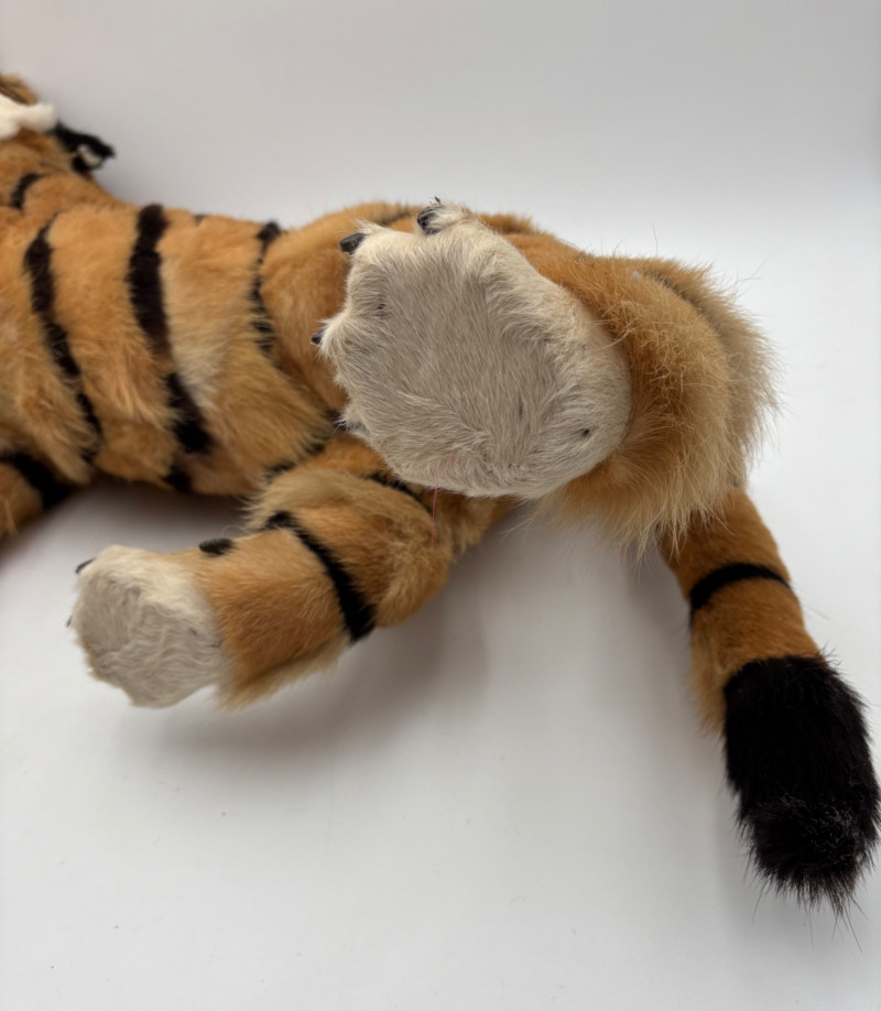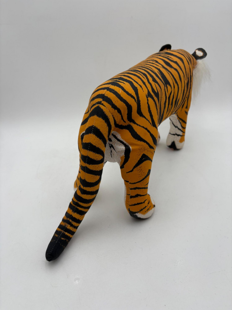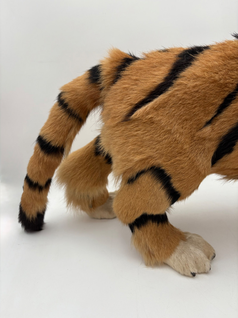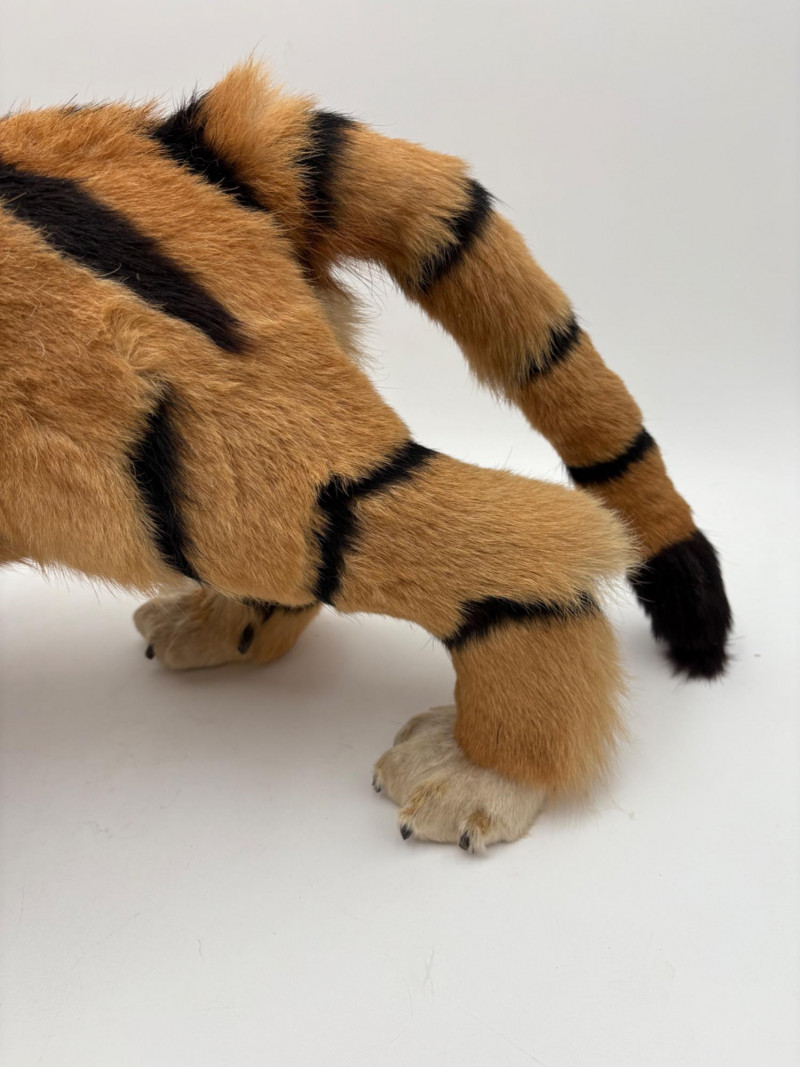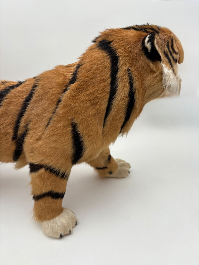 Pair of tigers - one very life-like and the other not-so-much! The larger of the two has faux fur (we think it looks like dyed cowhide - it's the same texture as high-end "ponyhair" shoes) over a shaped body. He is of substantial size measuring 15" H x 33" L x 12" W (front body curves). He has a few minor flaws (black lining around his right lower lip is missing - see mouth photo), but overall in good shape.* He has no tag, be we are guessing he is from the 1980s. Smaller tiger is made of printed fabric and has terrible posture. He measures 9" H x 22" L x 5" W. In good shape*- made for the National Wildlife fund in 1990. * Both tigers were in storage for a LONG time and could use a good airing out and cleaning.