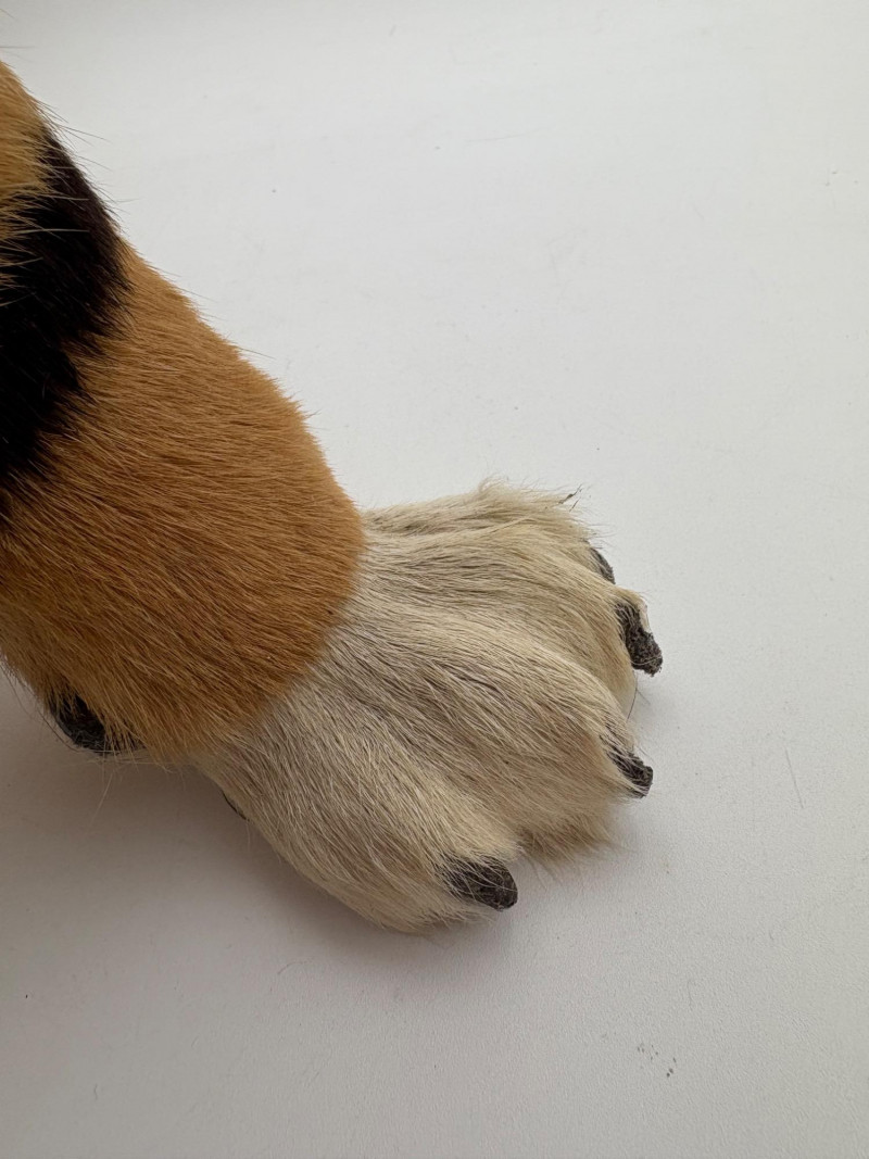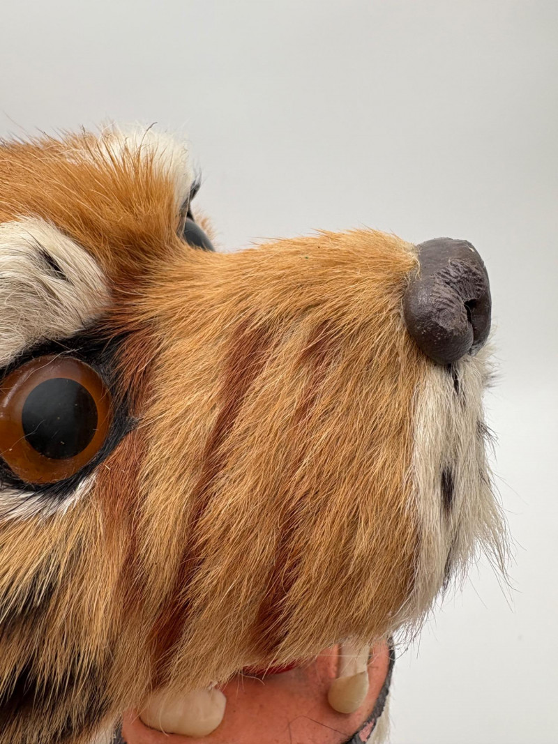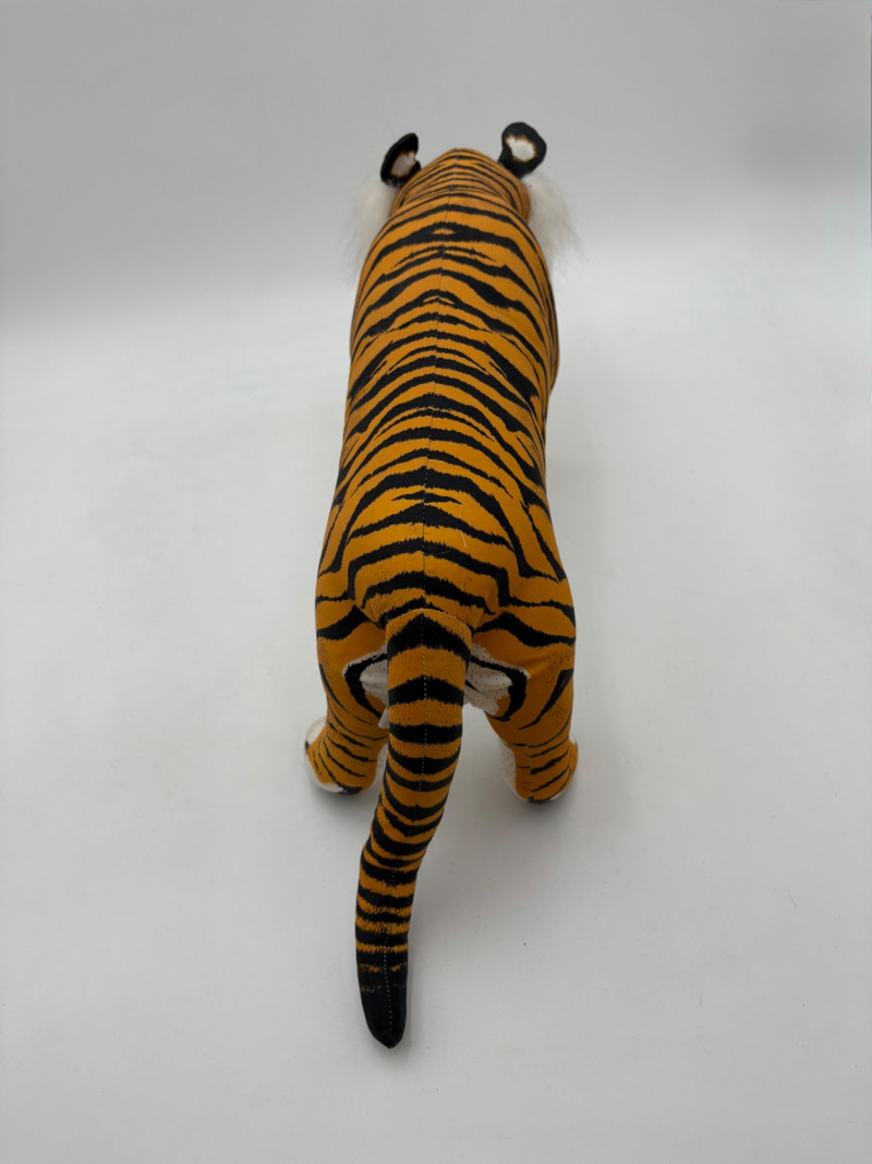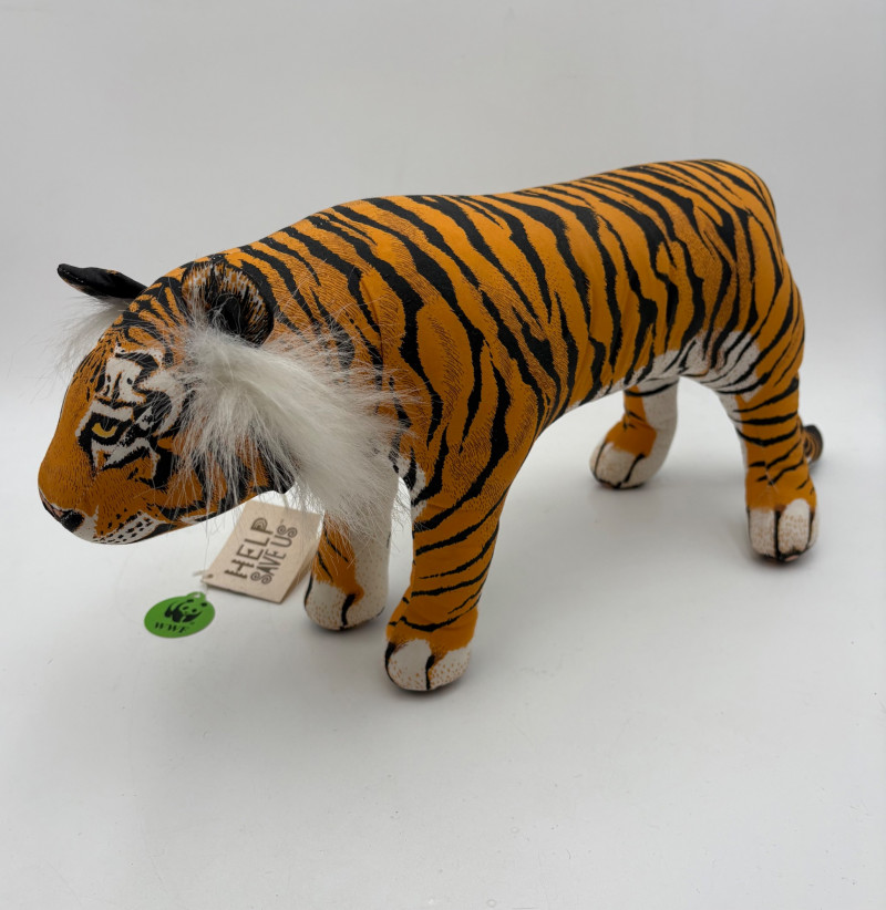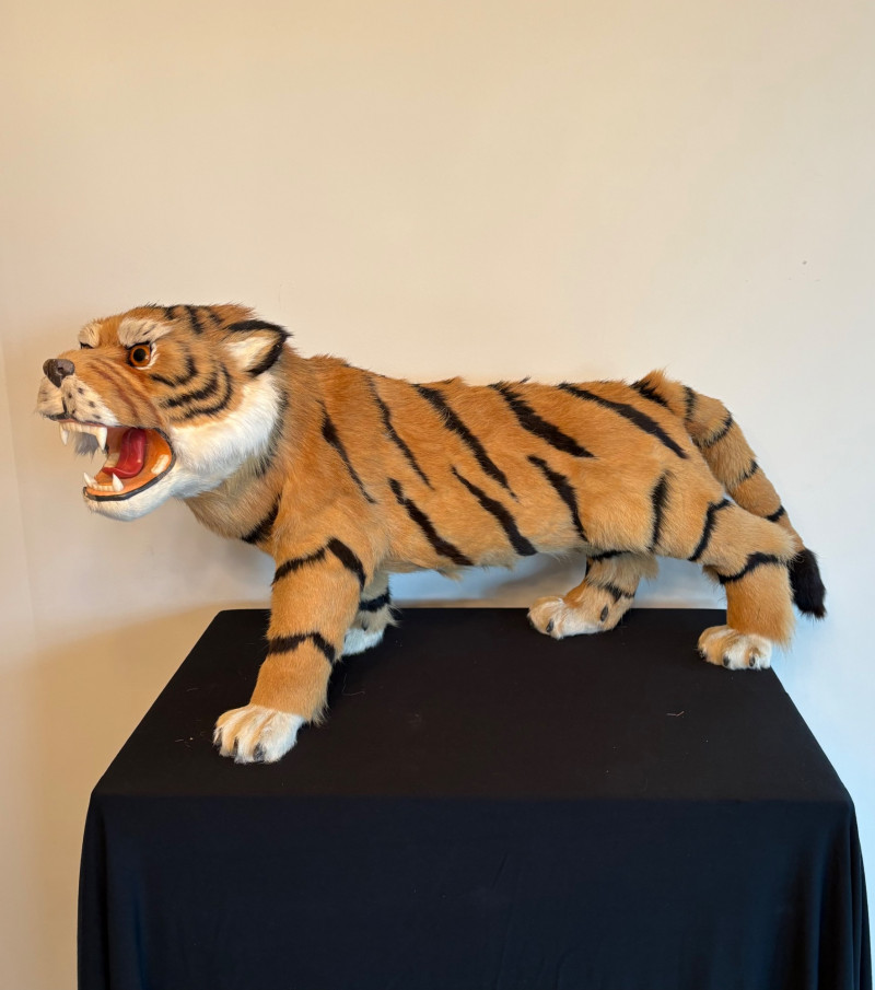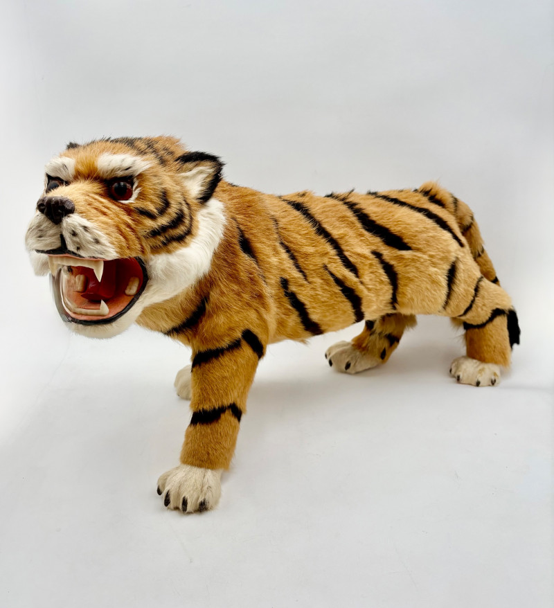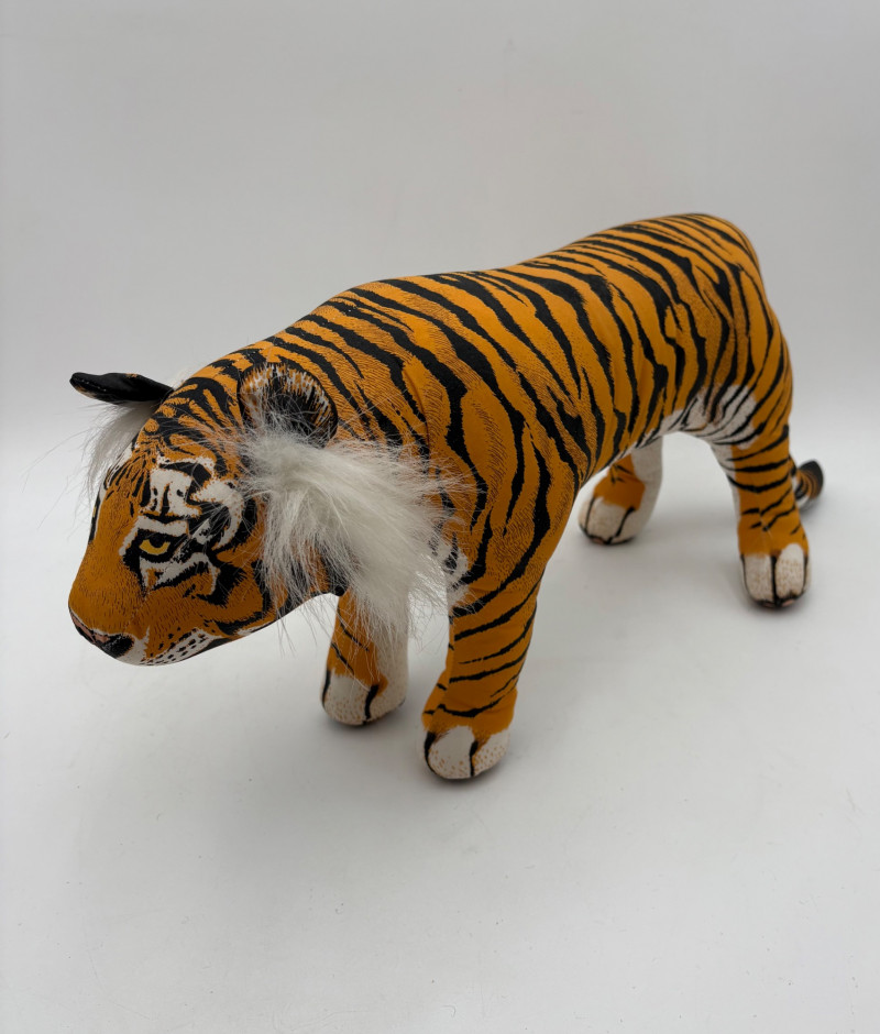 Pair of tigers - one very life-like and the other not-so-much! The larger of the two has faux fur (we think it looks like dyed cowhide - it's the same texture as high-end "ponyhair" shoes) over a shaped body. He is of substantial size measuring 15" H x 33" L x 12" W (front body curves). He has a few minor flaws (black lining around his right lower lip is missing - see mouth photo), but overall in good shape.* He has no tag, be we are guessing he is from the 1980s. Smaller tiger is made of printed fabric and has terrible posture. He measures 9" H x 22" L x 5" W. In good shape*- made for the National Wildlife fund in 1990. * Both tigers were in storage for a LONG time and could use a good airing out and cleaning.