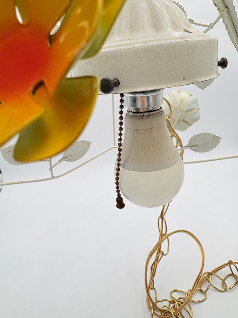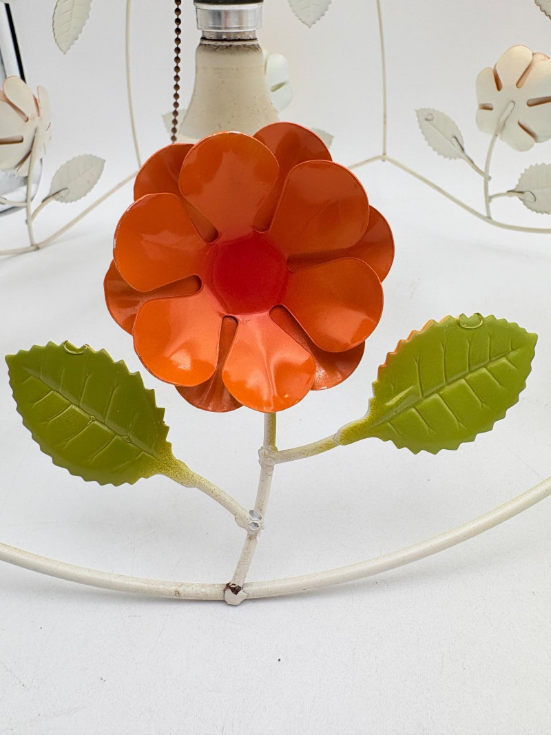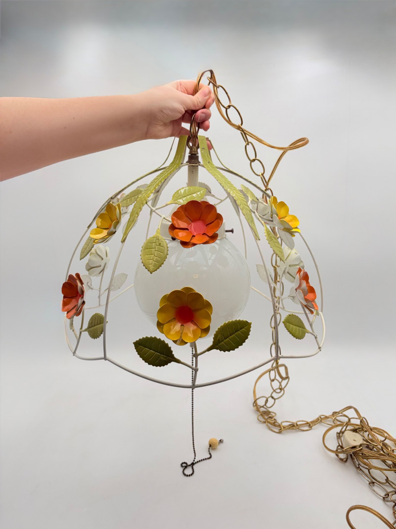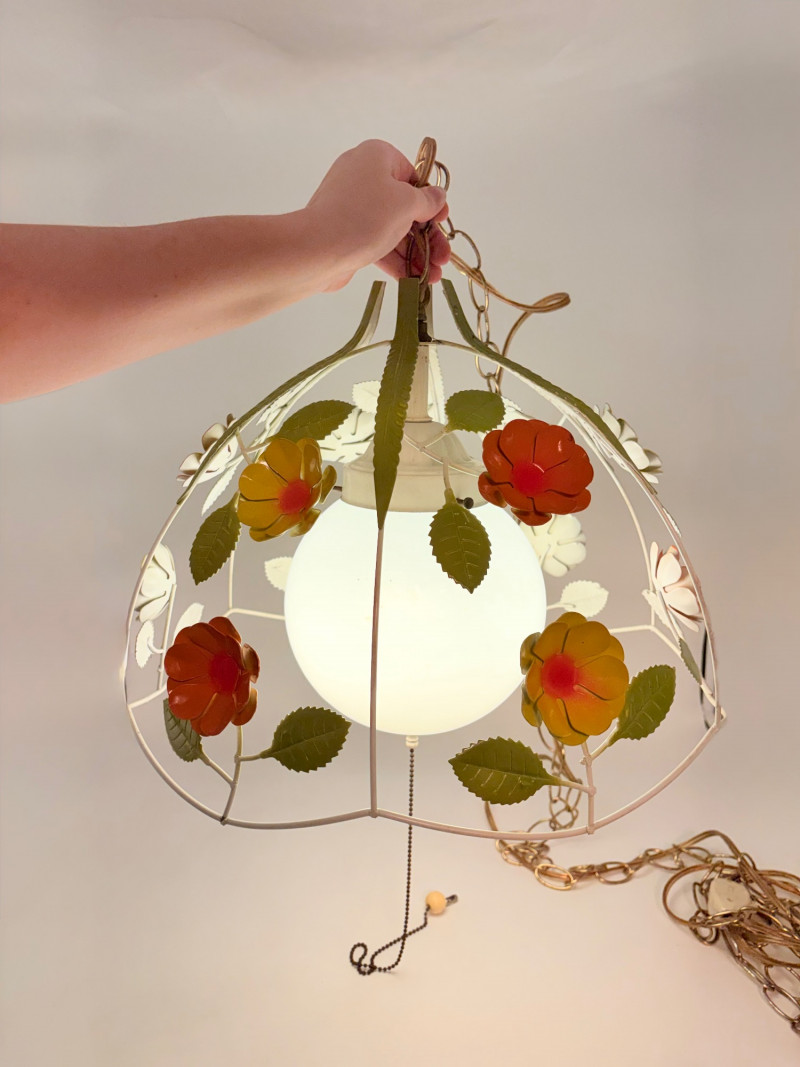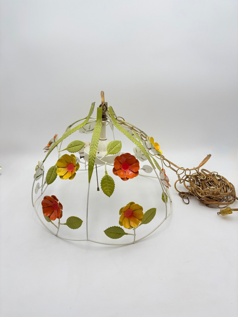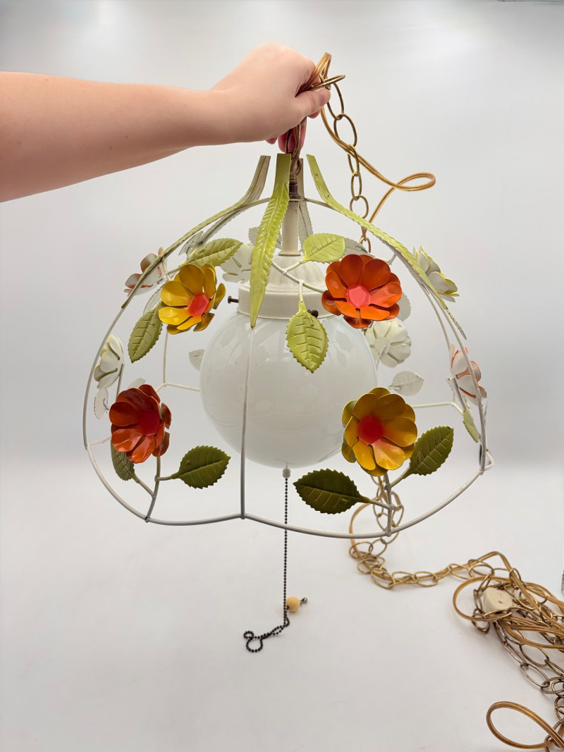 We love this hanging lamp! Made of cut metal, it has cheery green & yellow multi-petal flowers attached to a white curved frame with a slightly scalloped edge. The light socket is inside the white globe. We think originally the light was a pull-chain on/off, but at some point it was rewired to have a roller on/off switch along the woven cord/chain. The original pull chain is still there inside the white globe but isn't operative - the chain hanging down from the globe is decorative - controls are on the chain as noted. Light works right now as is, but it could use a bit of TLC - a good scrub and some tightening along the socket area would really make it a great addition to any retro room. If it were our lamp, we would probably remove or shorten the long ball chain cord hanging from the globe since it's non-operational and we think it doesn't vibe with the lamp design. We believe this is terrific 1970s lighting. White outer frame with flowers attached measures approx. 11" H. Cord measures approx. 10' of chain with a foot or two more of cord. Vintage Mid Century MCM Tole Metal Flower Daisy Birdcage Chandelier Swag Light, 1950s, Mid Century Swag Light Fixture - Etsy Same light, but mislabeled as from the 1950s