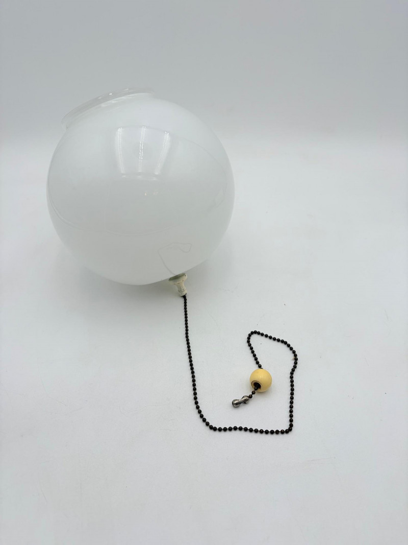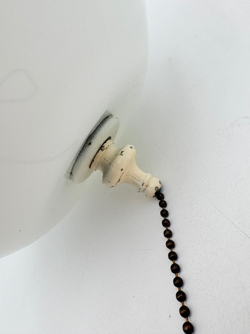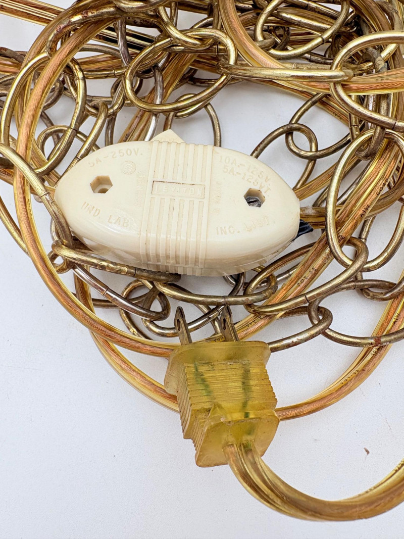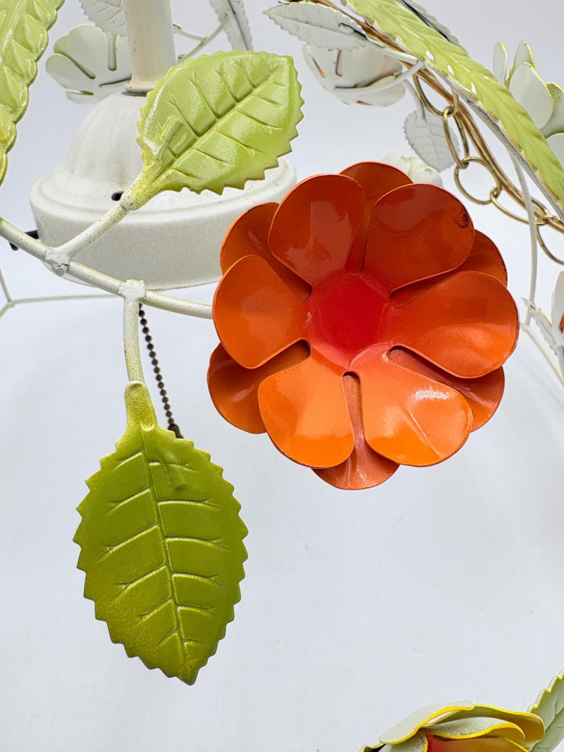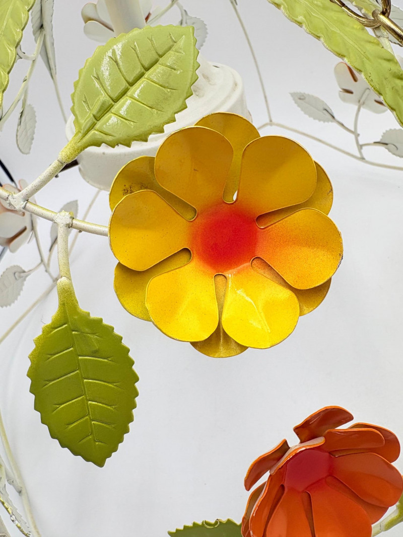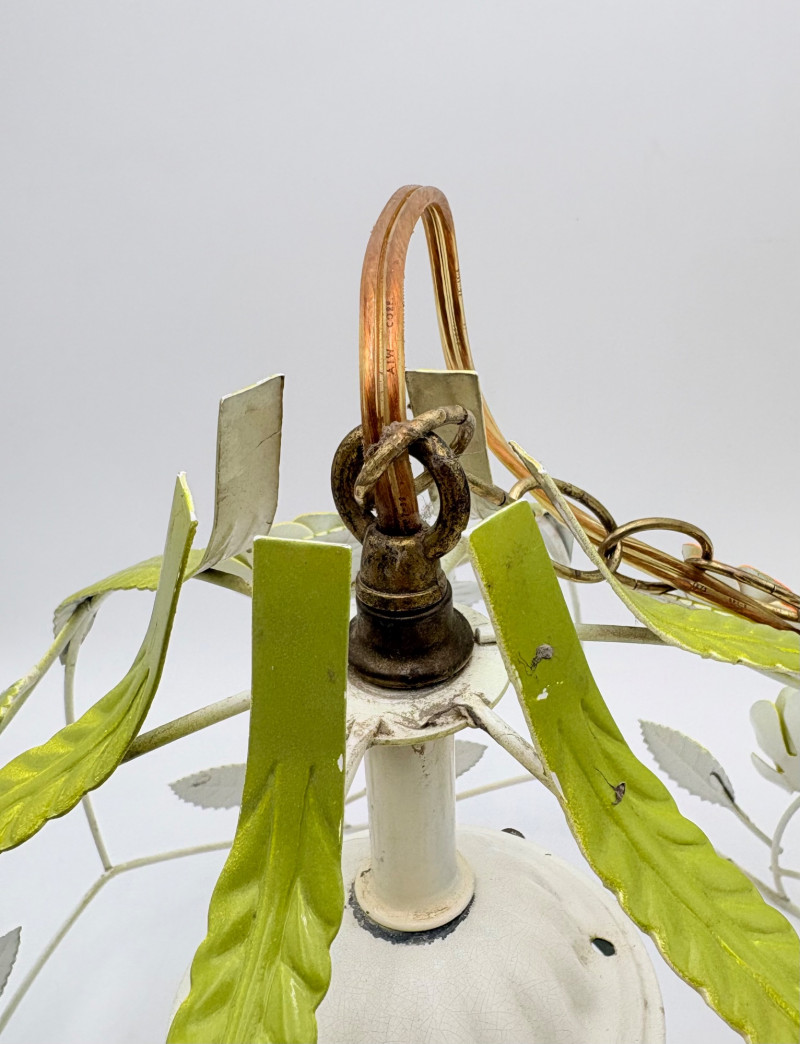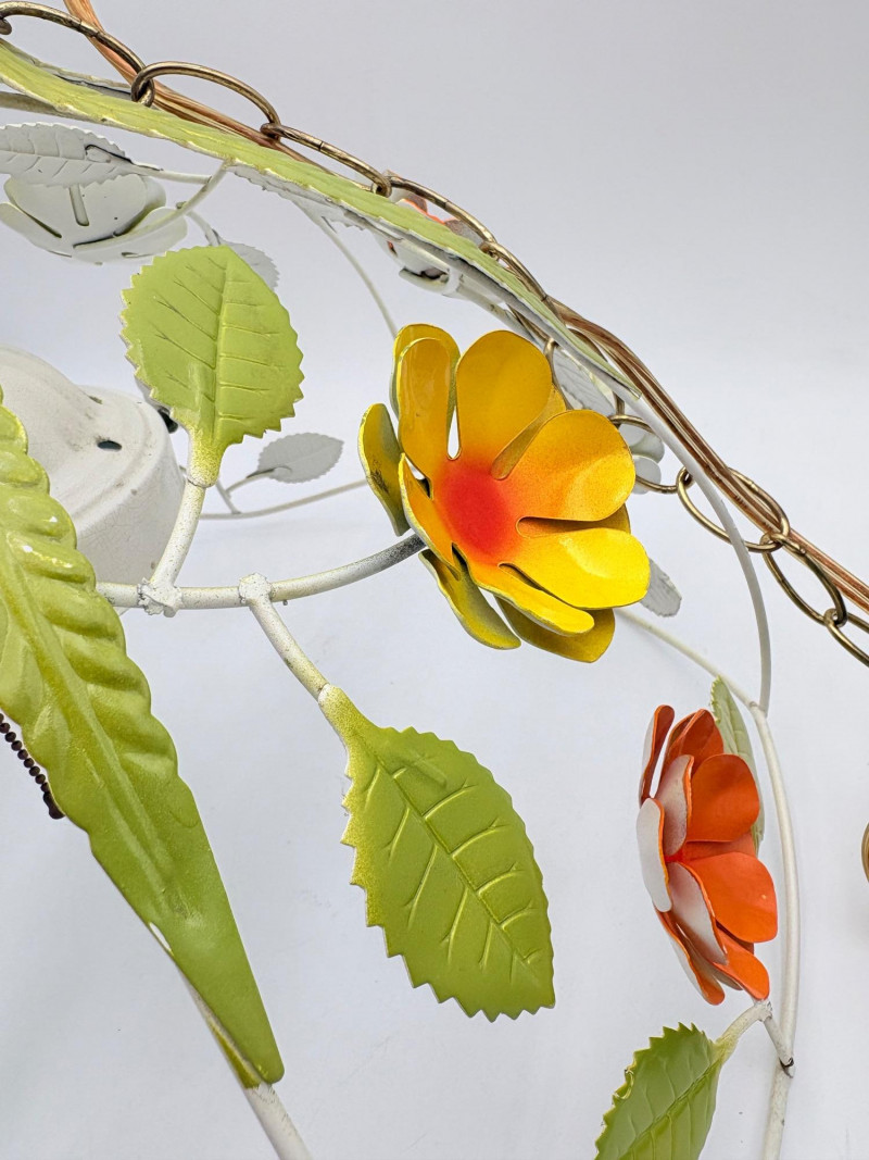 We love this hanging lamp! Made of cut metal, it has cheery green & yellow multi-petal flowers attached to a white curved frame with a slightly scalloped edge. The light socket is inside the white globe. We think originally the light was a pull-chain on/off, but at some point it was rewired to have a roller on/off switch along the woven cord/chain. The original pull chain is still there inside the white globe but isn't operative - the chain hanging down from the globe is decorative - controls are on the chain as noted. Light works right now as is, but it could use a bit of TLC - a good scrub and some tightening along the socket area would really make it a great addition to any retro room. If it were our lamp, we would probably remove or shorten the long ball chain cord hanging from the globe since it's non-operational and we think it doesn't vibe with the lamp design. We believe this is terrific 1970s lighting. White outer frame with flowers attached measures approx. 11" H. Cord measures approx. 10' of chain with a foot or two more of cord. Vintage Mid Century MCM Tole Metal Flower Daisy Birdcage Chandelier Swag Light, 1950s, Mid Century Swag Light Fixture - Etsy Same light, but mislabeled as from the 1950s