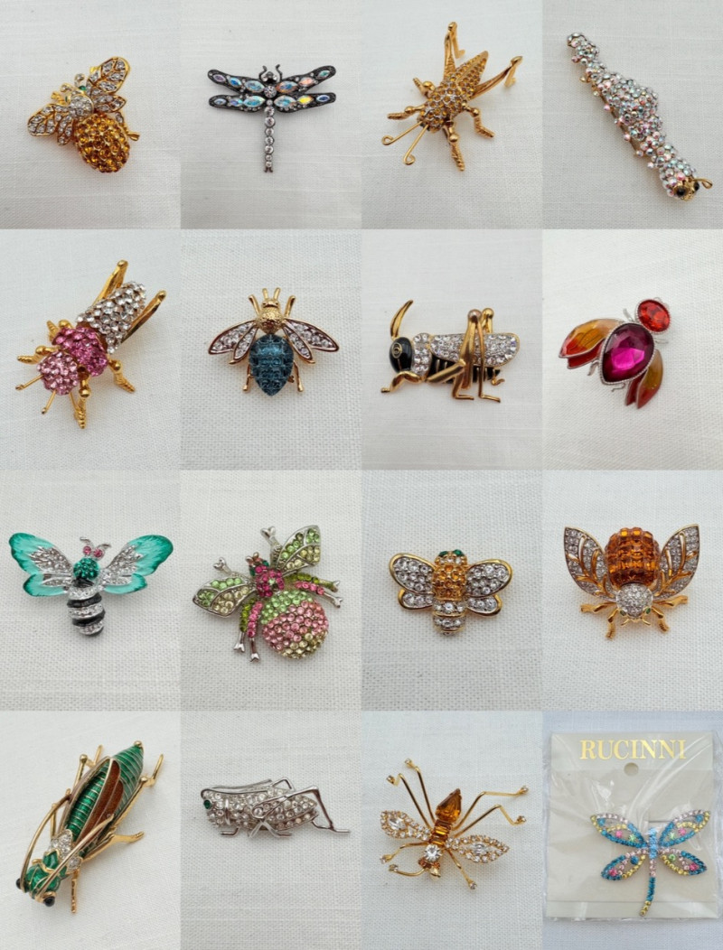 Wonderful swarm of assorted insects - crickets, beetles, inchworms, and more - all with sparkle! Good quality costume jewelry with a number of vintage pieces. Please see photos for details.