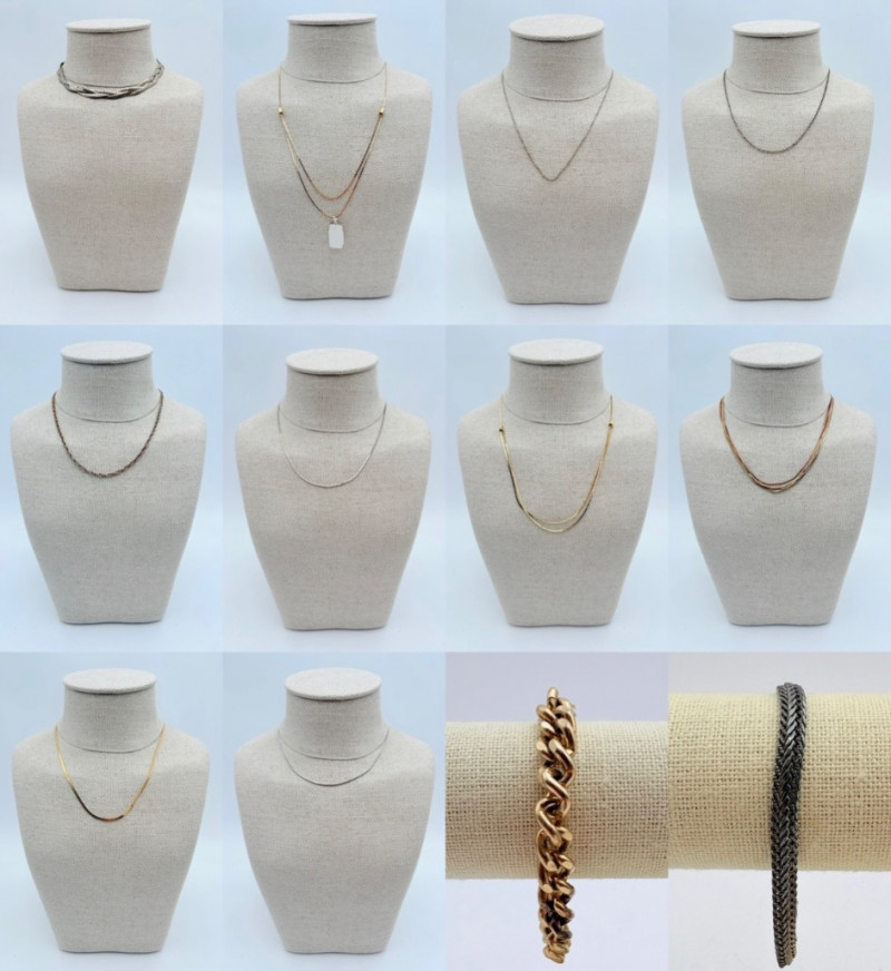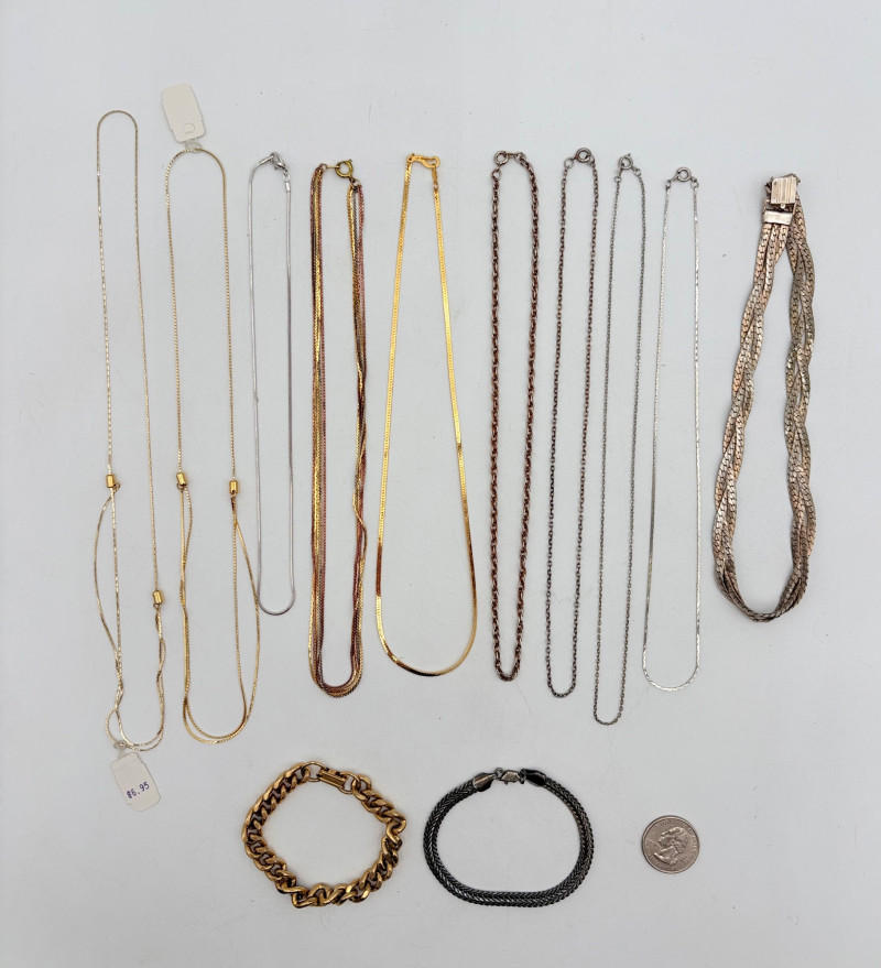10 chains in need of a pendant and 2 bracelets in need of a wrist. These chains are not marked with either maker or material, but all are operative with clasps and are looking to service your pendant needs! Some are vintage and some are new. Please see photos for details.
