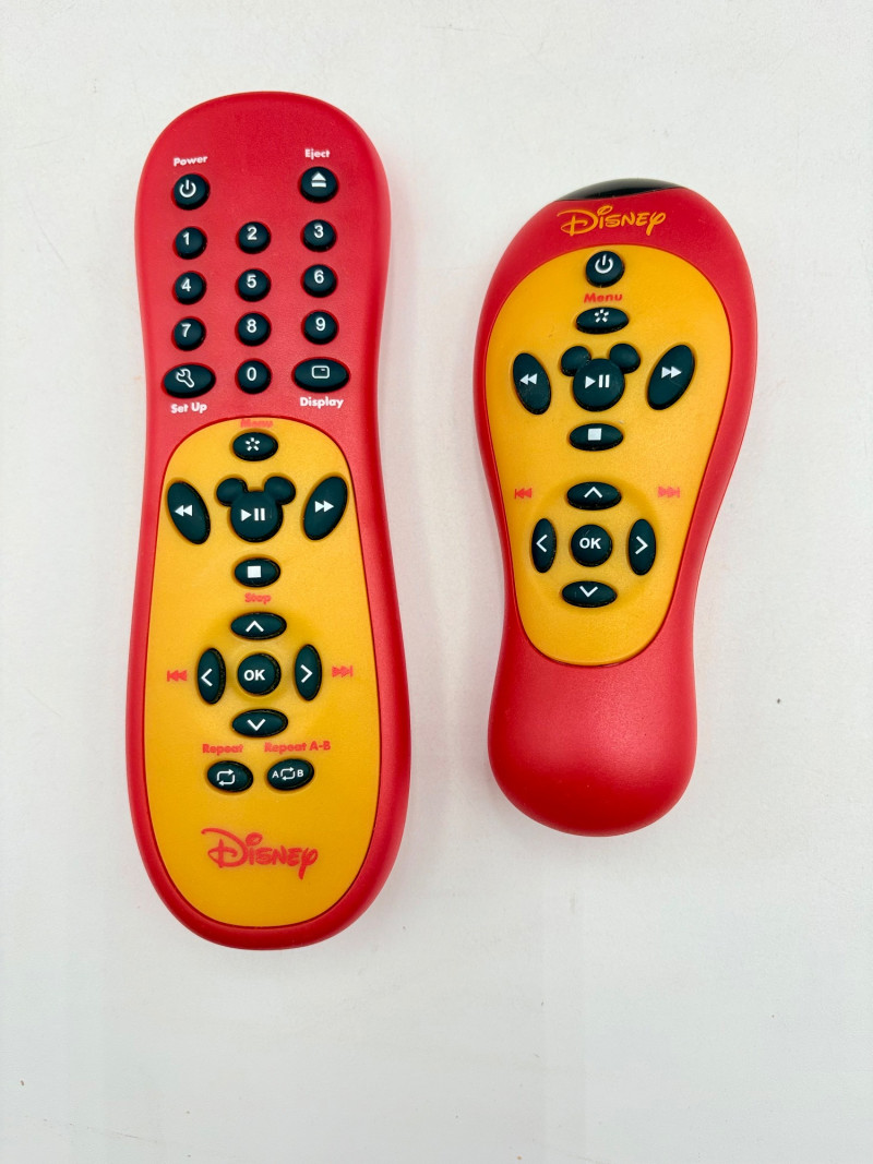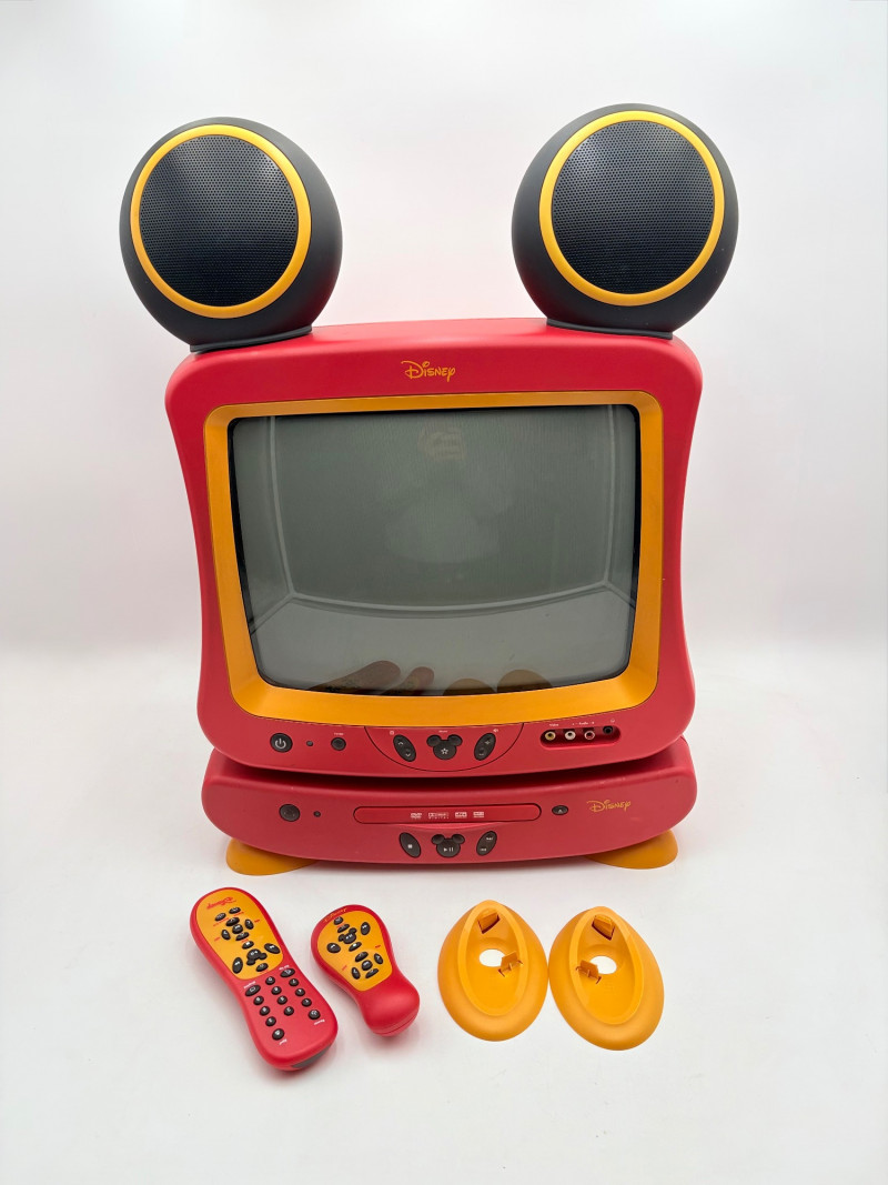 Disney/Mickey Mouse group: Red Mickey Mouse TV and DVD player. Buttons are mouse ears! Pieces come apart & stack. They measure approximately 17" H. TV powers up, but we do not have the cords to connect the TV to the DVD player so we are unsure about connectivity. We could not get the DVD player to noticeably power up (the on/off buttons on both pieces do not light up when powered up) but client said it was working the last time tried. You will have to take your chances on this. There are some slight cosmetic flaws on the top of the TV, but it’s definitely great for a kids playroom. Model DT-1350-C from 2004. Trio of vintage flocked figures of Minnie Mouse, Goofy, and Daffy Duck from the Applause Co. They all stand approximately 3.5" - 4.5" H. We think these are from the 1960s/1970s. Mickey Skiddie Kiddie push-toy from Mattel. Push the blue plastic wheeled mechanism and Miki walks. From 1967 Mickey Mouse window cling Mickey Mouse plastic folders Marx Toys - Jiminy Cricket plastic figure from 1971. Measures 4" H Miscellaneous Disney magnets 4 Hallmark keepsake Halloween ornaments - appear to be new in box. As noted previously, all things in this auction would benefit from a good scrub. UPDATE - we found the mouse ear speakers for the TV and 2 remotes!!! Please take a look at the last 5 photos! Note that speakers/remotes are untested. Mickey