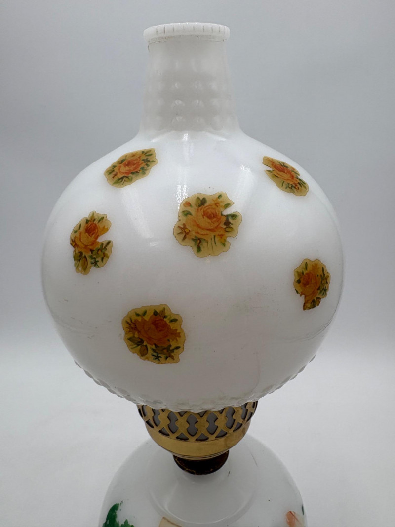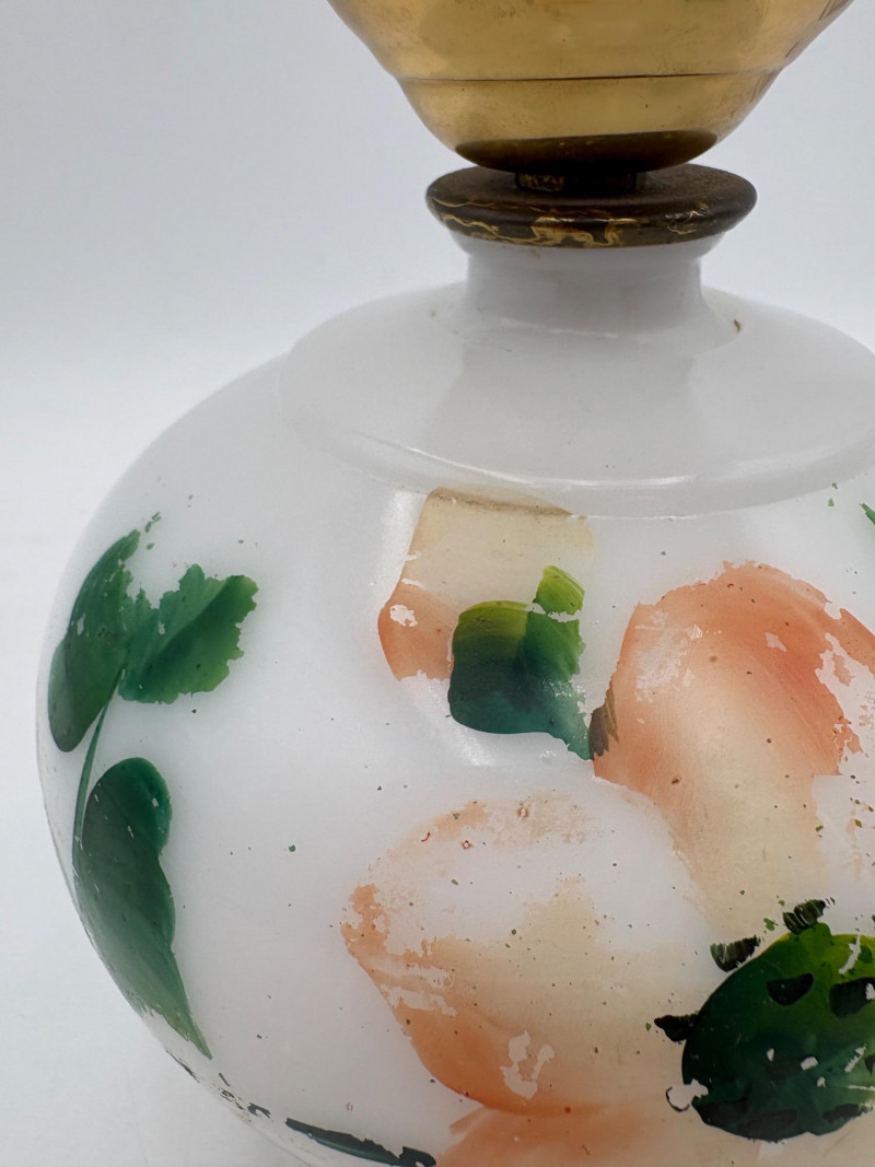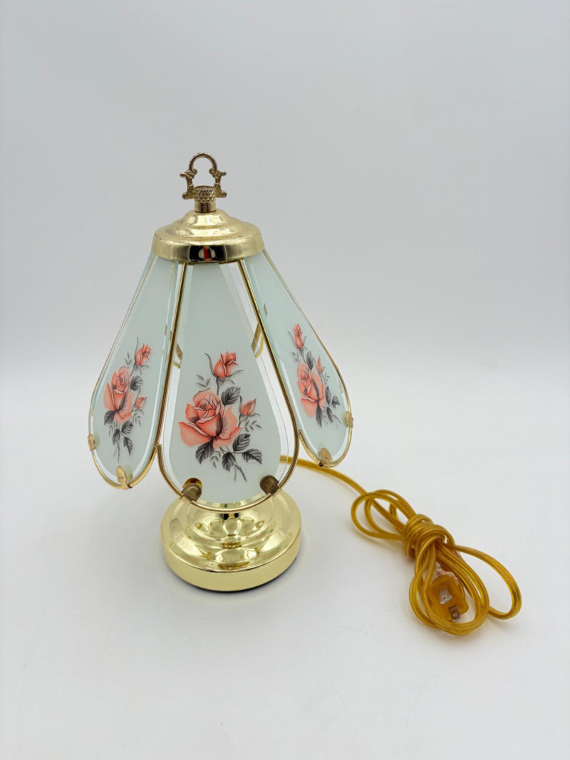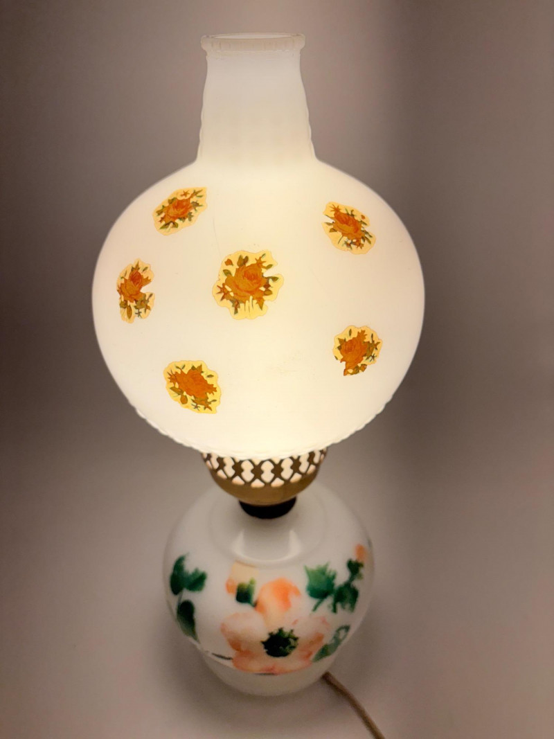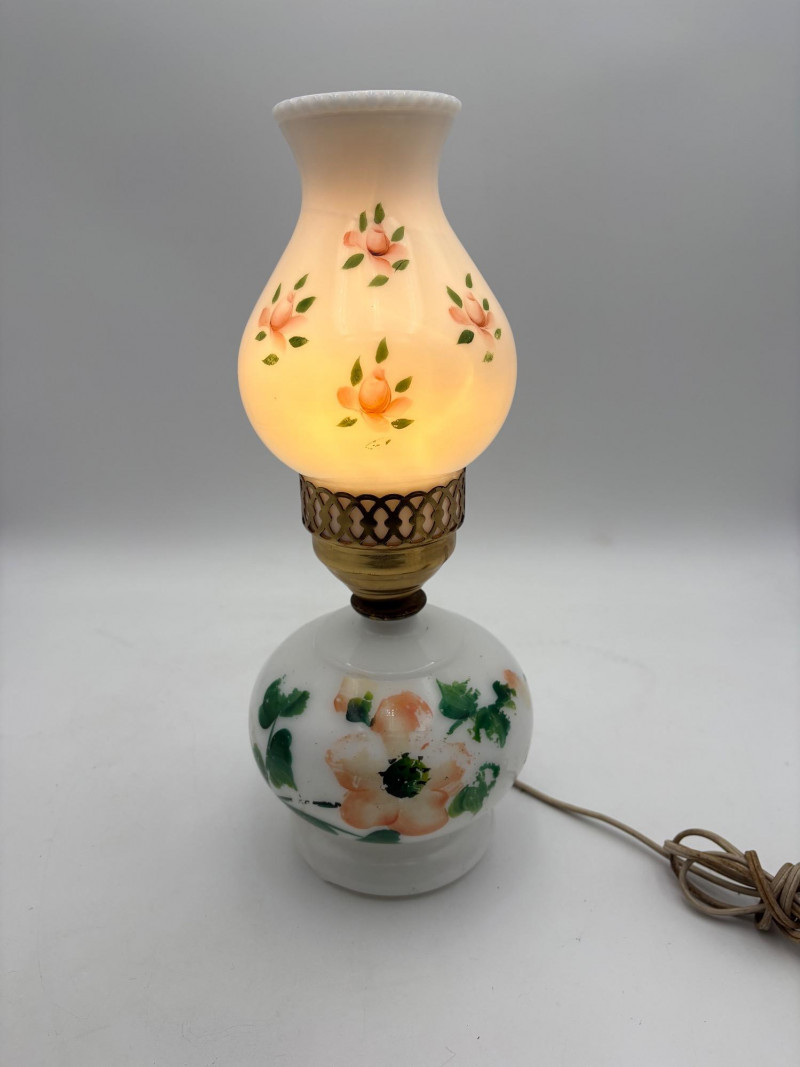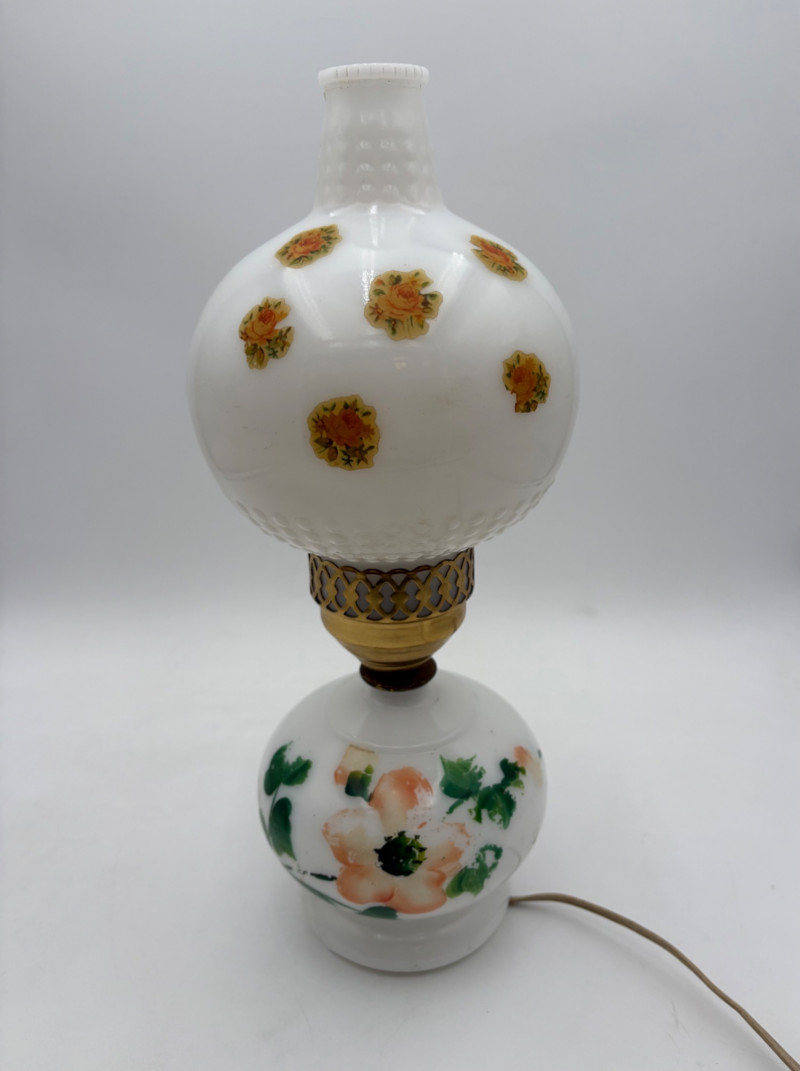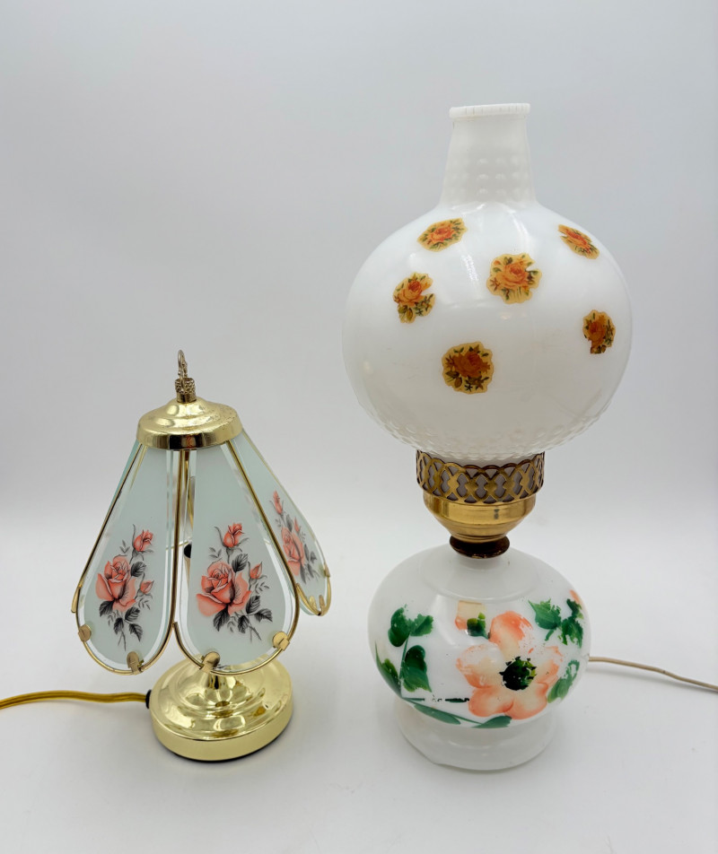 Two vintage lamps with a floral theme - both electric with 2-prong plug. Both are in working order. Victorian style globe lamp resembles an oil lamp but doesn't appear to be a conversion to electric from what we see. Milk glass shade & base are hand-painted directly on the glass - notice there is some loss of the painting on the base, but the glass itself is in good shape. We don't think the globe is original to this base although it fits perfectly (the painting styles and color schemes don't pair all that well). While the lamp is perfectly operational as is, if it were ours, we would strip the paint off the globe and base and use it as a solid white milk glass lamp with no embellishment - the shape is wonderful. Measures approx. 16" H. The smaller lamp has a "touch" on and off built into its base - touch once it turns on, touch again and it gets brighter, touch yet again and it gets brighter still. Touch one last time and it turns off. Has easily removeable rose motif glass panels when the disk the finial screws into is removed - easy cleaning! Shade frame and base appear to be in good vintage shape with minimal use wear. Measures approx. 12" H. BONUS - after we shot this lot, we found a third lamp that blended well with the globe lamp described above - in fact, we wonder if this third lamp's top shade actually belongs to the previously mentioned lamp. Please see the last photos - this third lamp base has a bottom globe that lights (socket needs securing) and a floral painted shade that fits better on the aforementioned lamp.