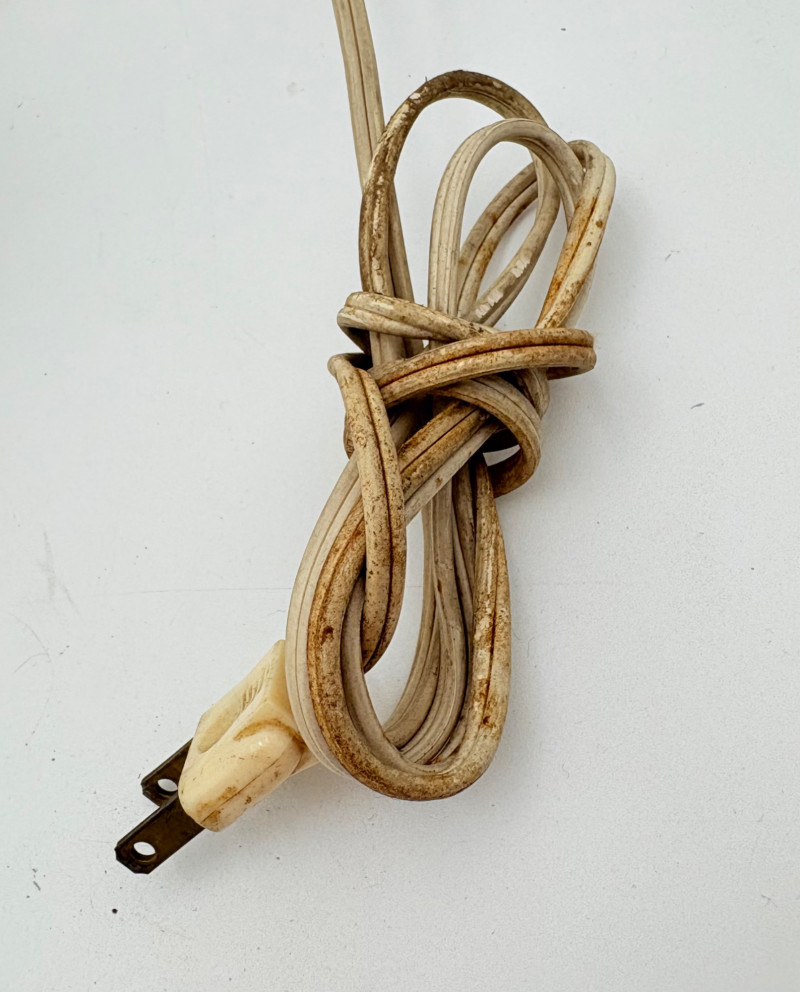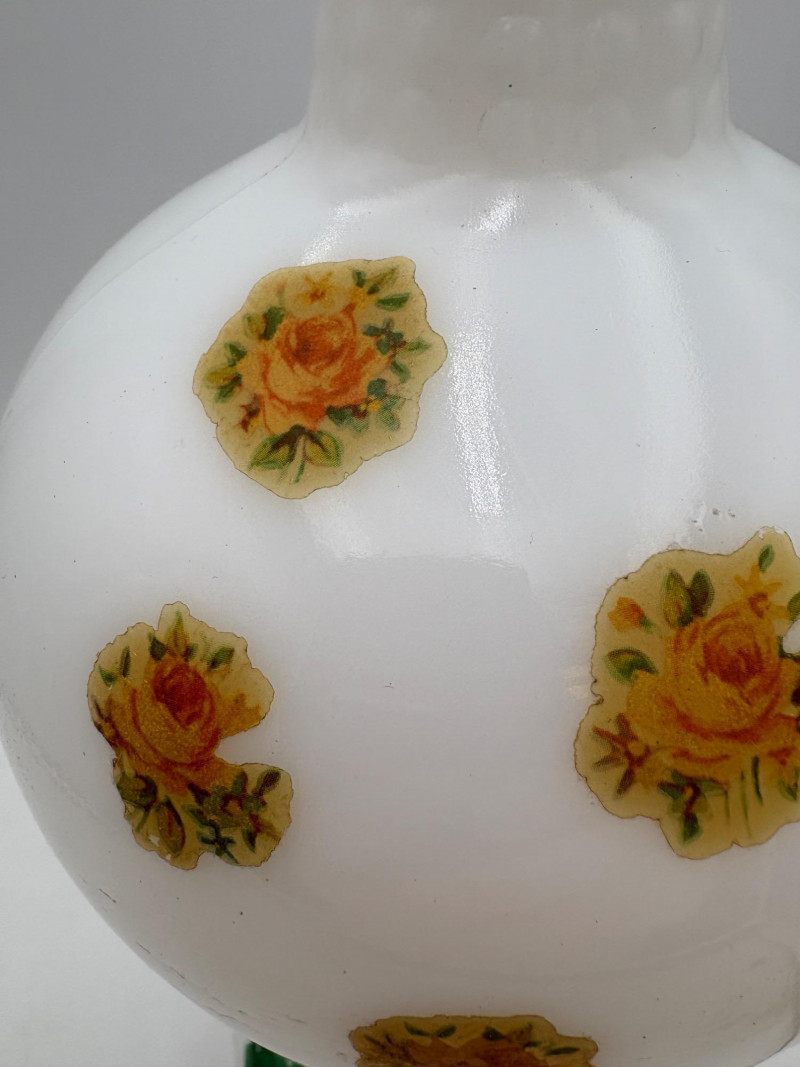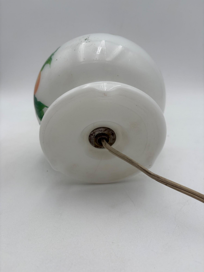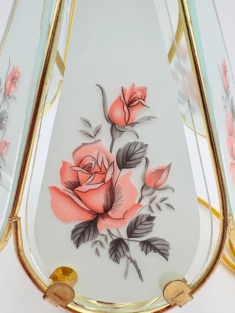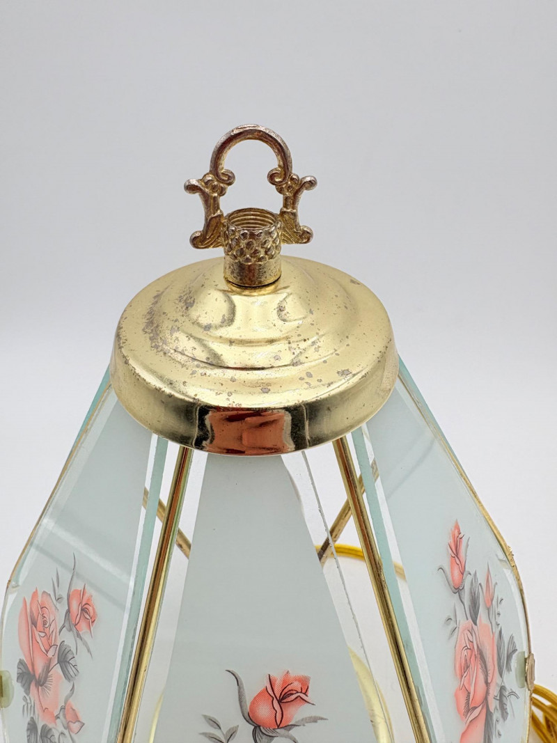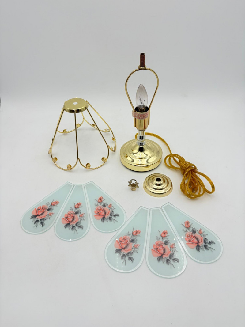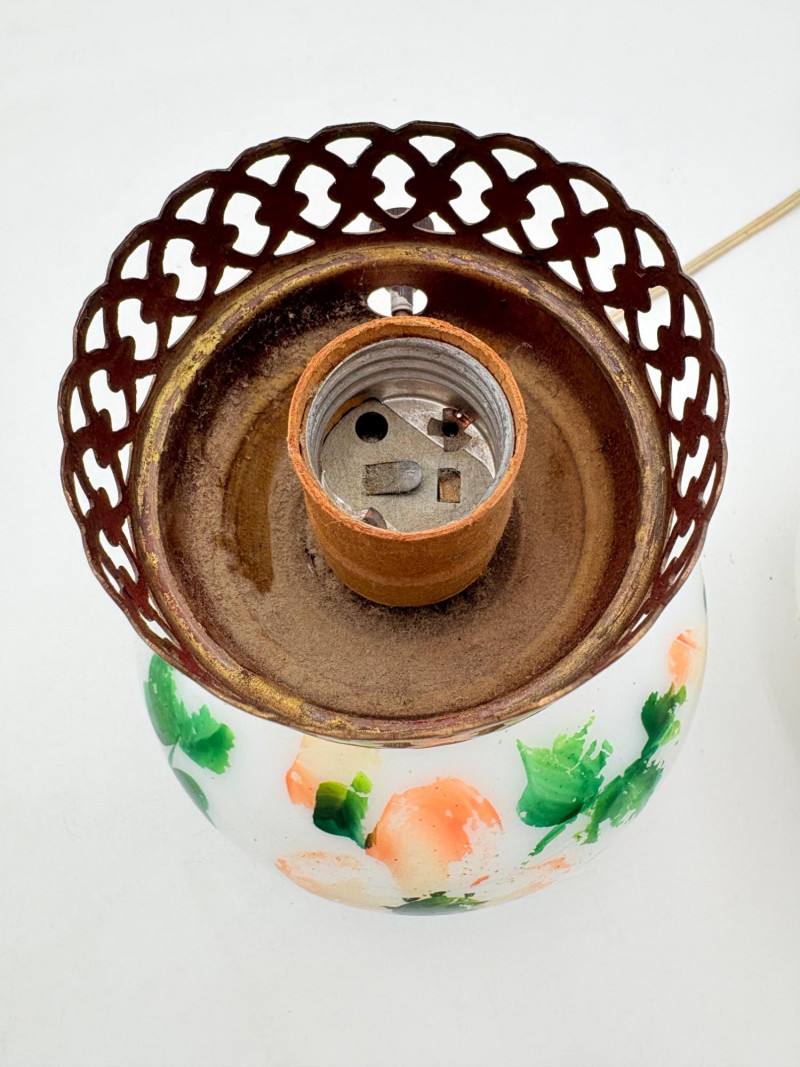 Two vintage lamps with a floral theme - both electric with 2-prong plug. Both are in working order. Victorian style globe lamp resembles an oil lamp but doesn't appear to be a conversion to electric from what we see. Milk glass shade & base are hand-painted directly on the glass - notice there is some loss of the painting on the base, but the glass itself is in good shape. We don't think the globe is original to this base although it fits perfectly (the painting styles and color schemes don't pair all that well). While the lamp is perfectly operational as is, if it were ours, we would strip the paint off the globe and base and use it as a solid white milk glass lamp with no embellishment - the shape is wonderful. Measures approx. 16" H. The smaller lamp has a "touch" on and off built into its base - touch once it turns on, touch again and it gets brighter, touch yet again and it gets brighter still. Touch one last time and it turns off. Has easily removeable rose motif glass panels when the disk the finial screws into is removed - easy cleaning! Shade frame and base appear to be in good vintage shape with minimal use wear. Measures approx. 12" H. BONUS - after we shot this lot, we found a third lamp that blended well with the globe lamp described above - in fact, we wonder if this third lamp's top shade actually belongs to the previously mentioned lamp. Please see the last photos - this third lamp base has a bottom globe that lights (socket needs securing) and a floral painted shade that fits better on the aforementioned lamp.