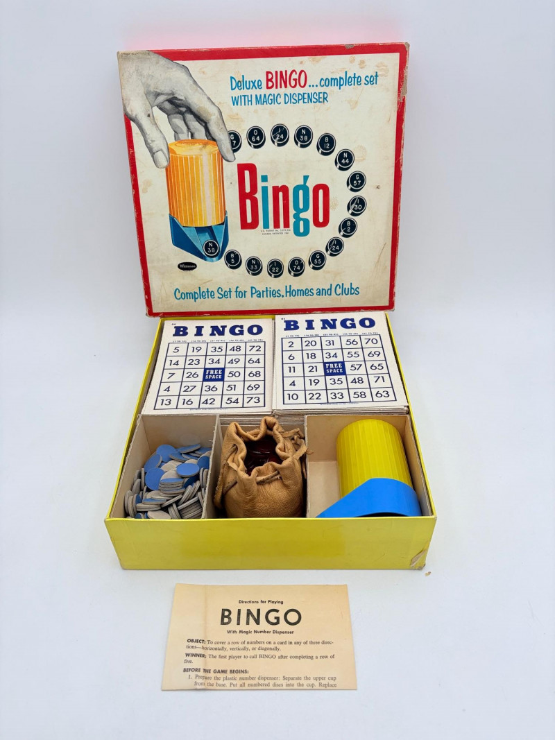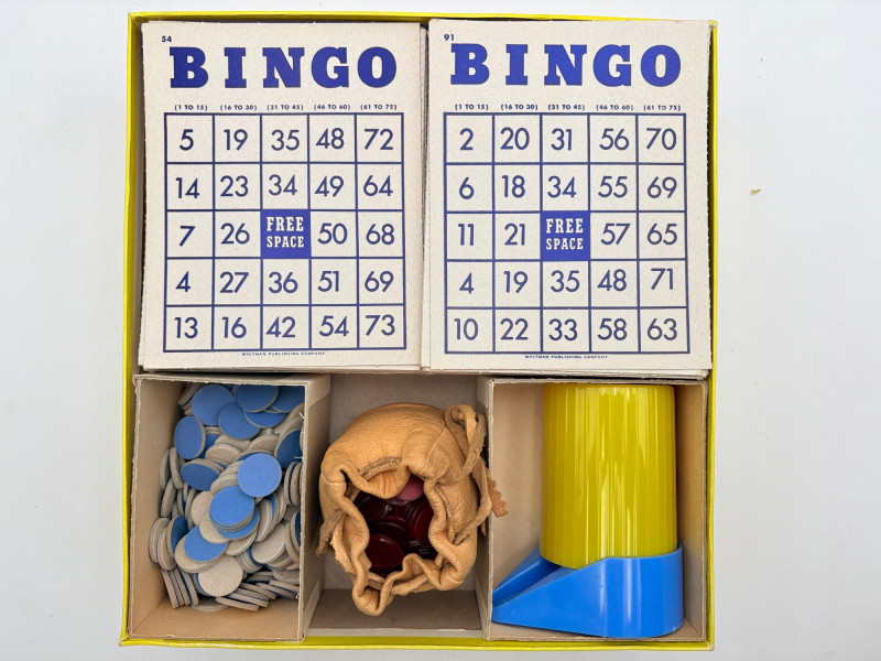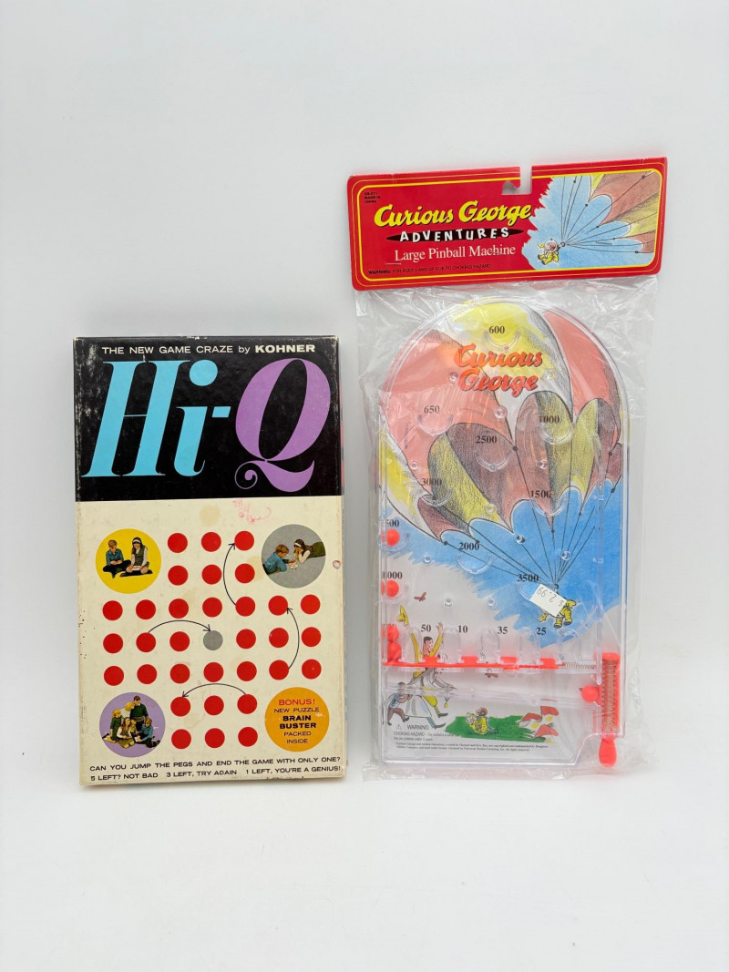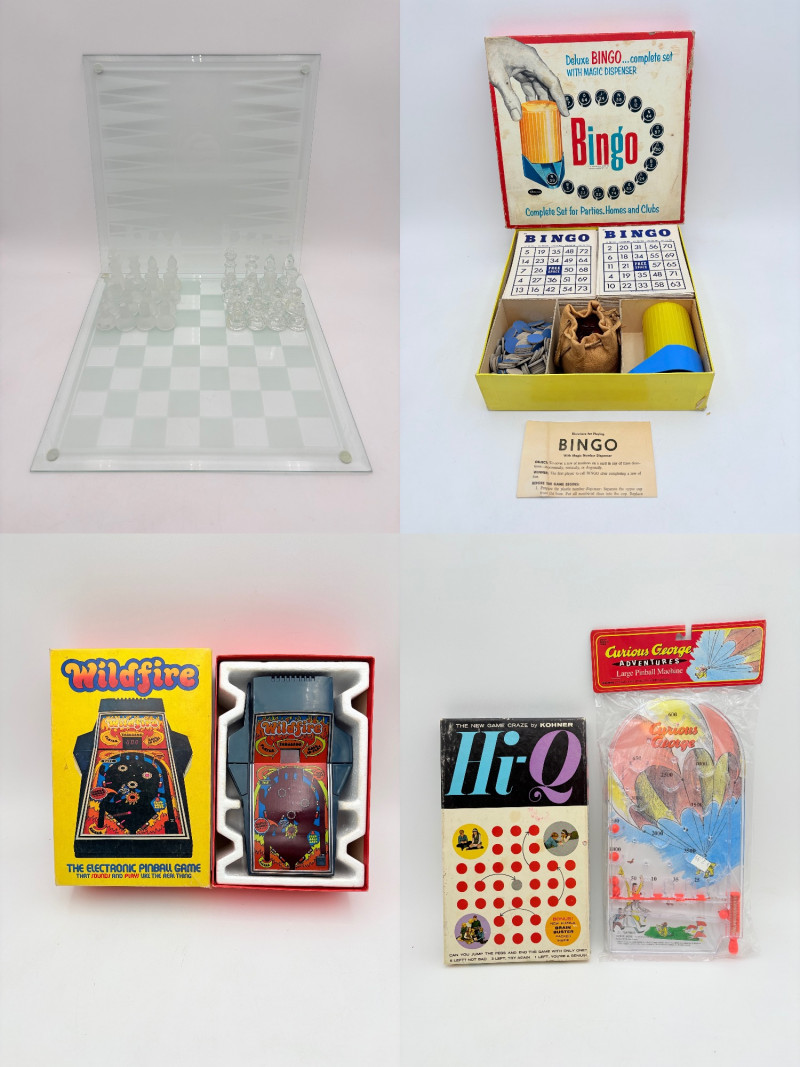 Games and entertainment for everyone! Glass chess set with additional backgammon board. Everything is made of glass with game boards measuring approximately 14 in.² and the tallest of the chess pieces measuring 3" H. All chess pieces are there, but the set has been used with a few signs of use here and there. Deluxe Bingo set with magic dispenser, bingo cards, plastic number pieces, and markers. Appears to be complete. From 1957. Mattel Super Sound ViewMaster has 3-D images and sound. The ViewMaster is new in its original packaging (requires two AAA batteries). Also included are two other sound/image wheels "A Day at the Farm" and "Safari". From 2005. Wildfire handheld electronic pinball game. We put the requisite six AA batteries in it and it powered up & appears to play ok - could use a bit of brushing on the battery contacts, though! Measures 8.5" L x 5" W. From 1979. Classic High-Q game from Kohner. All pegs appear to be present - 40 red & 10 green. We read through the game and don’t really understand it, but I’m sure those of you that are smarter than us know how to play. Instructions on the lid. Some items from other places: Vintage 1979 Parker Brothers Wildfire Electronic Pinball Game - RARE WORKS | eBay 1957 Whitman Deluxe BINGO Set With Magic Dispenser- For Parties, Homes, Clubs - Search Shopping