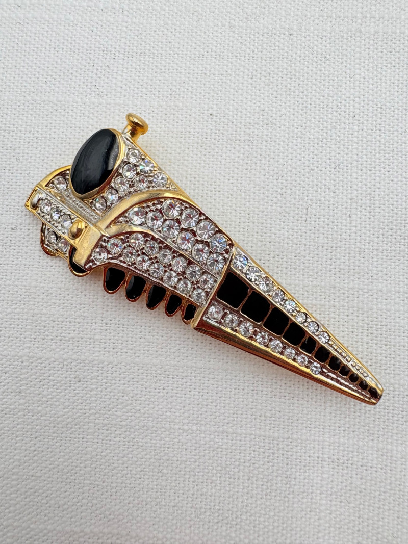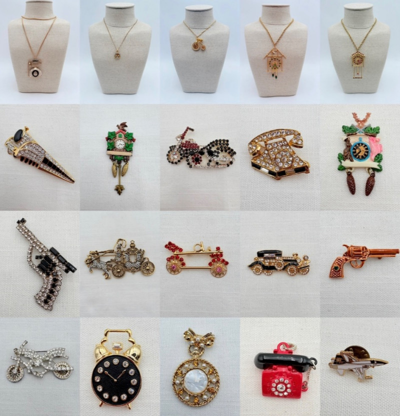 Group of necklaces (5) and pins (15) focused on manmade or mechanical items. Good quality costume jewelry with a number of vintage pieces. Please see photos for details.