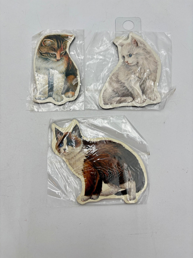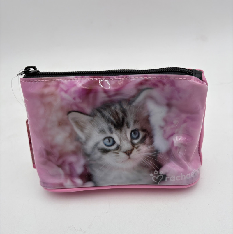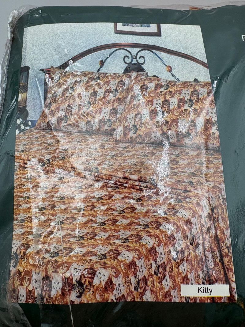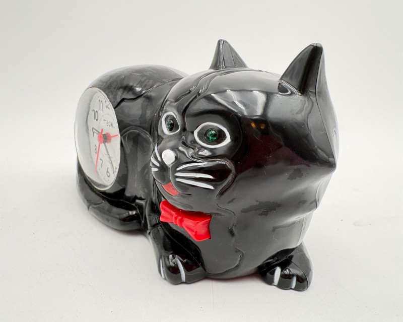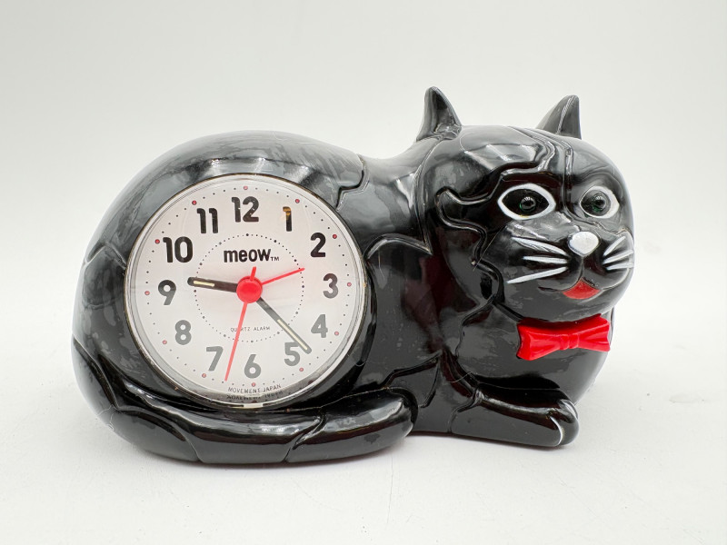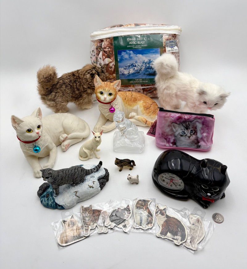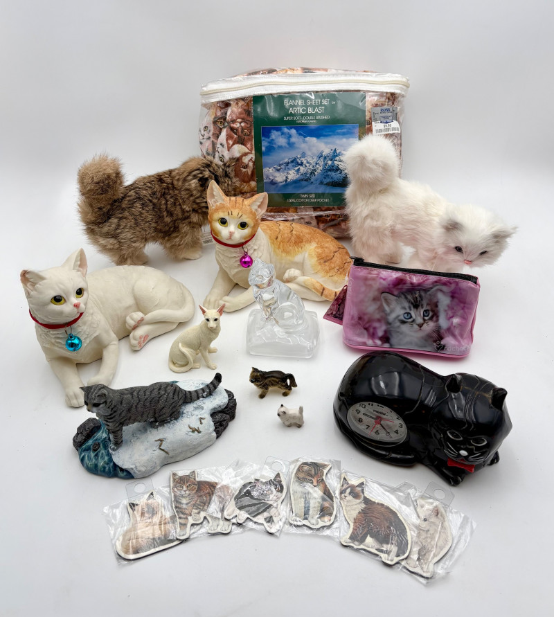 Cat-themed items ranging from furry figures to sheets to a vintage Meow clock (tested and works fine with AA batteries). Look closely at the photos for details and note the last photo with the quarter in the lower right for size comparison. Also note that the purse has some discoloration on the reverse - again, take a look at the photos.