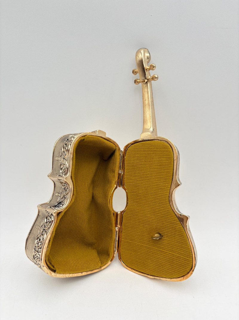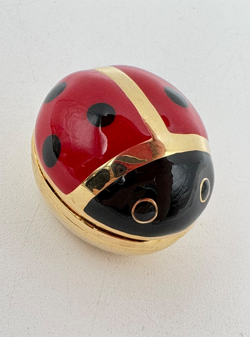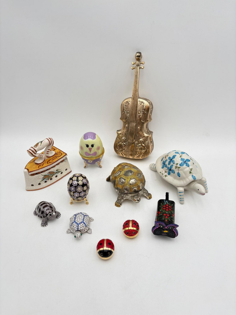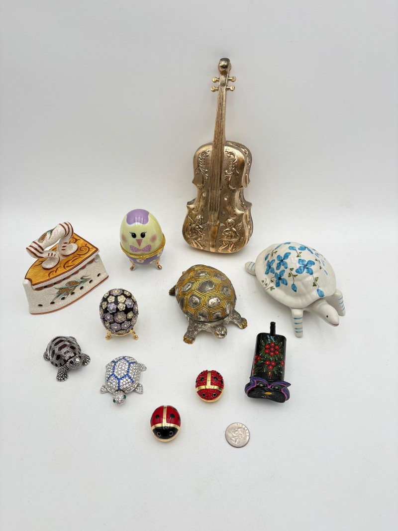 Nice group of trinket boxes in various sizes, materials, and designs. Violin box is a music box, too. Range in size from 9.5" H (violin) to 1.5" L (Ladybugs). See photos from details on maker marks.