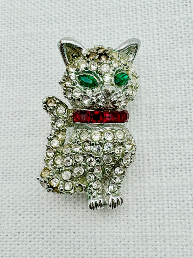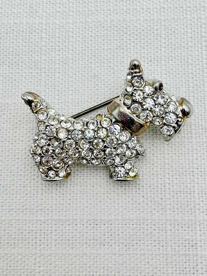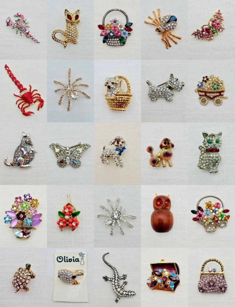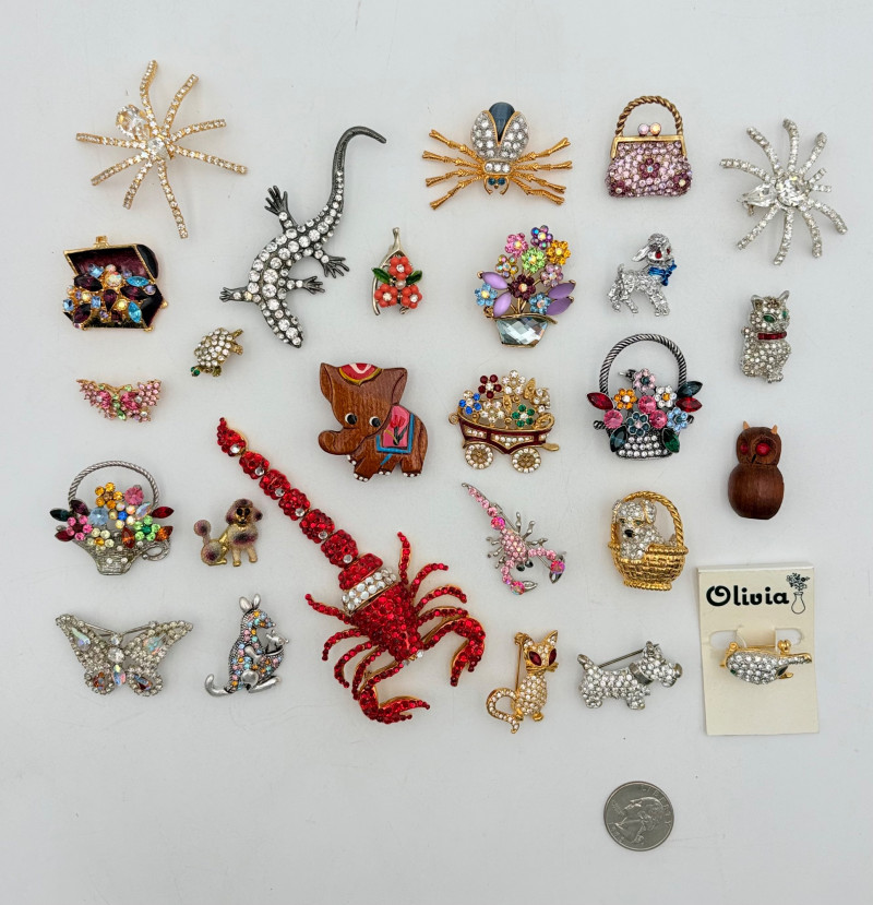 It's true that most of these pins have little in common - there are lizards, flowers, cats, dogs, and much more. However, they all have SPARKLE! Good quality costume jewelry with a number of vintage pieces. Please see photos for details.