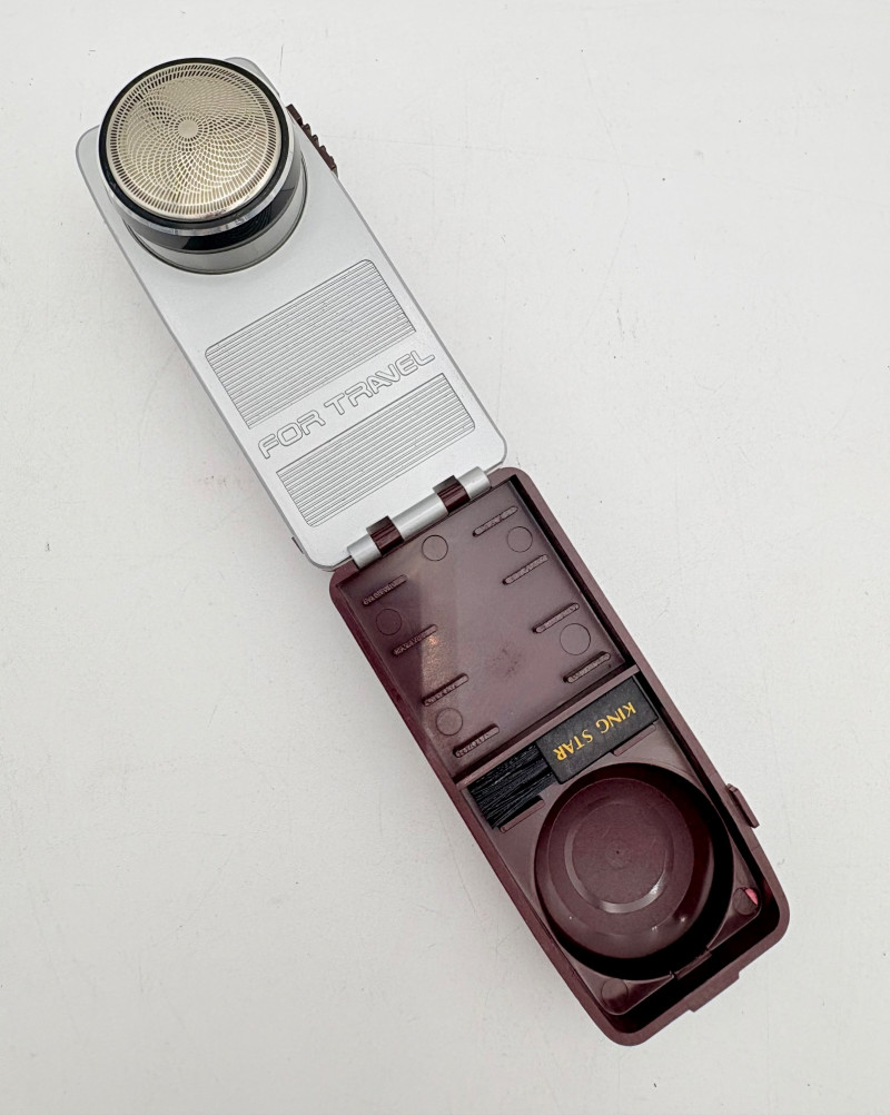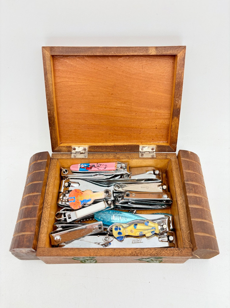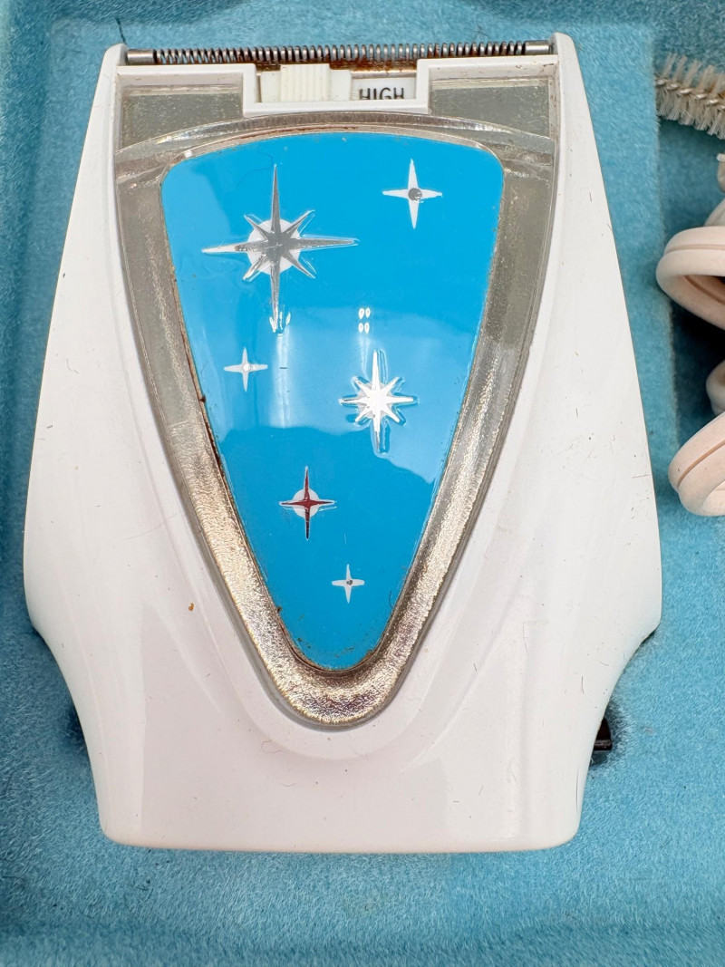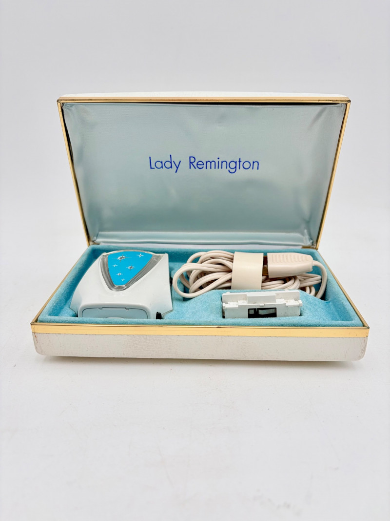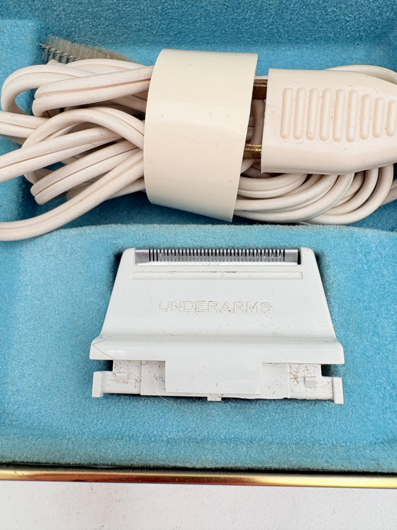 Great group of personal care items that remind us of peeking into our mom's top drawers (and one of our dad's, too!) - Lady Remington "Perfect Shave" electric shaver in original case with cleaning brushes and soft shave accessory. Powers on. - Houbigant "Chantilly" perfume and lotion. - Lancome "Poeme" gift set includes skin sachet, perfume, and bubbling gel. This particular perfume has been imitated but never duplicated and while it has not been officially discontinued, it has been difficult to find for the past 20 or so years. - The smell of the '70s: English Leather cologne - unused from dad's drawer. - King Star portable travel razor. Takes M-420 battery and we didn't have one on hand to test... - Delagar pink hostess set consisting of two flower soaps and hand cream. - Vibra-King vibrator (our mom used a vibrator with lotion on her face - not exactly what it was intended for, but inventive!) Powers on, but the plug is eventually going to need to be replaced - see last photo. - Wooden carved box of nail clippers & clipper/file combos. Stash one in every drawer and your purses so you never have to hunt when you need one (there are some funny ones here, too - dogs, guitars, etc.) Here are some of these items elsewhere: Vintage Chantilly Perfume Liquid Skin Sachet Houbigant Mini Gift Set - Etsy slightly different perfume bottle Vintage Lady Remington Electric Shaver: Collectible Model CL With Case - Etsy Vtg VibraKing massager Model FP One Head only with wear Tested Working 13ft wire | eBay ours is in better shape! Vintage 90’s English Leather 3.4oz 100ml Slash Cologne Made in USA - Etsy - -