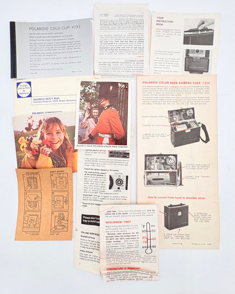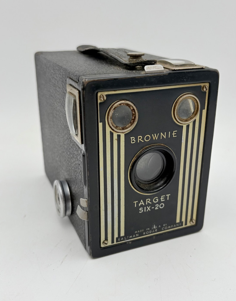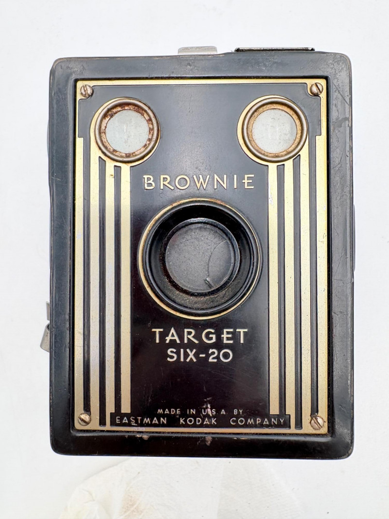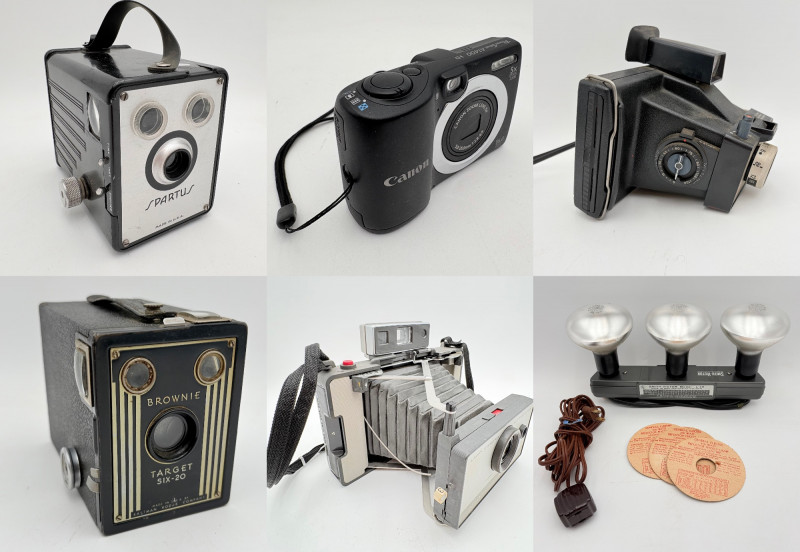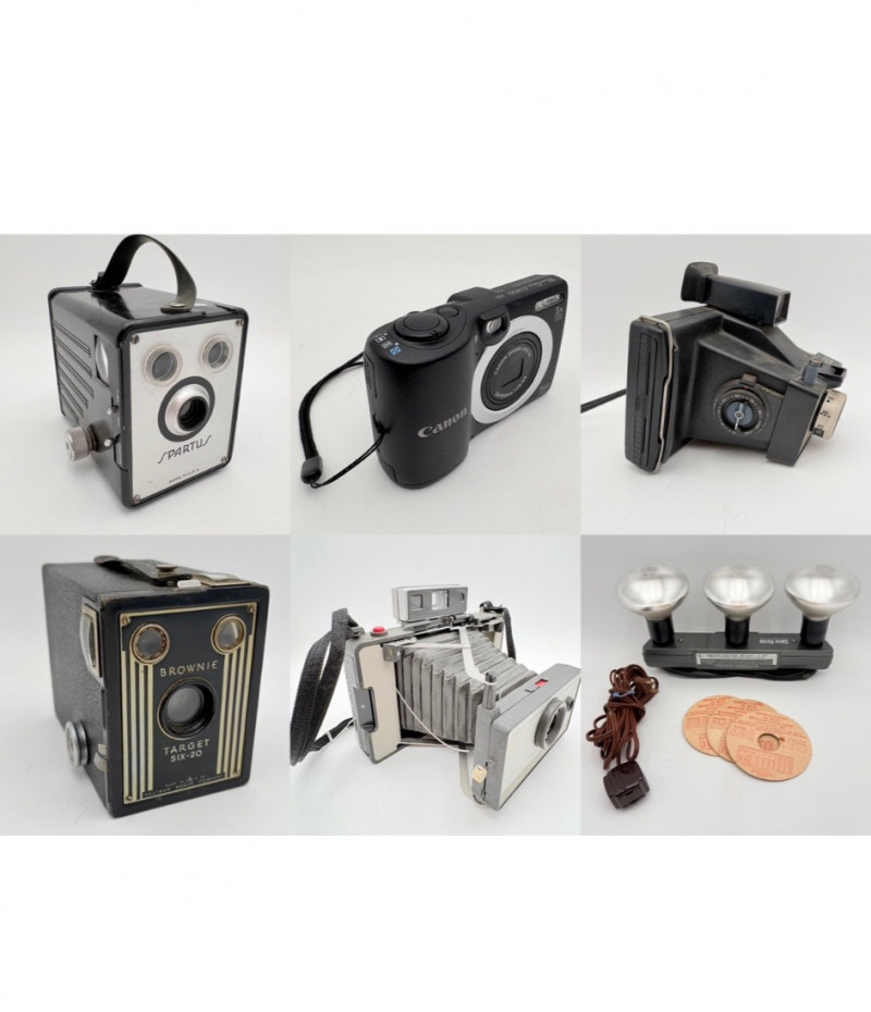Group of cameras & accessories. All are vintage with a couple bordering on antique. Lot includes: Brownie box camera - model Target Six-20. From late 1940s-early 1950s. Spartus camera - uses 120 film. From 1940s. Polaroid Colorpack Land camera - reminds us of family trips as kids. From early 1970s. Polaroid Automatic E-103 Land Camera with case (case is in poor condition) and lots of paper ephemera. Includes instruction booklet. From the mid-1960s. Canon PowerShot A1400 HD digital camera. Smith-Victor movie camera strip lights - Model L-30. Operative with bulbs still good. VERY BRIGHT! Probably from 1950s. Polaroid flash attachment - Model 268 + several flashbulbs. Please note that none of the cameras have been tested. Vintage Brownie Target Six 20 Camera - Etsy Vintage Spartus Box Camera 120 Black & Silver Bakelite Body 1942 With Box | eBay Vintage Polaroid “automatic Land Camera” in Version 103 - Etsy Vintage Polaroid Colorpack Land Camera - Etsy Canon PowerShot A1400 16.0 MP Digital Camera - Black | eBay