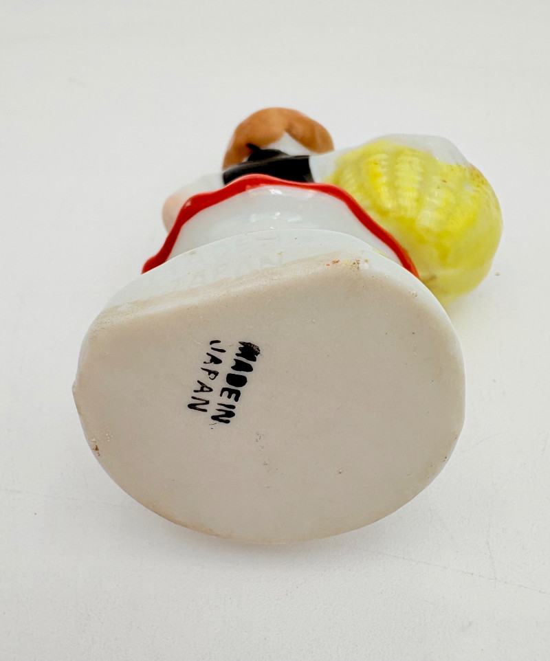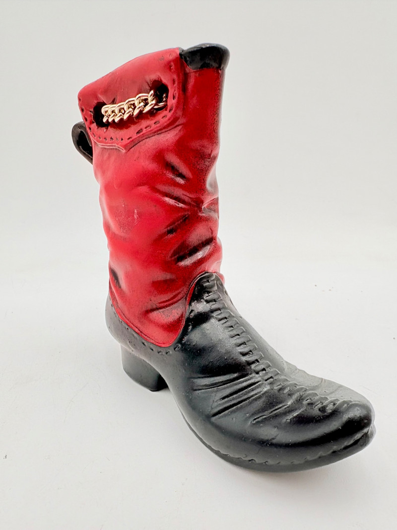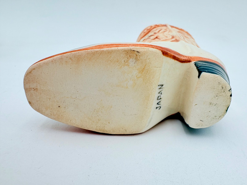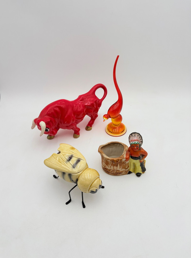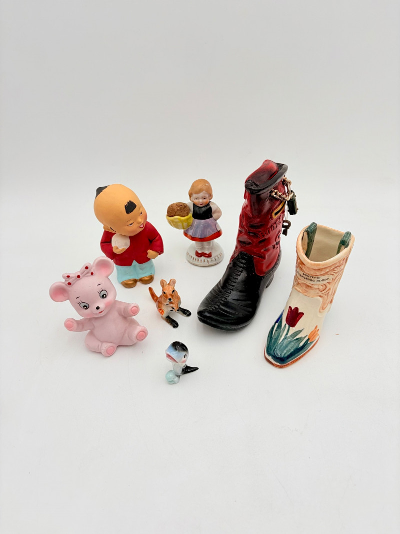 Mixed group of vintage porcelain & glass. Some quite old and unique - we believe the white dancer is from the 1930s and the amberina glass bird is from Viking Glass & glows under UV light. Many are from Japan. Please look closely at pictures - what you see is what you get. Viking Amber Glass Bird Sculpture: Mid-century Modern Figurine, 10 Inch - Etsy offered elsewhere Vintage Ceramic Cowboy Boot Coin Bank 5" Made in Japan | eBay offered elsewhere