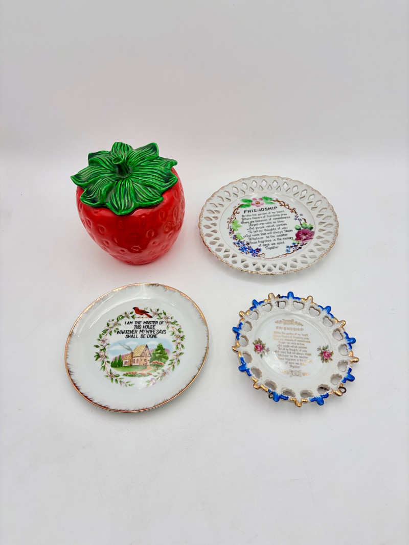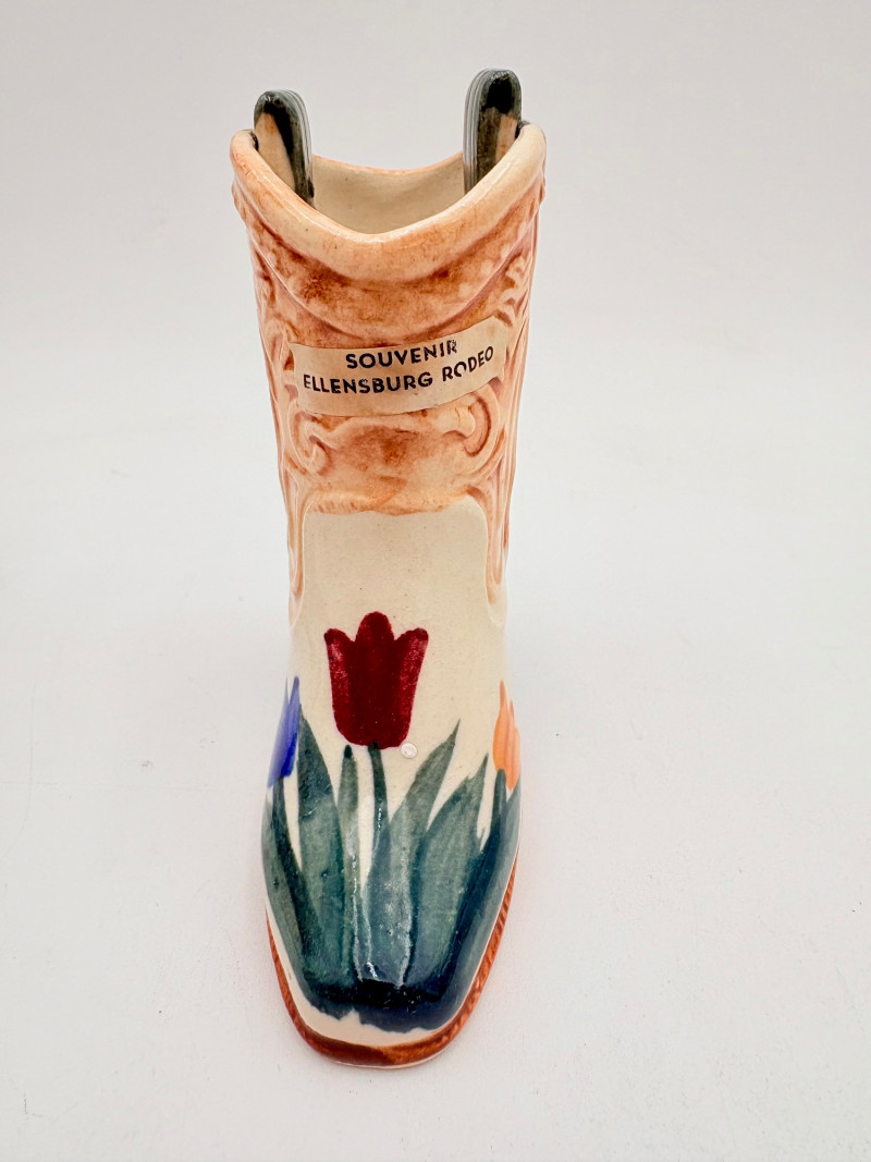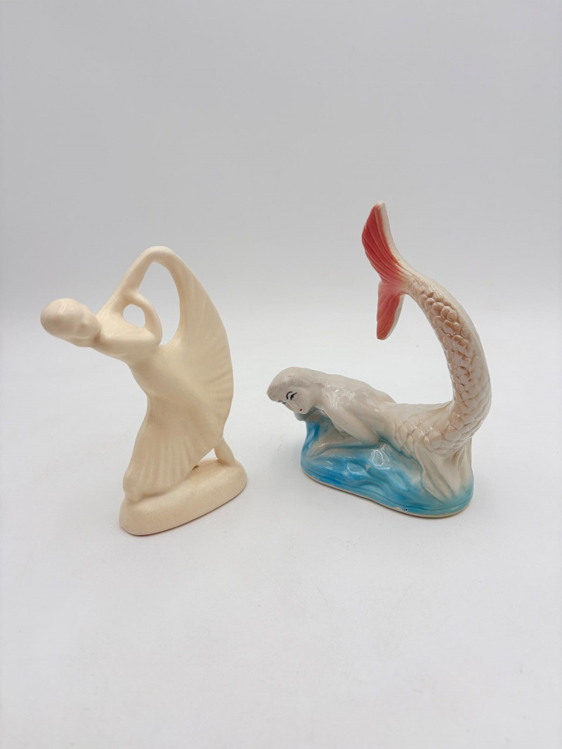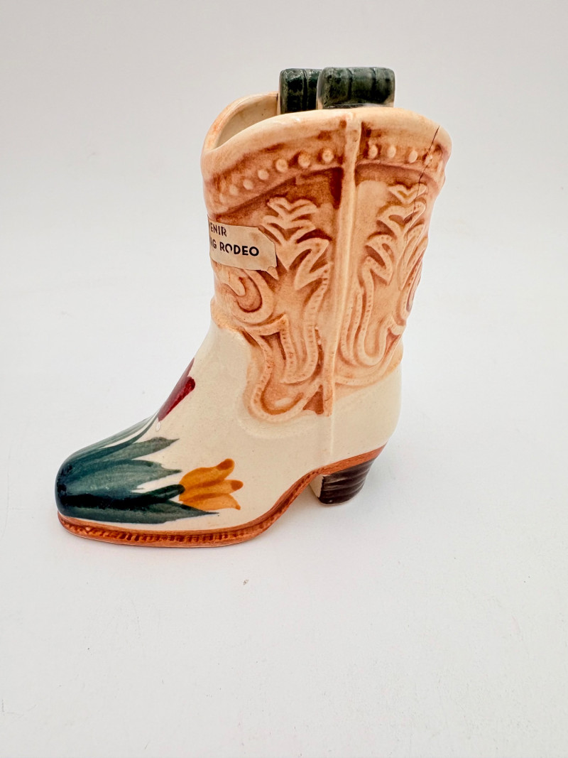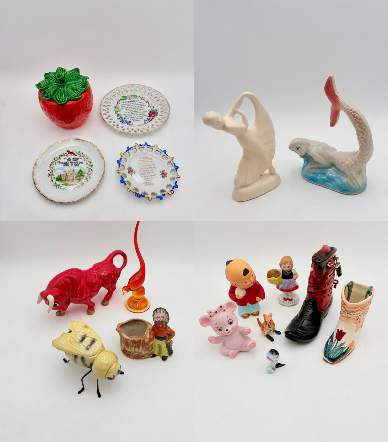 Mixed group of vintage porcelain & glass. Some quite old and unique - we believe the white dancer is from the 1930s and the amberina glass bird is from Viking Glass & glows under UV light. Many are from Japan. Please look closely at pictures - what you see is what you get. Viking Amber Glass Bird Sculpture: Mid-century Modern Figurine, 10 Inch - Etsy offered elsewhere Vintage Ceramic Cowboy Boot Coin Bank 5" Made in Japan | eBay offered elsewhere