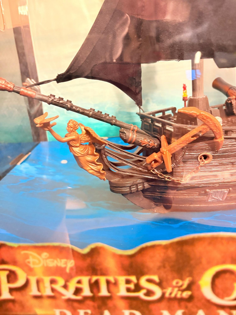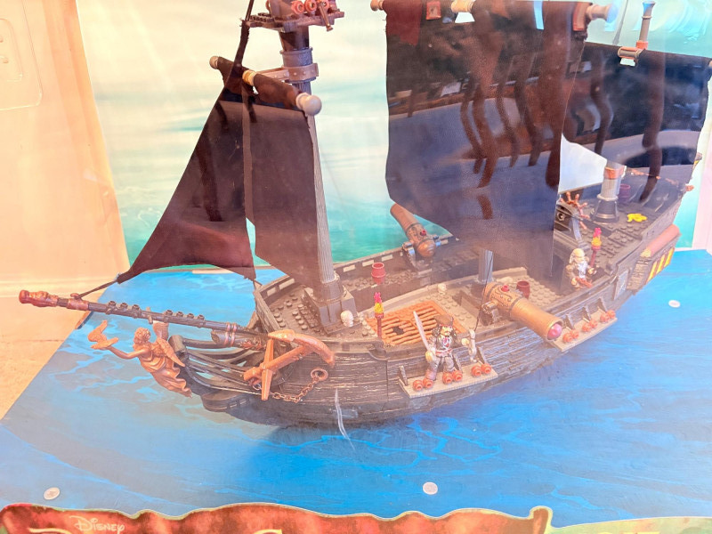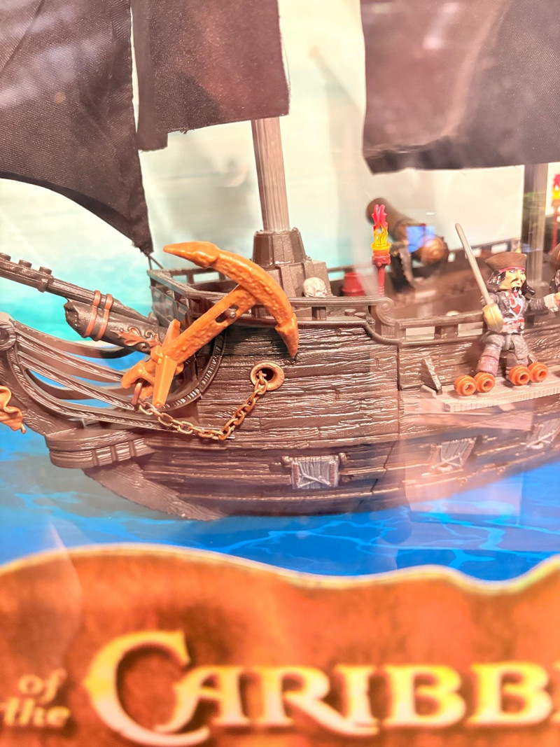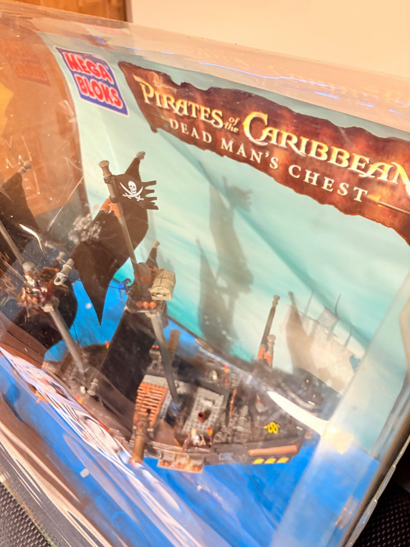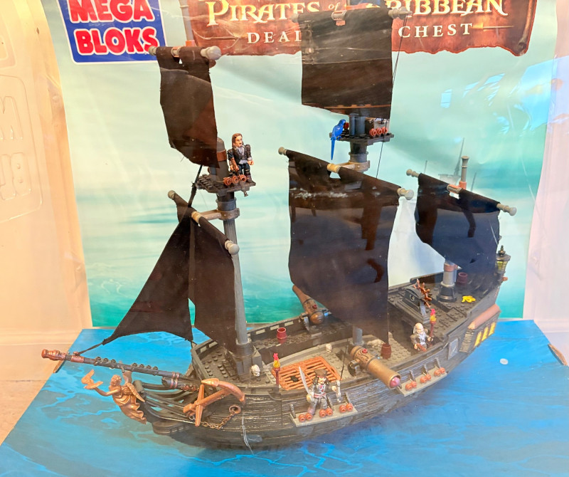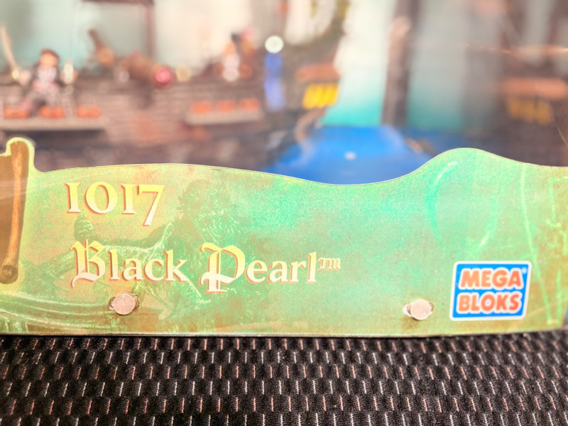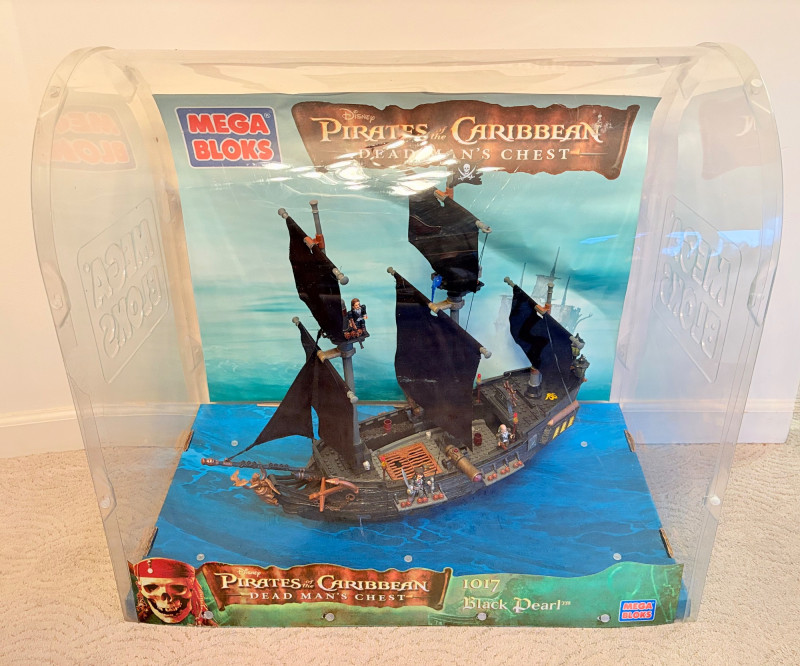 OK, first an apology - we cannot find a similarly packaged Pirates of the Caribbean on-line to refer you to since we know these photos are awful. This Mega Bloks model is packaged in a curved plastic dome that defies being photographed without distortion or reflection. We didn't open it since it appears to be mostly still sealed in the original packaging. The only identifying factors are on the label as Pirates of the Caribbean & #1017 Black Pearl. The ship is anchored to a thick removeable backerboard on the bottom (you can turn it upside down and it stays secure). There are a lot of these models out there, but none in this type of packaging that we could find. The ship is made of lots of removeable small parts (Mega Bloks, obviously), has numerous figures including Jack Sparrow, and measures approx. 24" H x 24" W with the packaging a fair amount larger. Again, while it all looks to be complete, we can't seem to get good photos!