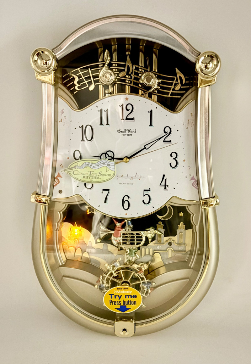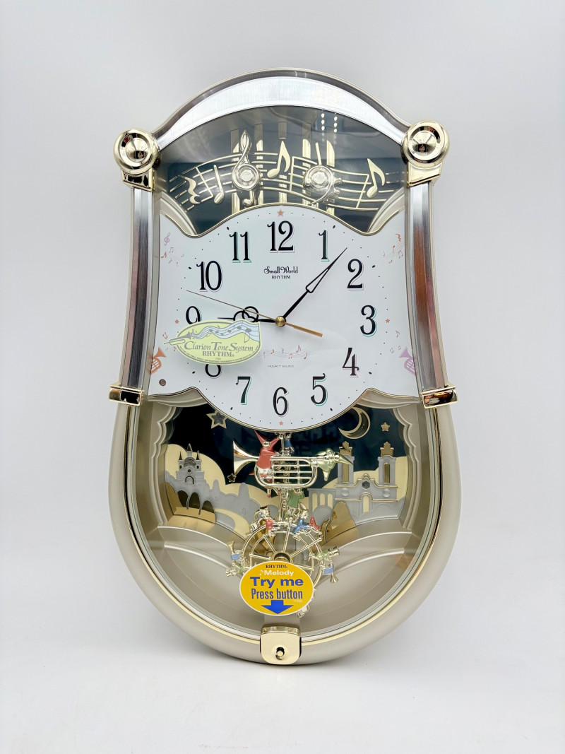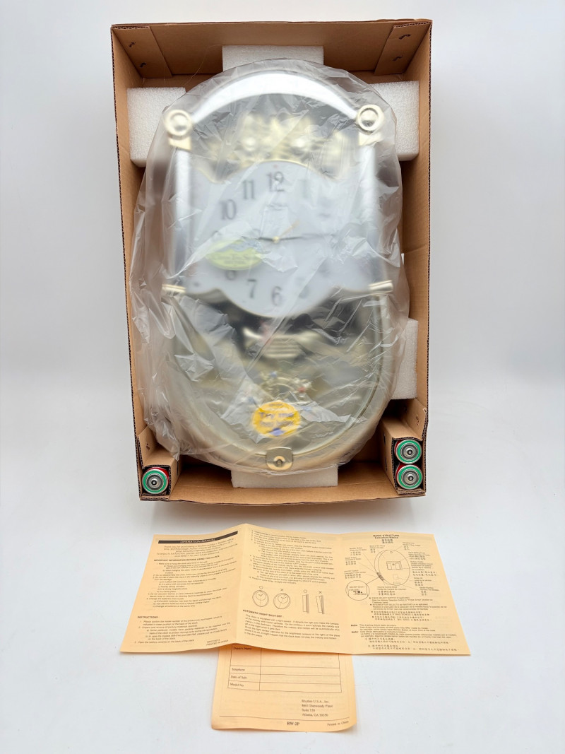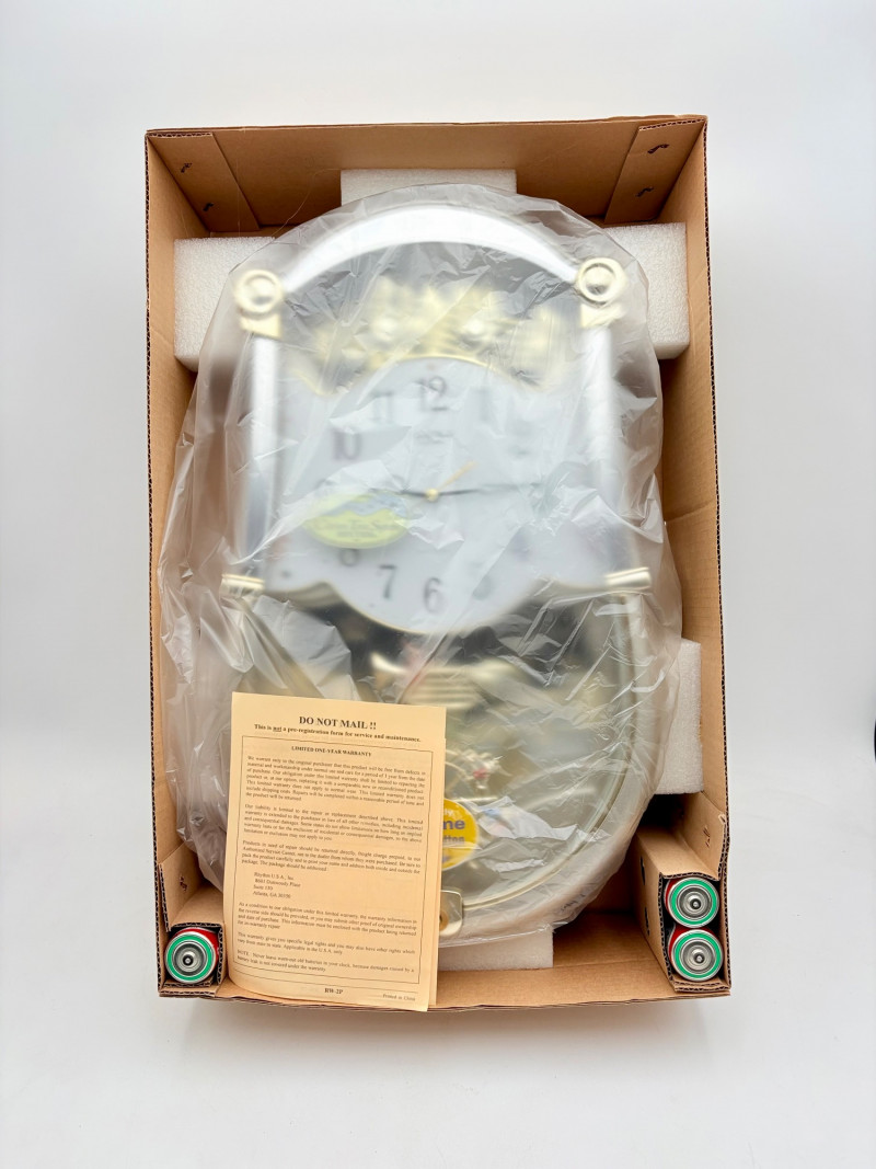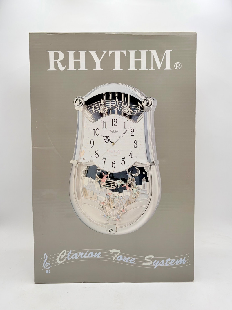 Battery-operated wall clock from Rhythm Watch Company of Japan plays 6 different melodies on the hour and lights up when the music plays (you can turn the music & sound off if preferred). Appears to be new and unused in its original box - instructions, registration, and 6 original "D" batteries are still in the box & never installed (it only takes 3 to run). We tucked a couple of our own batteries in - the hands turned nicely, the wheel at the bottom of the case rotated smoothly and when we pressed the test button, the clock lit up and played a classical tune in what sounded like bells. No flaws noted. Measures 19" H x 11" W. x 4" D. rhythm clarion tone system clock