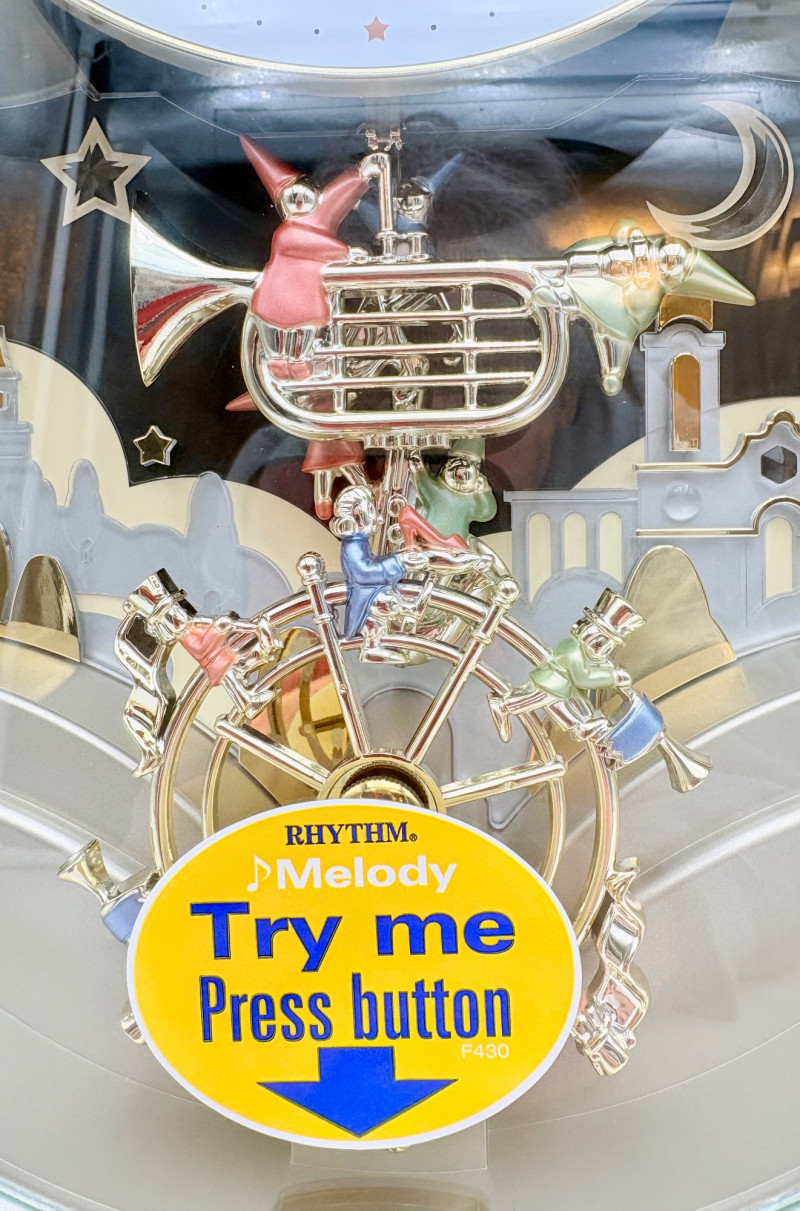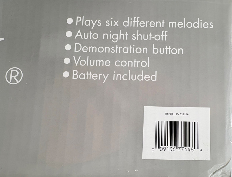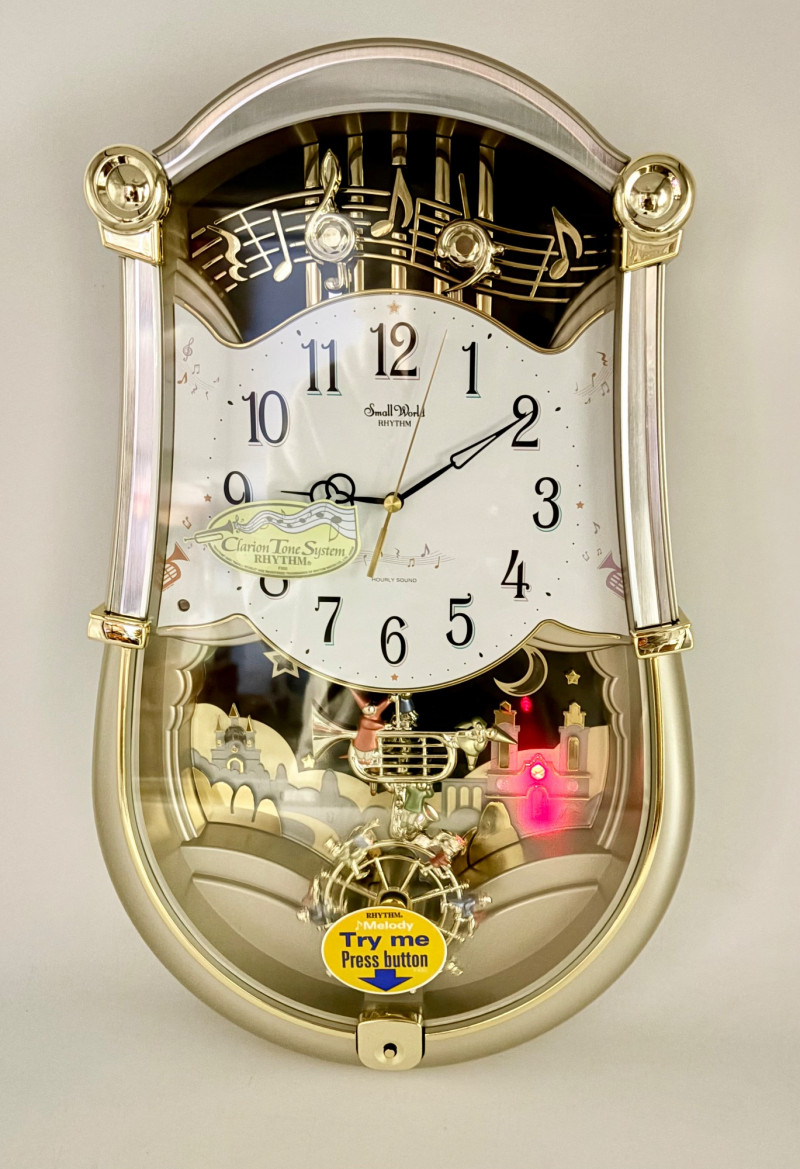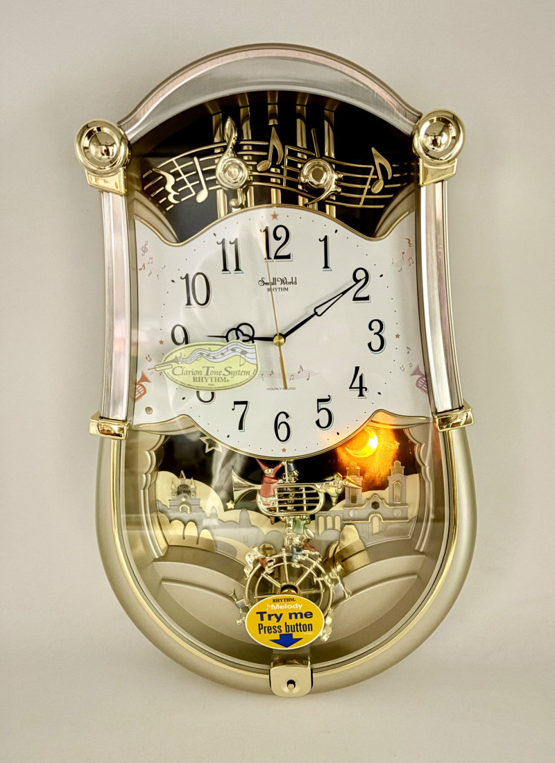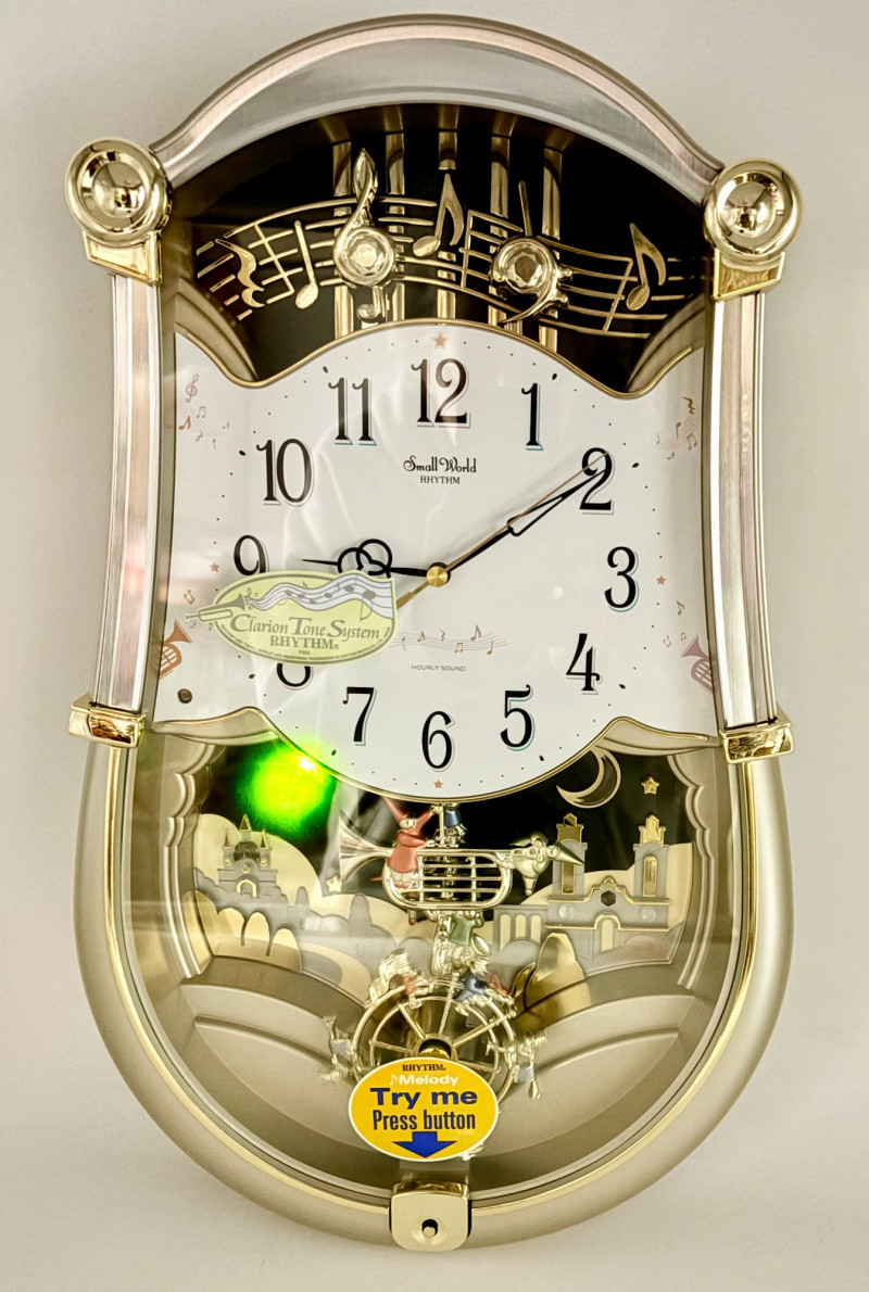 Battery-operated wall clock from Rhythm Watch Company of Japan plays 6 different melodies on the hour and lights up when the music plays (you can turn the music & sound off if preferred). Appears to be new and unused in its original box - instructions, registration, and 6 original "D" batteries are still in the box & never installed (it only takes 3 to run). We tucked a couple of our own batteries in - the hands turned nicely, the wheel at the bottom of the case rotated smoothly and when we pressed the test button, the clock lit up and played a classical tune in what sounded like bells. No flaws noted. Measures 19" H x 11" W. x 4" D. rhythm clarion tone system clock