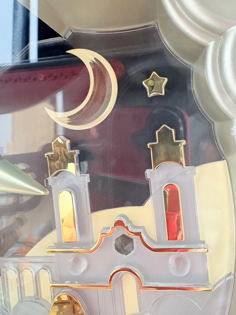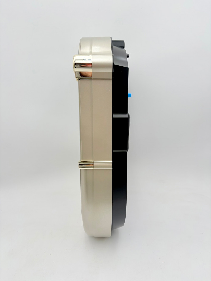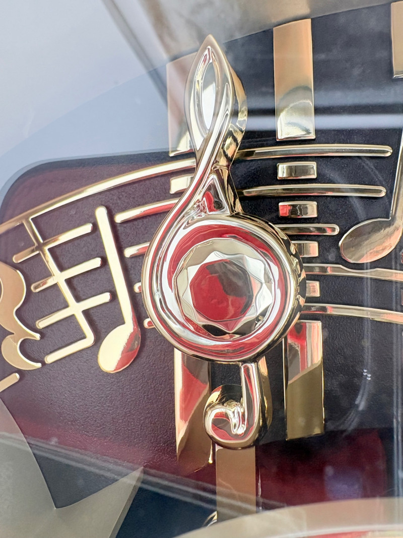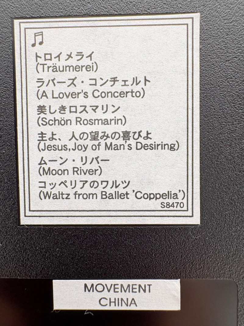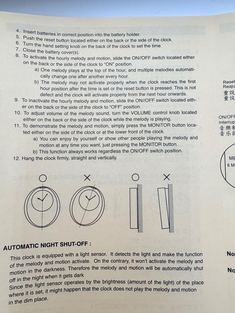 Battery-operated wall clock from Rhythm Watch Company of Japan plays 6 different melodies on the hour and lights up when the music plays (you can turn the music & sound off if preferred). Appears to be new and unused in its original box - instructions, registration, and 6 original "D" batteries are still in the box & never installed (it only takes 3 to run). We tucked a couple of our own batteries in - the hands turned nicely, the wheel at the bottom of the case rotated smoothly and when we pressed the test button, the clock lit up and played a classical tune in what sounded like bells. No flaws noted. Measures 19" H x 11" W. x 4" D. rhythm clarion tone system clock