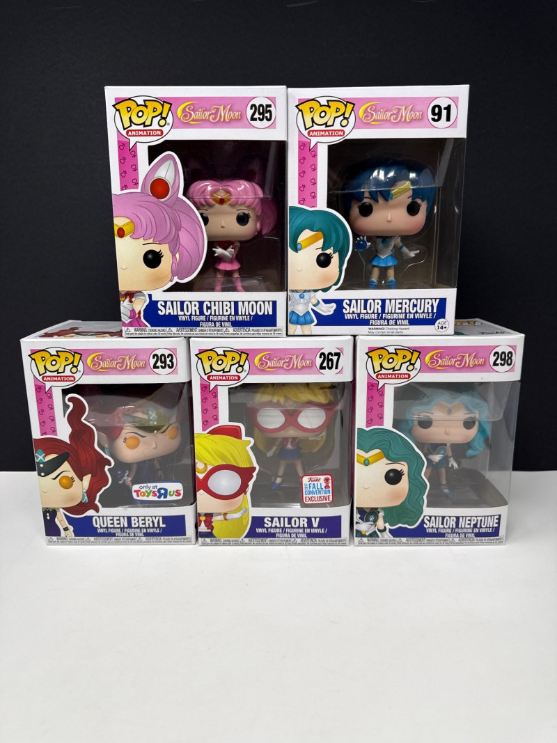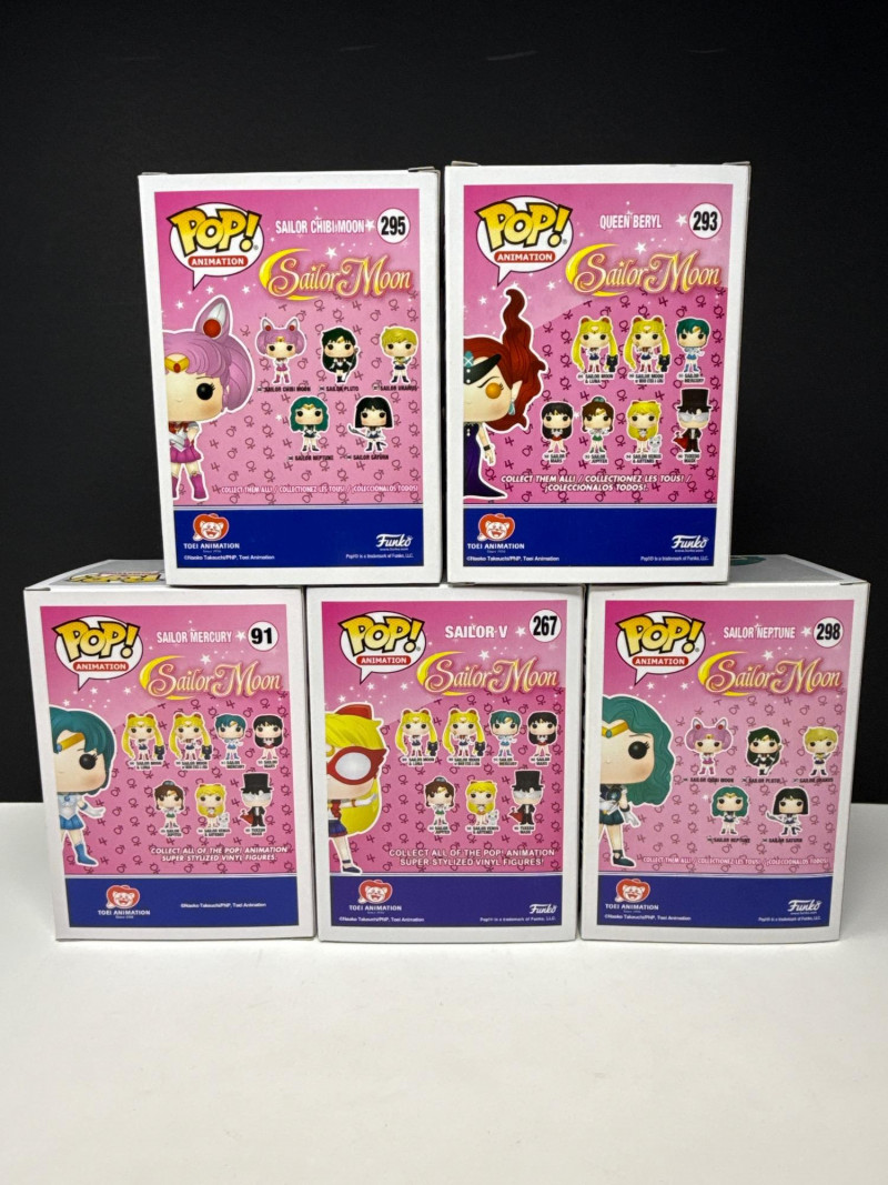 Funko Pop! SAILOR MOON Figurines- #91 Sailor Mercury #267 Sailor V #293 Queen Beryl #295 Sailor Chibi Moon #298 Sailor Neptune All appear to be unopened, new in box