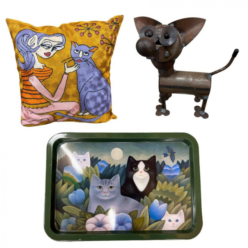 Lot # 125 - Cute Cat Decor Lot- Pillow, Metal Sculpture & Tray