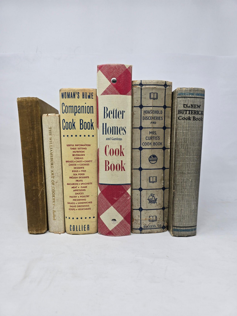A curated set of six vintage cookbooks showcasing American culinary traditions from the early 20th century through the mid-century modern era. These volumes offer rich historical insight into domestic life, cooking practices, and regional foodways, making them ideal for collectors, decorators, or culinary historians. Included Titles: The Williamsburg Art of Cookery– Colonial revival edition inspired by 18th-century Virginia traditions. Decorative spine, excellent for display. Woman’s Home Companion Cook Book– Comprehensive mid-century guide with indexed sections covering table settings, nutrition, meats, desserts, and more. Published by Collier. Better Homes and Gardens Cook Book– Classic red-and-white edition, a staple in American kitchens. Household Discoveries and Mrs. Curtiss Cook Book– Turn-of-the-century domestic encyclopedia. Published by Success Co. The New Butterick Cook Book– Early 20th-century volume from the Butterick Publishing Company, blending fashion and food. Culinary Echoes From Dixie– Southern regional cookbook featuring traditional recipes and cultural notes from the American South. Condition Report:All volumes are in very good vintage condition. Spines intact, covers show light shelf wear consistent with age. Pages are clean and legible, with no loose bindings. Some volumes may contain period-appropriate marginalia or handwritten notes. Display Notes:This set presents beautifully on open shelving or in a kitchen vignette. The varied spine designs and historical content offer both aesthetic and educational value.