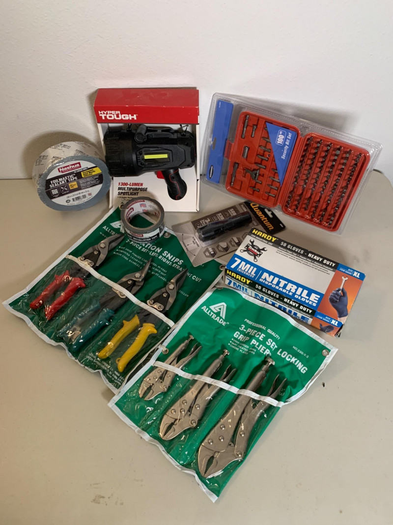 A practical, ready-to-use assortment of tools and accessories ideal for DIY enthusiasts, mechanics, or home improvement professionals. This curated lot includes lighting, gripping, fastening, sealing, and protective gear—all in excellent, unused or lightly handled condition. Included Items: Hyper Tough 1300-Lumen Multipurpose Spotlight – New in sealed packaging; ideal for garage, job site, or emergency use. Quantum LED Flashlight or Tool – Compact, high-output light in original packaging. Alltrade Professional Locking Grip Pliers (2 Sets) – Each set includes 3 pliers with color-coded handles (red, black, yellow, green); heavy-duty construction; sealed packaging. 100 pc Screwdriver Bit Set – Wide variety of bits in red/clear case; unused. Hardy 7 Mil Nitrile Gloves (XL) – Heavy-duty, chemical-resistant gloves; sealed pack. Nashua Foilmastic Sealant Tape – Industrial-grade foil tape roll; unused. Additional Tape Roll – Possibly duct tape; appears unused. Condition Notes: