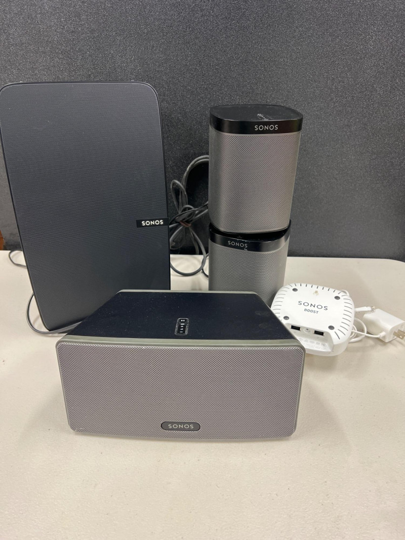 Premium Sonos S100 Play:5 speaker system, engineered for rich, room‑filling sound with wireless convenience. Performance: Delivers deep bass, clear highs, and balanced mids for immersive listening. Utility: Ideal for streaming music, podcasts, or integrating into a Sonos multi‑room audio setup. Connectivity: Wi‑Fi enabled with app control, compatible with major streaming services. Design: Sleek, modern aesthetic that blends seamlessly into home or office environments. Large size: 14.25” L x 6” d x 5” h Medium: 10.5 w x 6.25 d x 5.25 h Small: 8.5” h x 4.25” x 4.25” (Qty: 2)