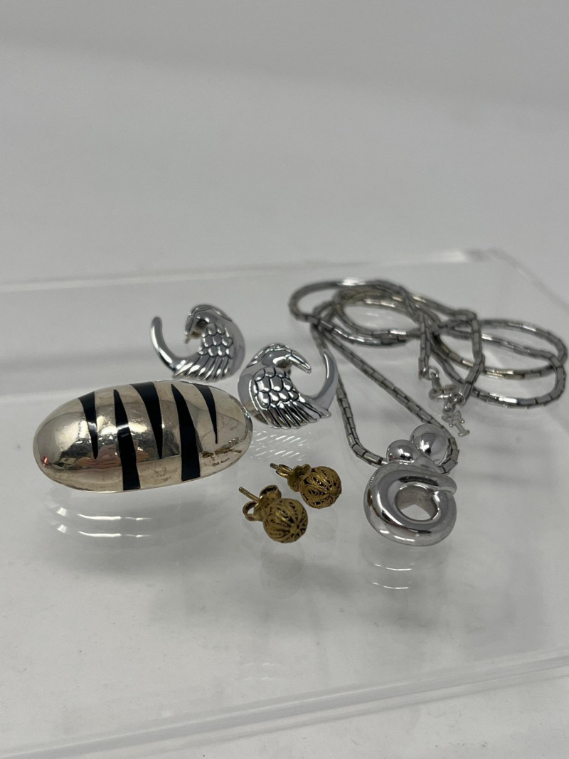 Lot # 11 - GMH 925 Brooch, Birth Pendant, Myna Bird Earrings & Filigree Studs