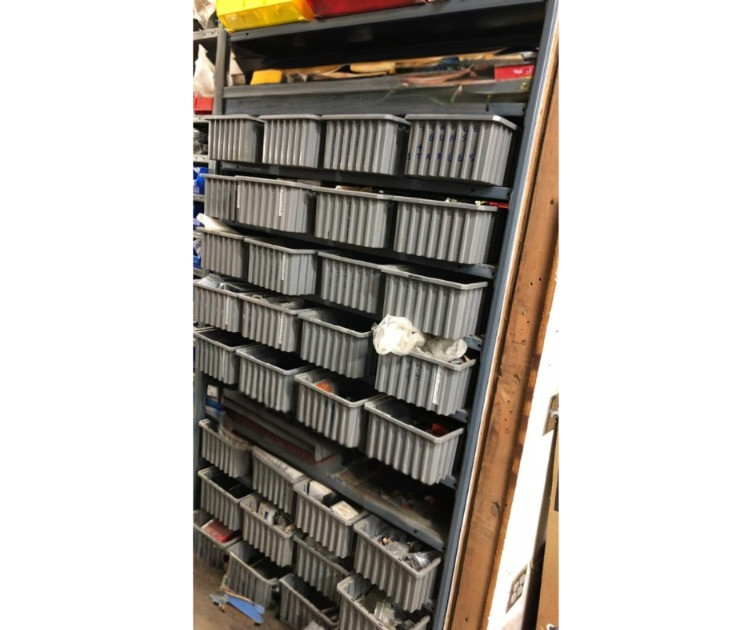 Industrial metal organization unit with 11 shelves, 12" depth. Durable contractor storage solution for tools and hardware. Shelving Unit Only. Does not include plastic bins with hardware. Hardware is available in picker sale post auction. Special Note: Unit appears to be assembled with interlocking rails and supports. Wood shelves. Buyer dissassembles unit or brings vehicle that can transport unit as is. Located at parking lot level and near large bay door of shop structure. Preference is for buyer to arrange for pickup early on first day of pickups or later on last day of pickups.
