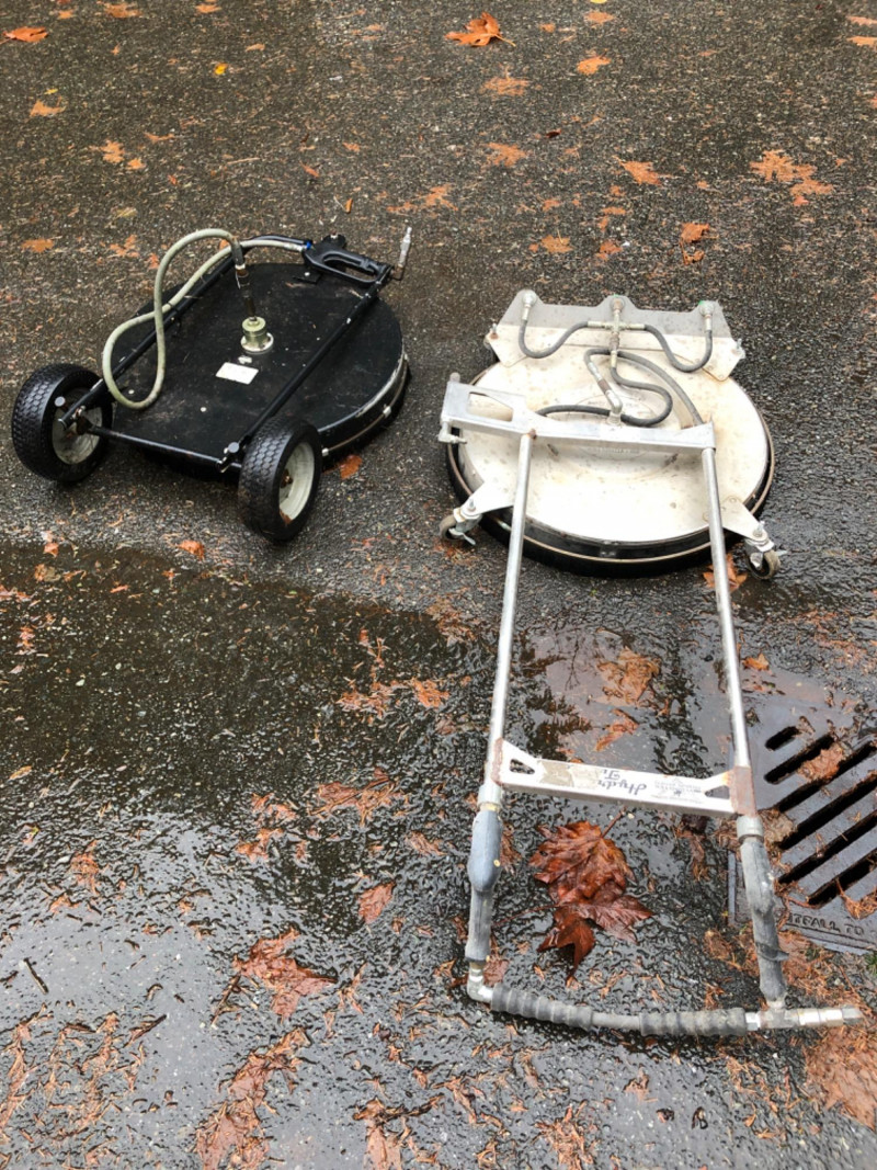Pair of large pressure washer deck scrubbers, each with a 27‑inch radius cleaning area. Designed for contractor and industrial use, these scrubbers provide efficient, wide‑coverage cleaning for decks, patios, driveways, and shop floors. Durable construction ensures reliable performance under heavy use. Ideal for contractors, facilities maintenance, and large‑scale cleaning projects requiring speed and consistency. At retail these decks typically cost $300 - $500 each.