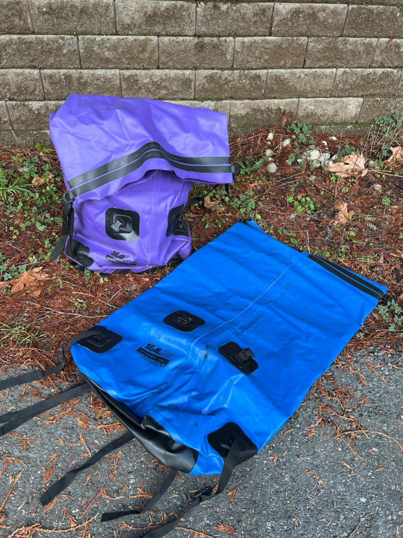 Pair of SealLine waterproof duffel bags (115), built for durability and protection in demanding outdoor conditions. Design: Heavy‑duty vinyl construction with welded seams to keep contents dry. Utility: Ideal for camping, boating, rafting, or contractor gear transport where water resistance is essential. Features: Roll‑top closure with secure straps; reinforced handles for easy carrying. Condition: Both bags included; sold as‑is.