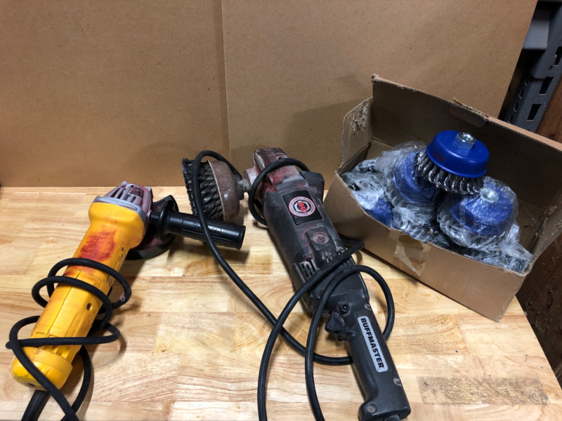 Two professional‑grade contractor tools: DeWalt DWE402 Angle Grinder – 4‑1/2" (11 Amp) model, designed for heavy‑duty grinding and cutting. Features DeWalt’s Dust Ejection System™ for durability and extended tool life. Black & Decker Buffmaster 6138 Polisher – 7"/9" electronic sander/polisher, built for precision buffing and polishing applications. Known for its rugged design and reliable performance. Accessories: Eight new cup wire brushes included, expanding utility for surface prep and cleaning tasks. Both tools power on and are suitable for contractor, mechanic, or shop projects requiring grinding, polishing, or finishing.