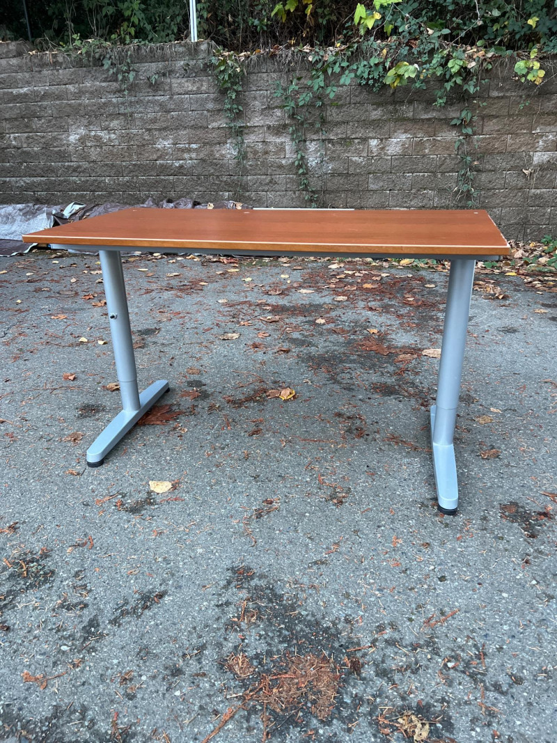 Modern Herman Miller style desk with adjustable wood top, designed for both function and aesthetic appeal. Dimensions: 47.25" L × 28" W × 23‑5/8" H. Design: Sleek wood top paired with a sturdy adjustable frame for ergonomic comfort. Utility: Ideal for home office, studio, or professional workspace. Features: Adjustable height for customized use; durable construction with clean, minimalist styling. Condition: Solid and functional; note three filled holes in desktop, sold as‑is.