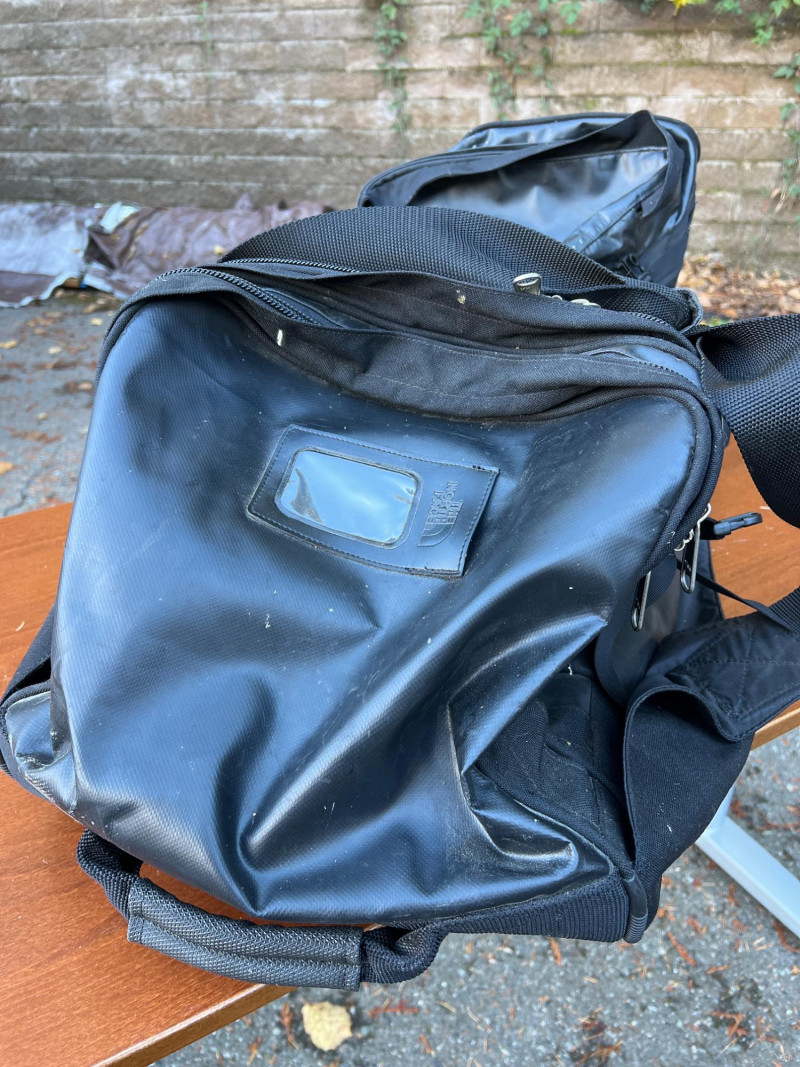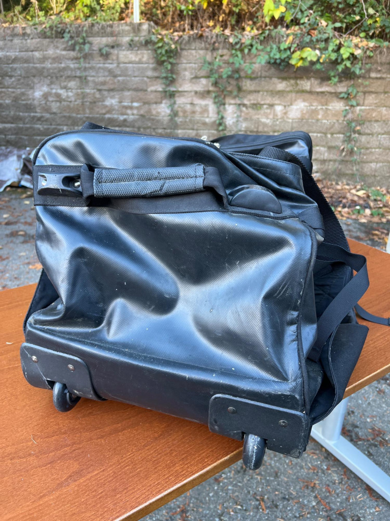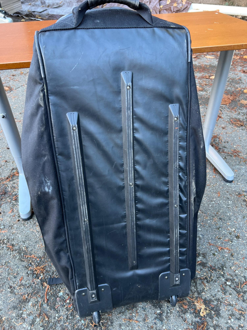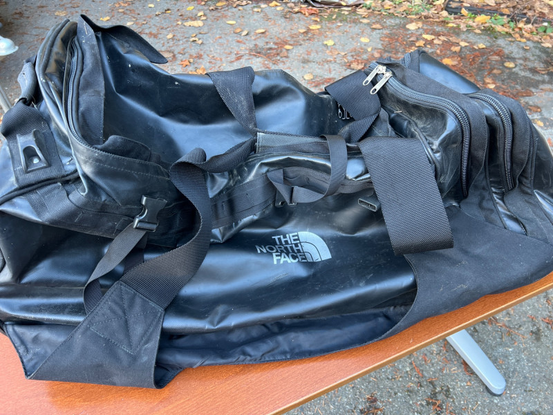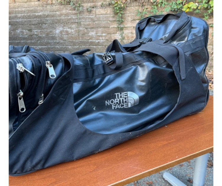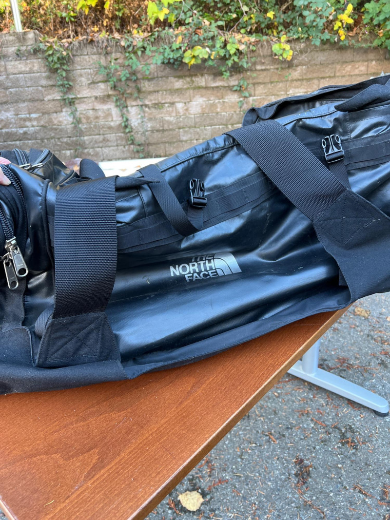 Spacious North Face rolling duffel bag, built for durability and convenience in travel or outdoor use. Dimensions: 35" L × 14" W × 16" H. Exterior covering shows a few minor surface tears, none affecting the interior. Design: Rugged construction with reinforced seams and heavy‑duty zippers. Features: Smooth‑rolling wheels for easy transport. Telescoping handle and side carry handles. Large main compartment with internal organization. Utility: Perfect for camping trips, extended travel, or contractor gear transport.