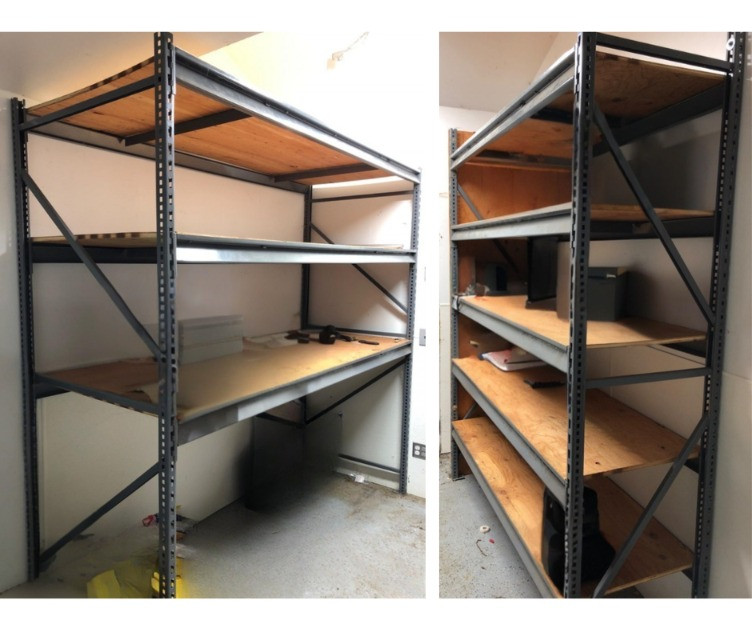Two Husky style industrial shelving units, built for heavy‑duty contractor and shop organization. Unit 1 Dimensions: 8’ height × 102” length × 36” depth Unit 2 Dimensions: 8’ height × 77” length × 24” depth Both units feature rugged steel construction and adjustable shelves, ideal for storing tools, materials, and industrial supplies. Designed for durability and high‑capacity storage, these shelves are perfect for contractors, mechanics, and shop organization. Special Note: Unit appears to be assembled with interlocking rails and supports. Wood shelves. Buyer dissassembles unit or brings vehicle that can transport unit as is. Located at parking lot level and near door leading directly to parking lot.