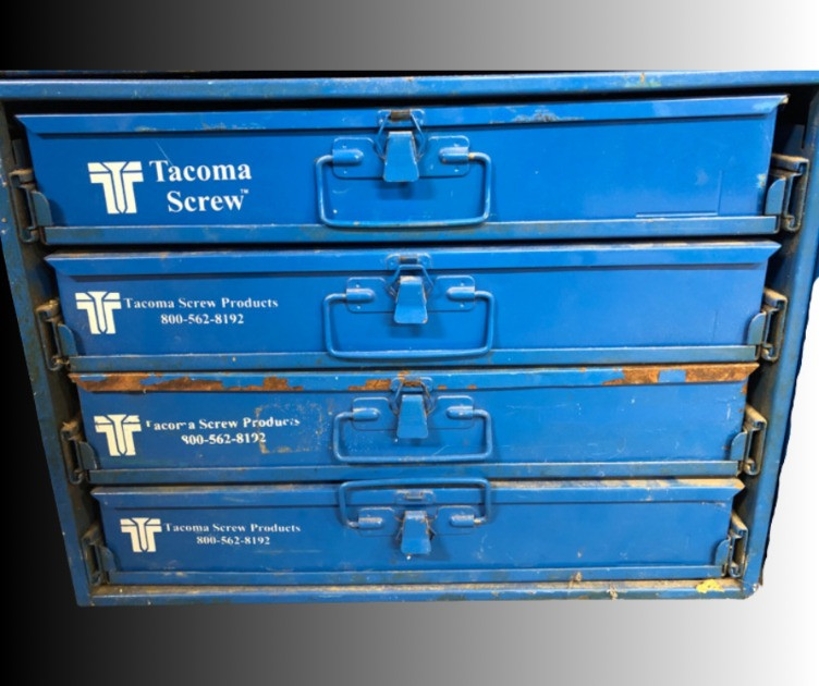Tacoma Screw organizer cabinet #2 with four individually covered, and easily removable, drawers fully stocked with assorted contractor hardware, including nuts, bolts, and screws. Heavy‑duty cabinet construction built for shop, garage, or industrial use. Provides organized storage and easy access to essential components, making it a practical addition for contractors, mechanics, or DIY projects.