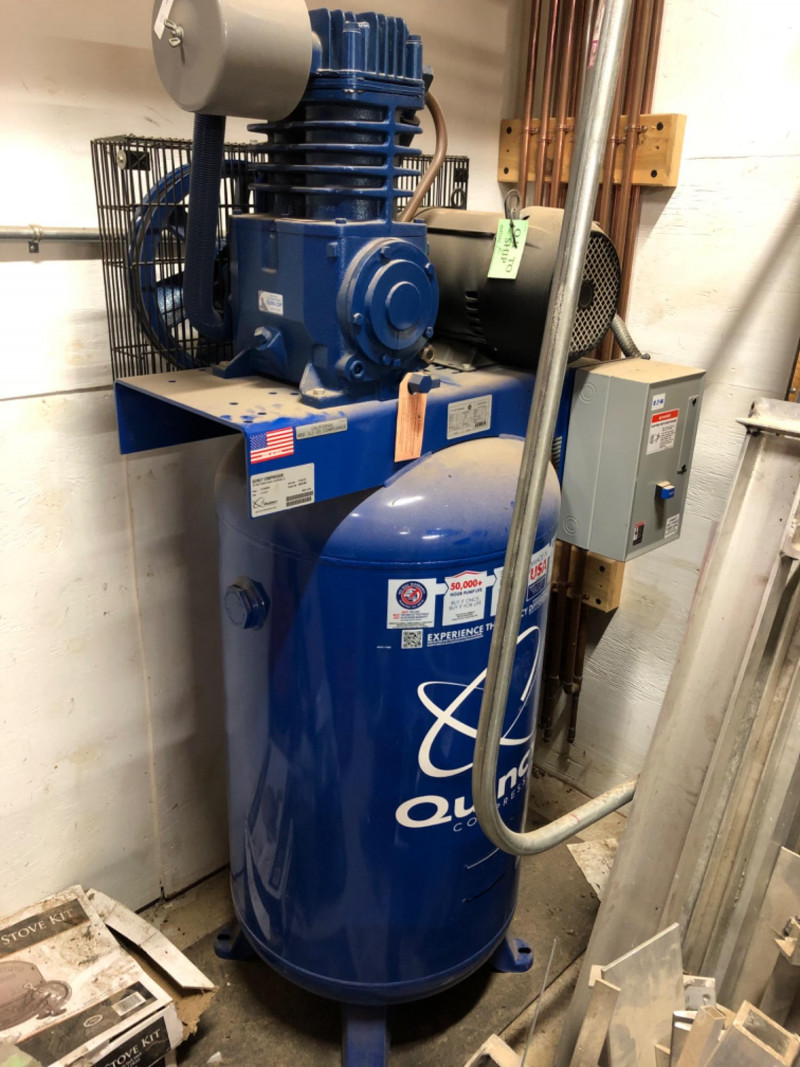 Quincy Model 271CS80VCB QT‑7.5 air compressor, a professional‑grade 7.5 horsepower, 80‑gallon vertical tank, two‑stage unit. Built for heavy‑duty contractor and industrial applications, this compressor delivers 23 CFM at 175 PSI with a 100% duty cycle. Features include: Splash‑lubricated, cast‑iron pump for durability and dependability High‑efficiency finned intercooler to reduce air temperature and improve performance 1725 RPM industrial motor for continuous operation ASME‑coded tank and safety valves for compliance and reliability Extra oil capacity for cooler running and extended pump life (50,000+ hours) Proudly built in the U.S.A. with a generous factory warranty Ideal for shops, contractors, and industrial environments requiring consistent, high‑capacity compressed air.