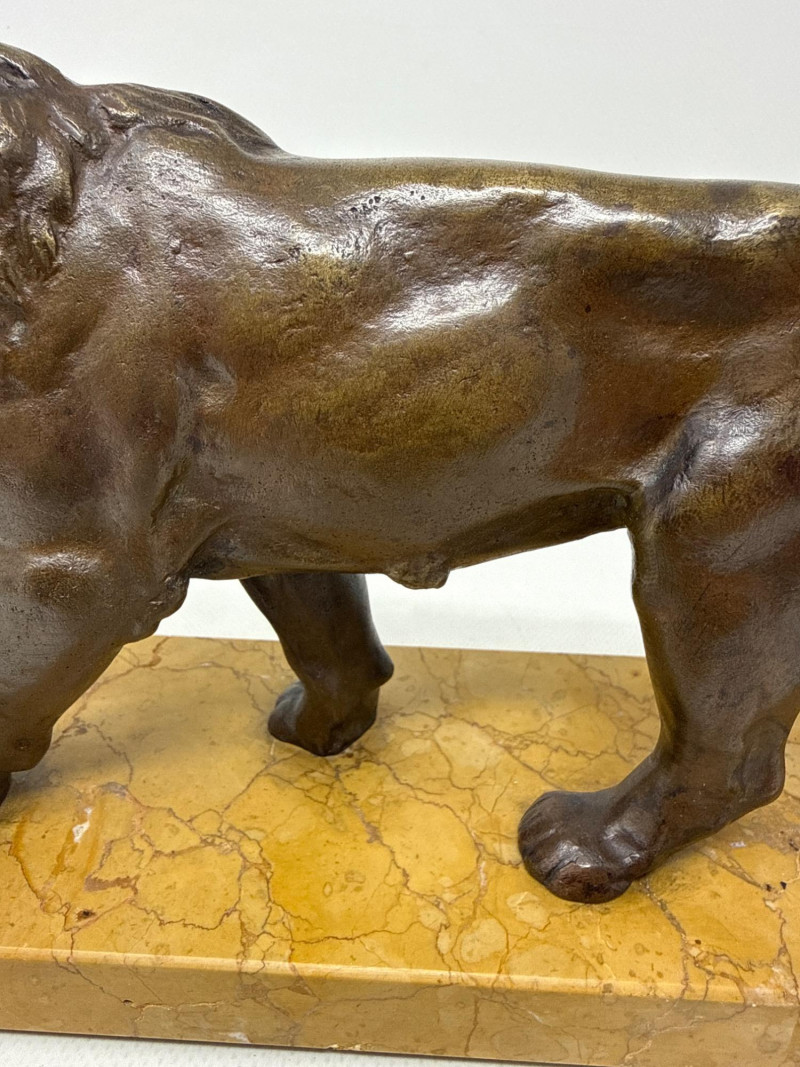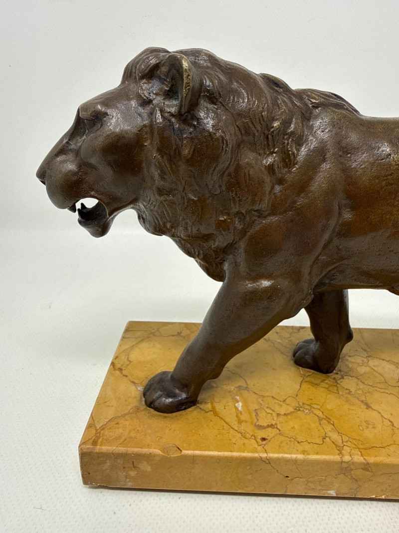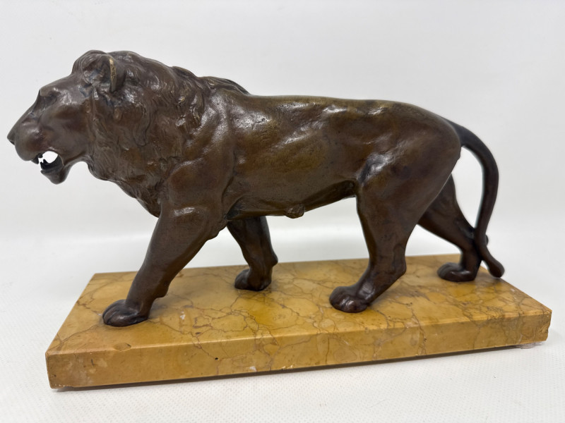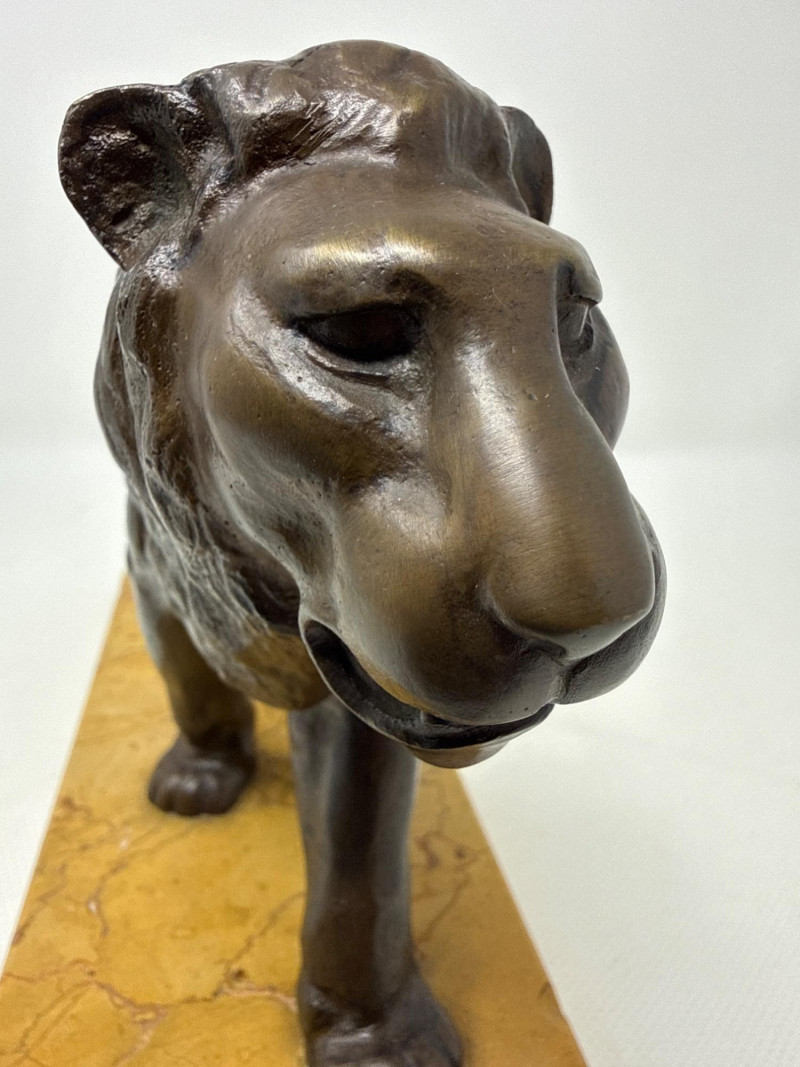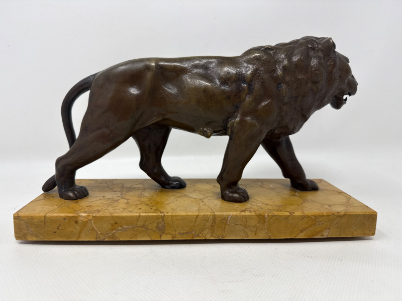 Artist: Alfred Thiele signed sculpture. Subject: A bronze lion sculpture mounted on a rectangular marble base. Materials: Dark bronze figure; light, veined marble base. 19 cent bronze Pose: The lion is captured mid‑walk with one paw forward and its mouth slightly open. Details: A full, textured mane and well‑defined musculature emphasize strength and majesty. Visual contrast: The deep bronze finish contrasts with the pale, veined marble, highlighting the sculpture’s form and craftsmanship. Very heavy. Has a minor chip on base.