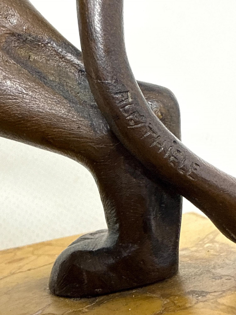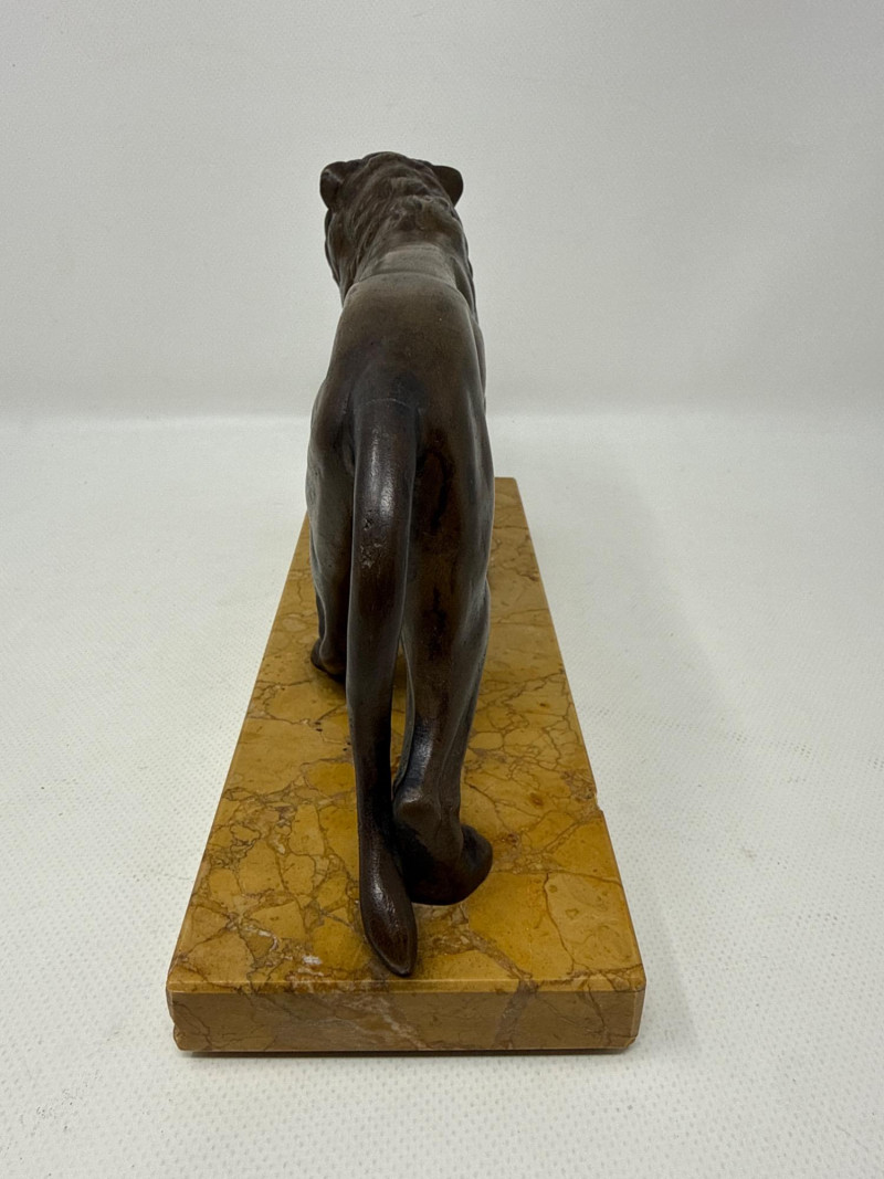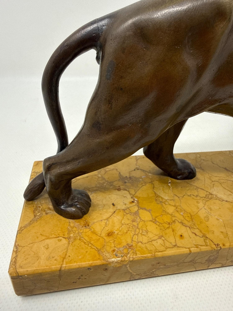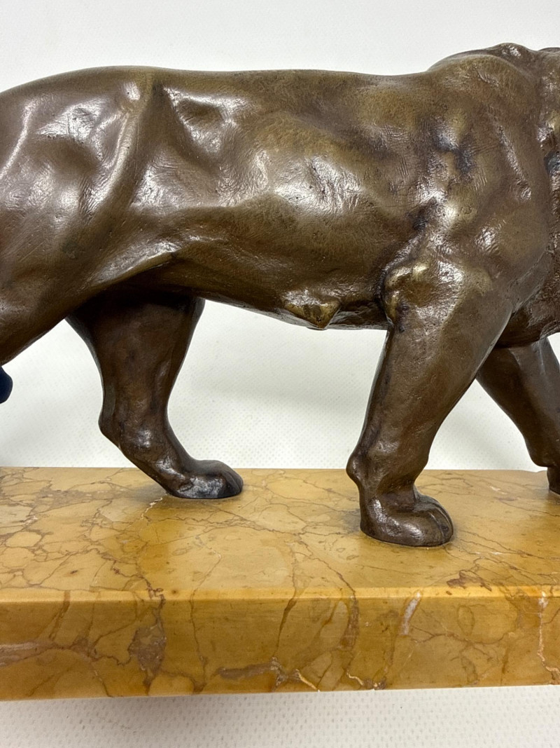Artist: Alfred Thiele signed sculpture. Subject: A bronze lion sculpture mounted on a rectangular marble base. Materials: Dark bronze figure; light, veined marble base. 19 cent bronze Pose: The lion is captured mid‑walk with one paw forward and its mouth slightly open. Details: A full, textured mane and well‑defined musculature emphasize strength and majesty. Visual contrast: The deep bronze finish contrasts with the pale, veined marble, highlighting the sculpture’s form and craftsmanship. Very heavy. Has a minor chip on base.