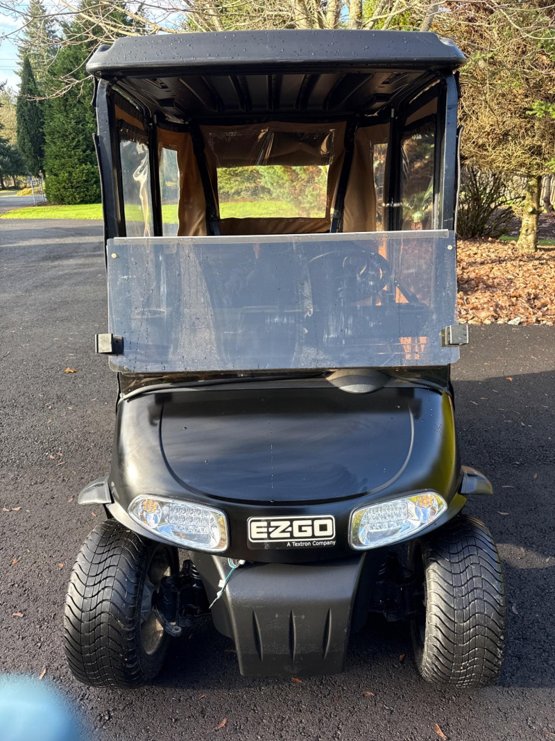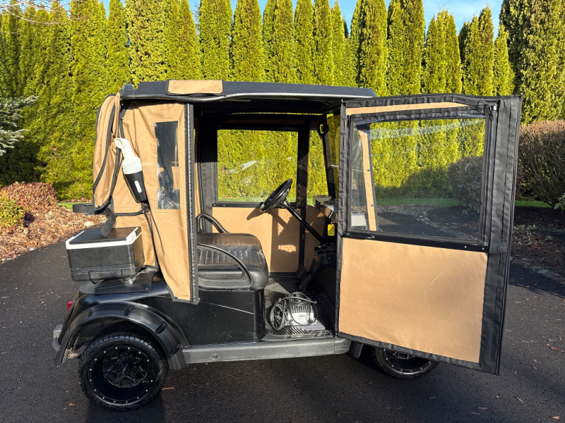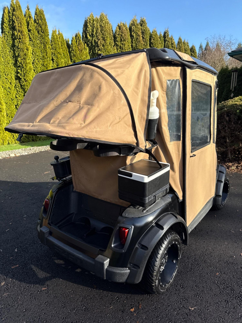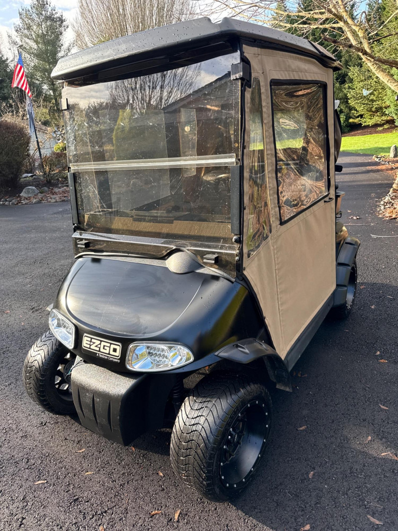 Subject: A black EZGO golf cart fitted with a tan canvas enclosure that has clear plastic windows on the front and sides. Details: The cart features large, rugged tires and visible exterior trim. The removable enclosure covers the passenger area and provides weather protection while maintaining visibility through the clear panels. Accessories Included: