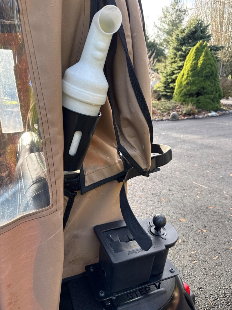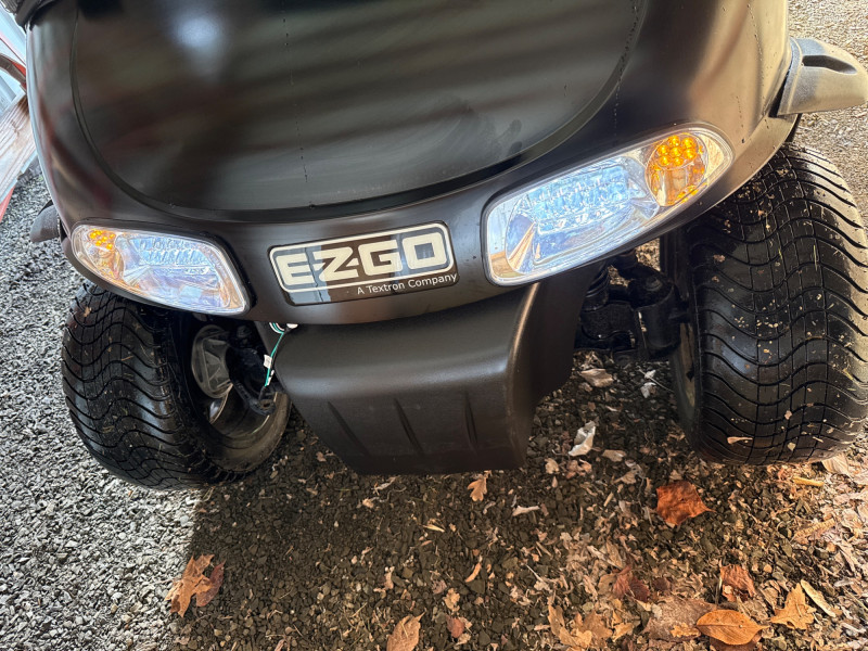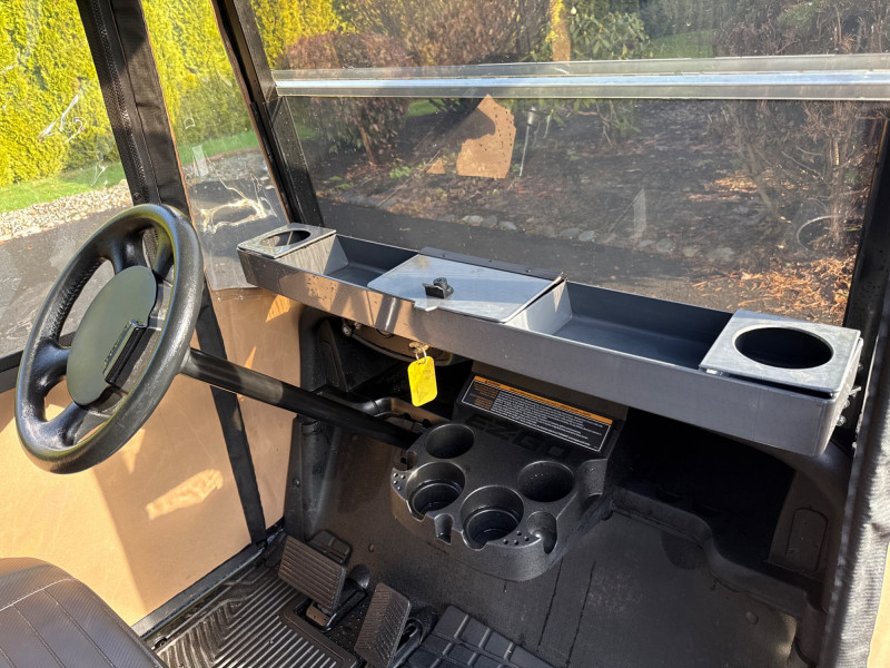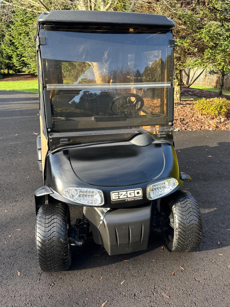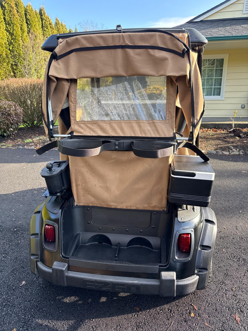 Subject: A black EZGO golf cart fitted with a tan canvas enclosure that has clear plastic windows on the front and sides. Details: The cart features large, rugged tires and visible exterior trim. The removable enclosure covers the passenger area and provides weather protection while maintaining visibility through the clear panels. Accessories Included: