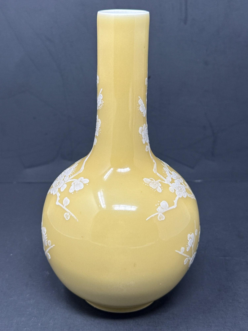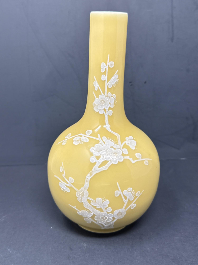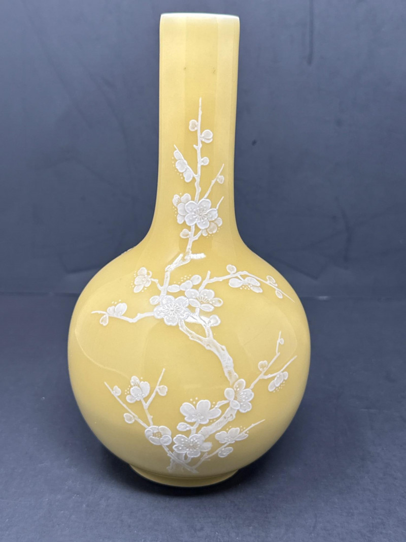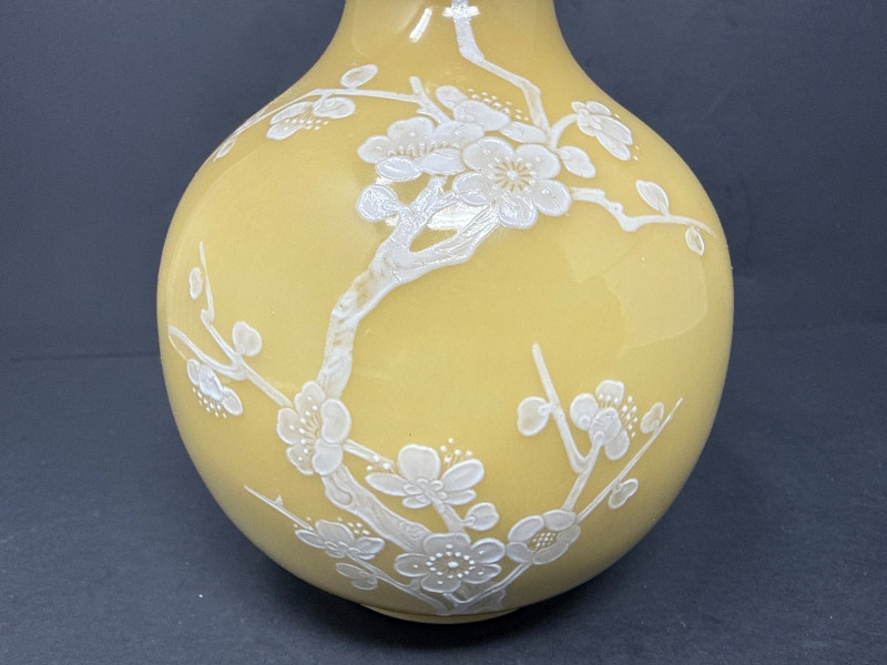 Subject: A signed decorative ceramic vase with a long, narrow neck and a rounded body. Color and motif: Predominantly soft yellow with intricate white floral designs resembling cherry blossoms; branches and blossoms are finely rendered across the surface. Material and finish: Appears to be porcelain or glazed ceramic with either painted or slightly embossed detailing; the surface catches light subtly, suggesting a smooth finish. Impression: The piece conveys delicate, traditional craftsmanship with an East Asian aesthetic and would work well as a focal display object on a shelf or pedestal.