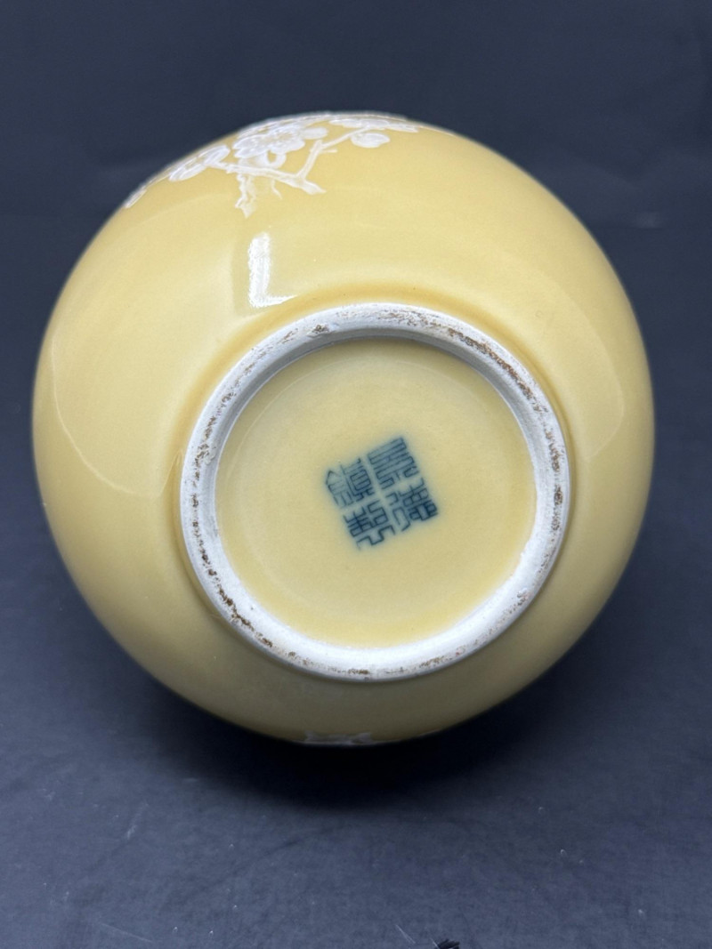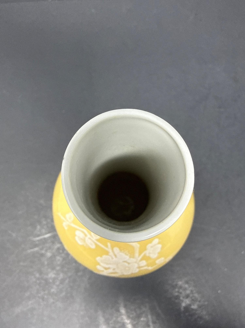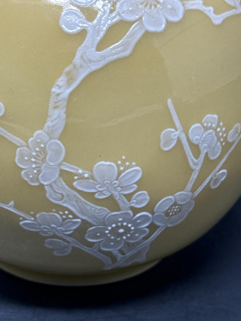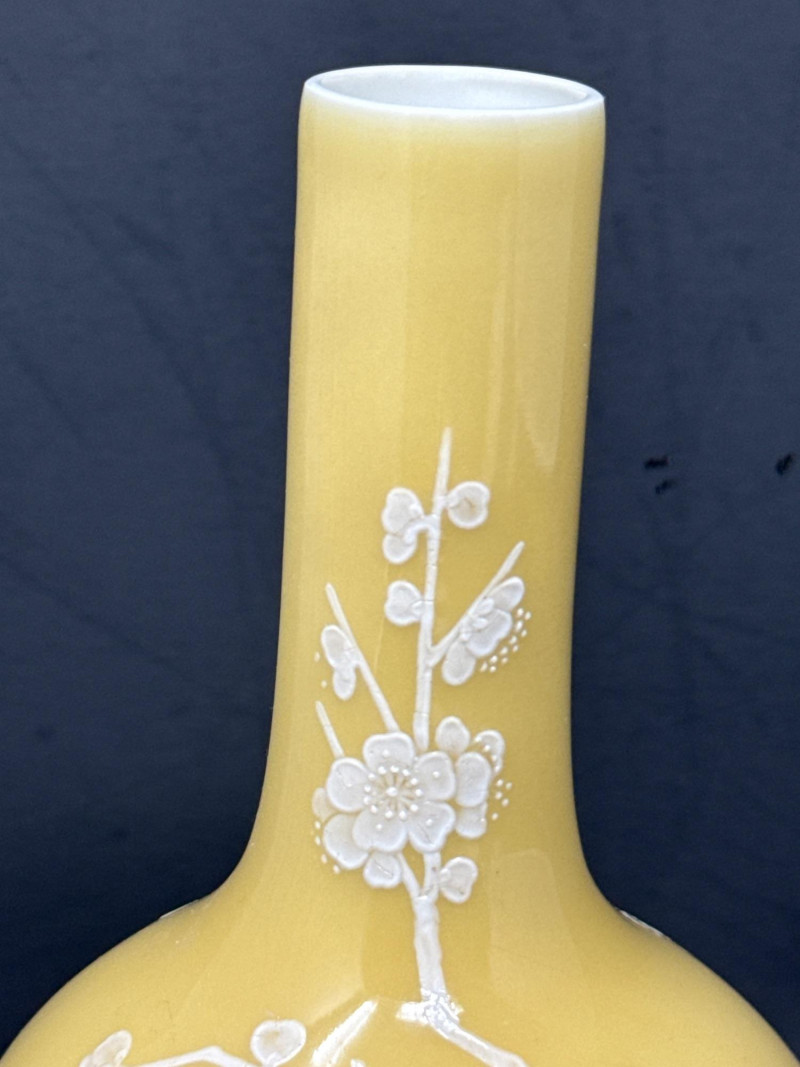Subject: A signed decorative ceramic vase with a long, narrow neck and a rounded body. Color and motif: Predominantly soft yellow with intricate white floral designs resembling cherry blossoms; branches and blossoms are finely rendered across the surface. Material and finish: Appears to be porcelain or glazed ceramic with either painted or slightly embossed detailing; the surface catches light subtly, suggesting a smooth finish. Impression: The piece conveys delicate, traditional craftsmanship with an East Asian aesthetic and would work well as a focal display object on a shelf or pedestal.