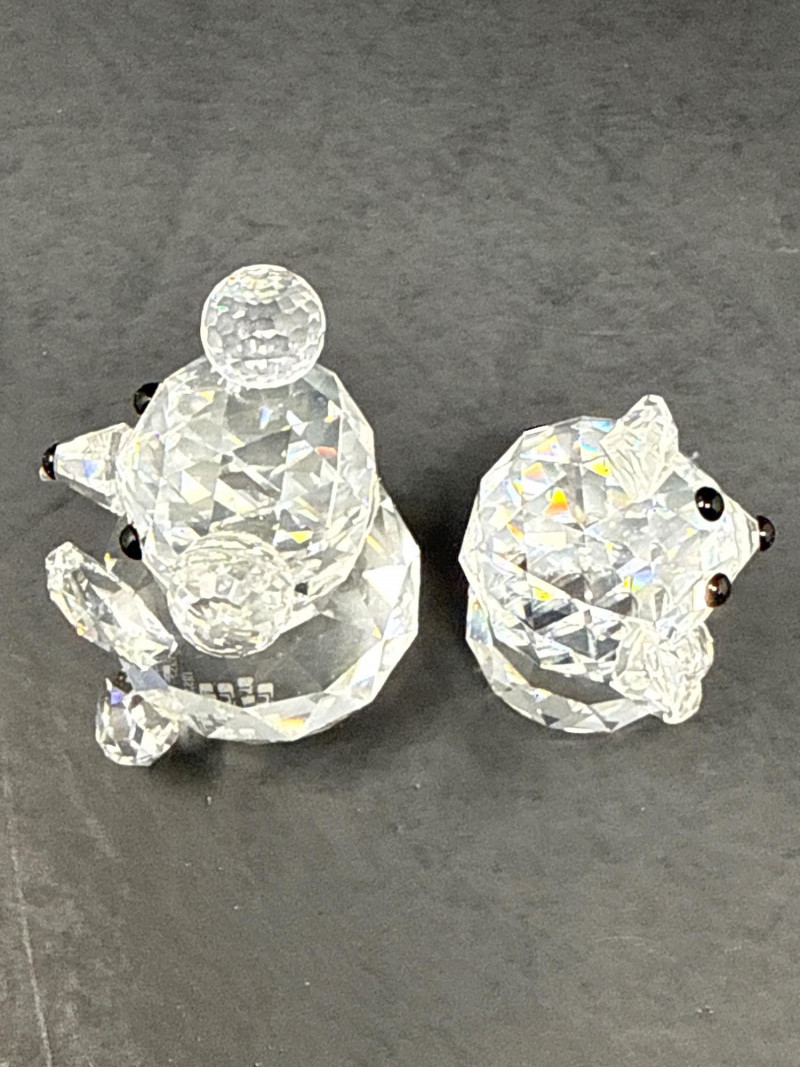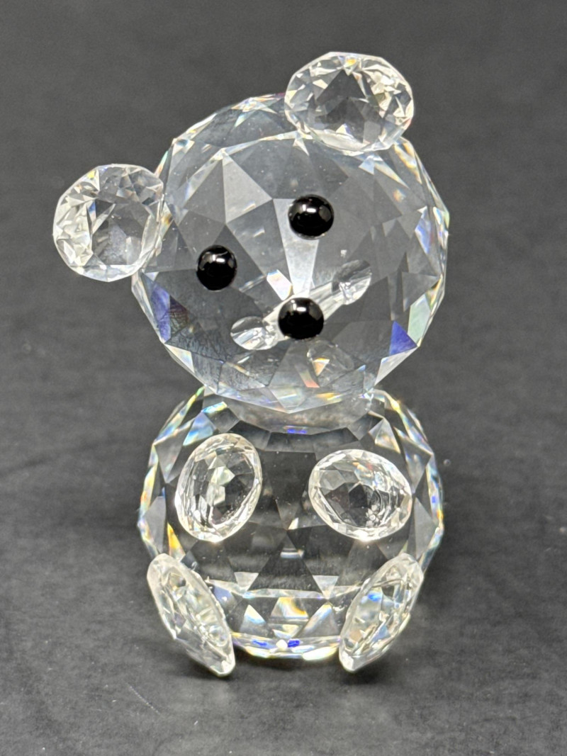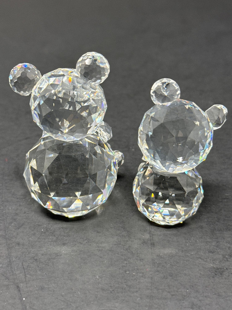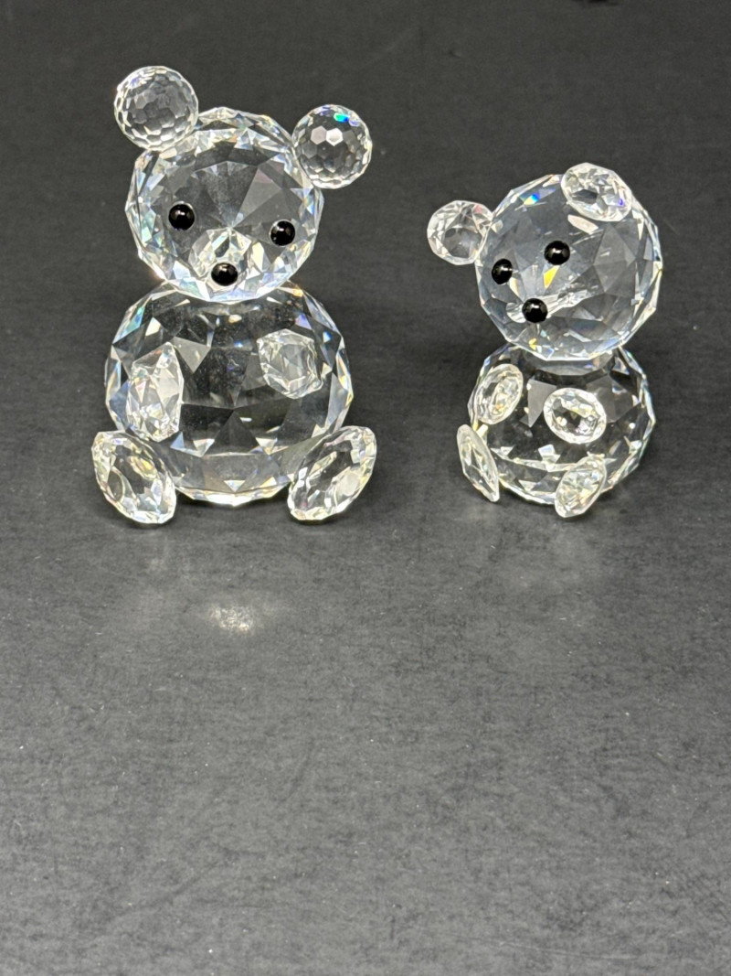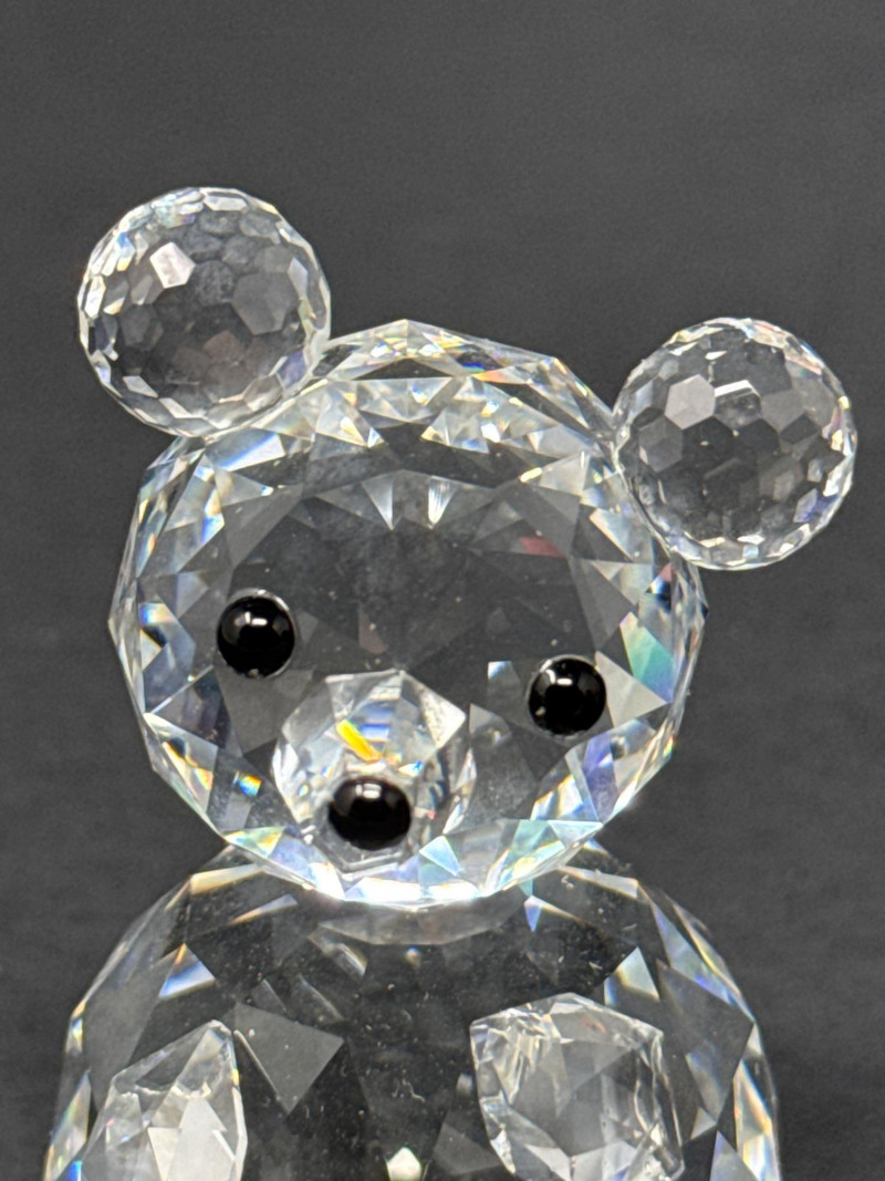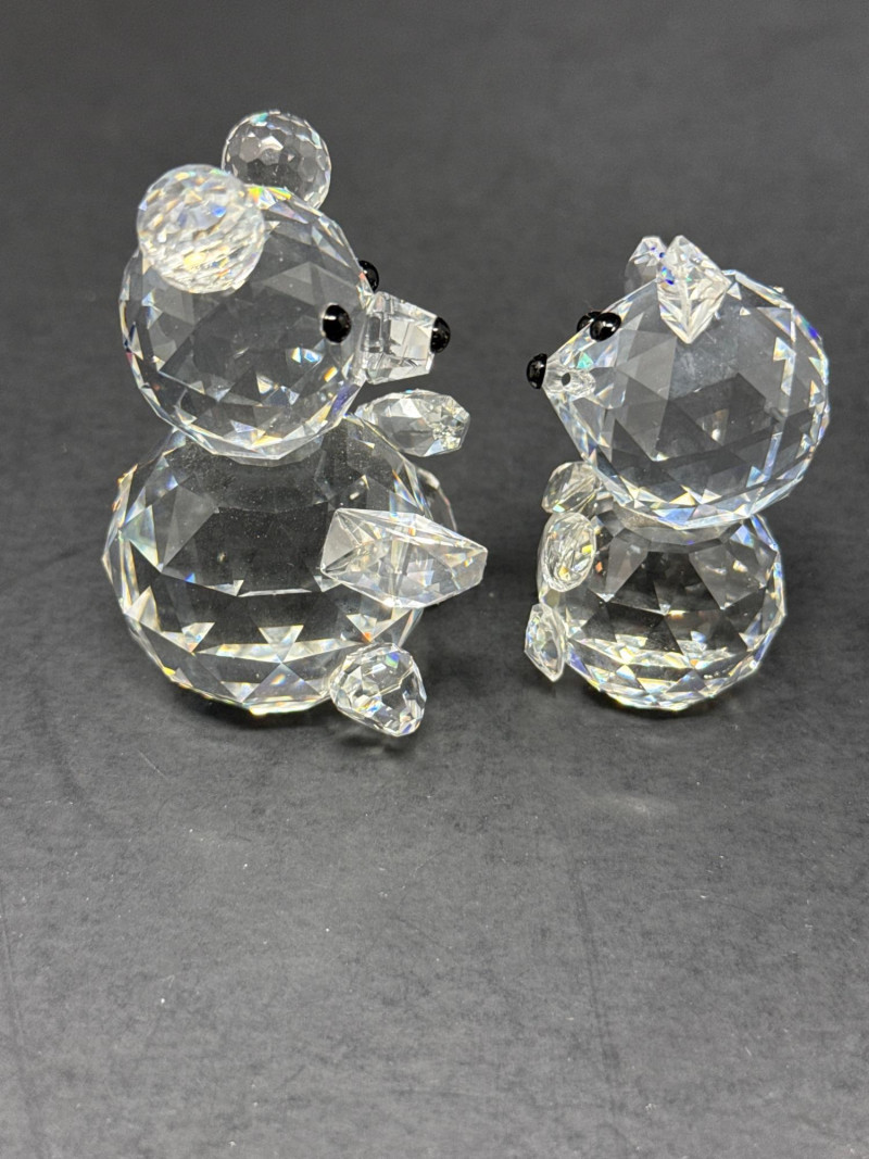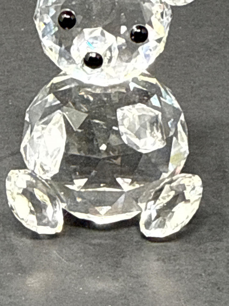 Swarovski Crystal figurines include original packaging. The lot features one crystal teddy bear figurine displayed on a dark surface that enhances their sparkle. Each animal is crafted from faceted clear crystal pieces, which catch and reflect light beautifully, creating a shimmering effect. Their eyes and noses are made from small black beads, providing a charming contrast to the transparent bodies. The bear on the left sits upright with its legs spread in a classic pose, while the mouse on the right leans slightly to one side, giving a more relaxed and playful impression. The craftsmanship highlights delicate details like rounded ears, defined limbs, and smooth contours, making these figurines both whimsical and elegant—ideal for decorative display or collectible appeal. Bear is 2.75 inch tall, 1.75 inch wide,1.5 inch long Mouse is 2.25in tall, 1in wide, 1.25in long