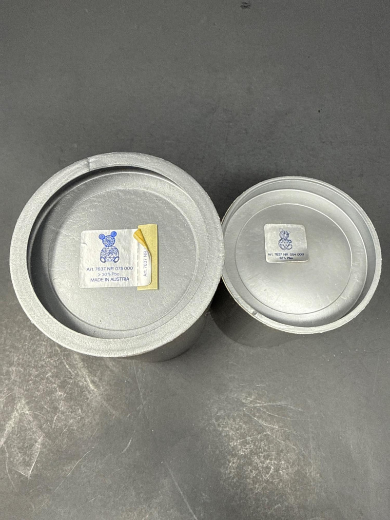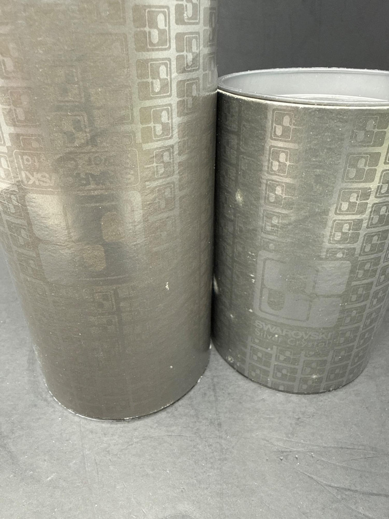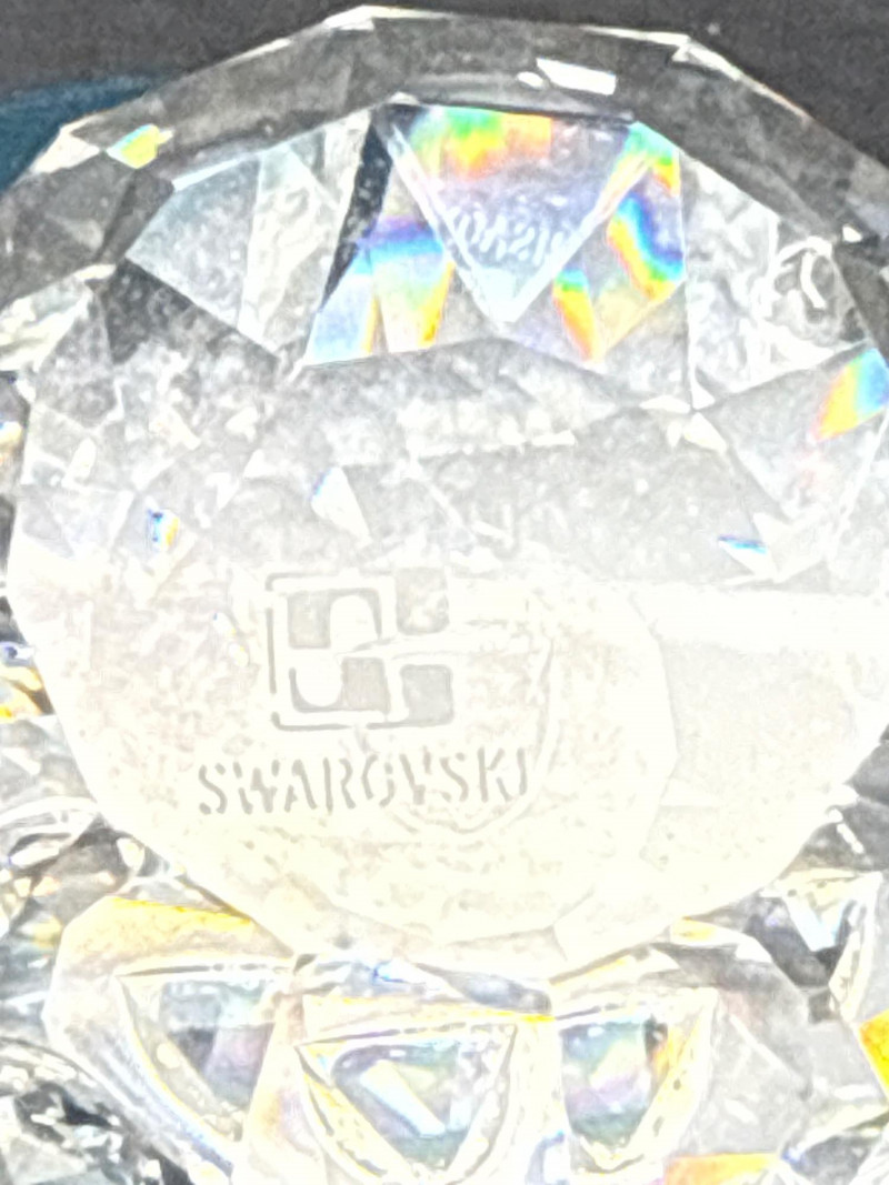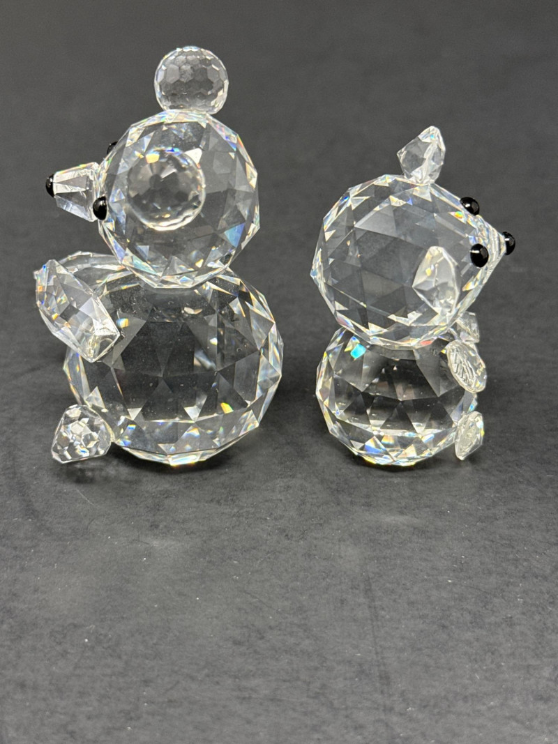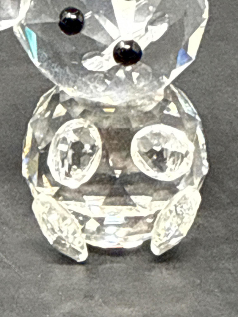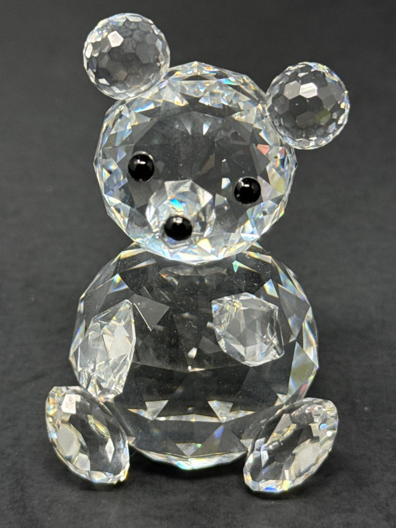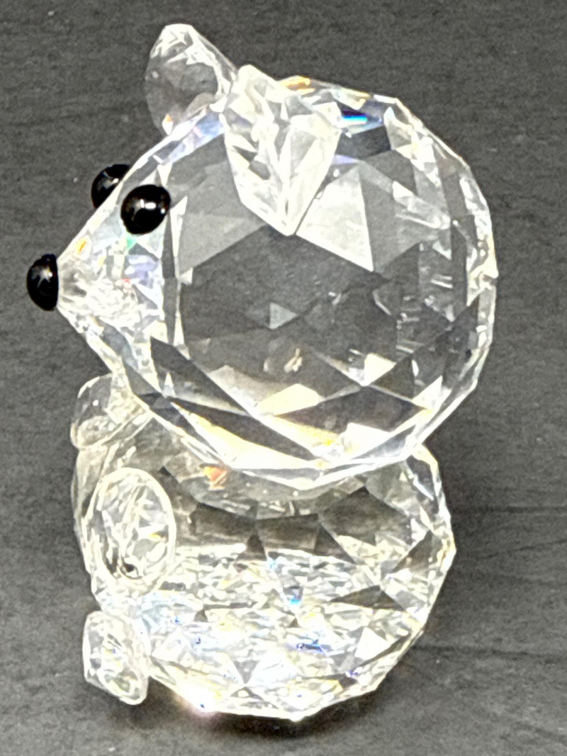 Swarovski Crystal figurines include original packaging. The lot features one crystal teddy bear figurine displayed on a dark surface that enhances their sparkle. Each animal is crafted from faceted clear crystal pieces, which catch and reflect light beautifully, creating a shimmering effect. Their eyes and noses are made from small black beads, providing a charming contrast to the transparent bodies. The bear on the left sits upright with its legs spread in a classic pose, while the mouse on the right leans slightly to one side, giving a more relaxed and playful impression. The craftsmanship highlights delicate details like rounded ears, defined limbs, and smooth contours, making these figurines both whimsical and elegant—ideal for decorative display or collectible appeal. Bear is 2.75 inch tall, 1.75 inch wide,1.5 inch long Mouse is 2.25in tall, 1in wide, 1.25in long