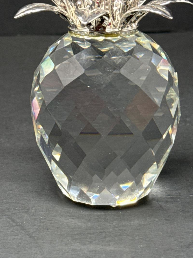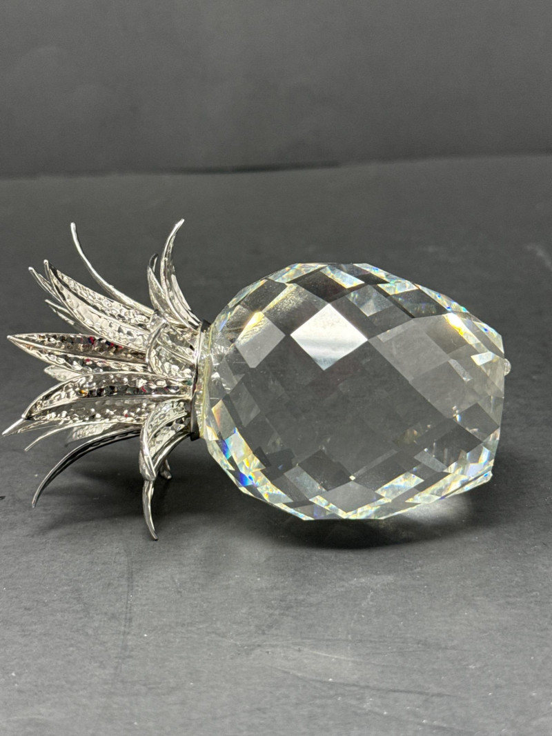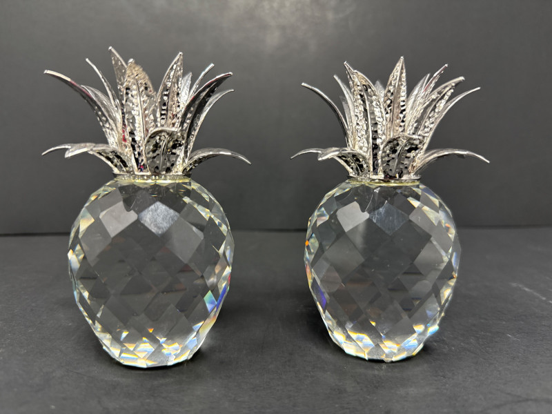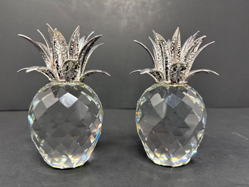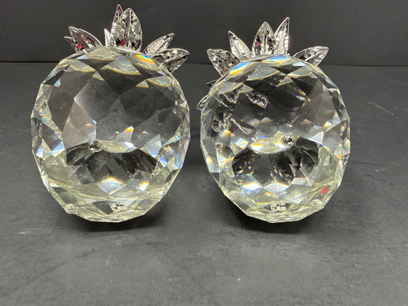 Two decorative Swarovski crystal pineapple candle holders. Each has a faceted, transparent body that catches and refracts light in a prismatic way, producing bright highlights and subtle color reflections. The tops are Rhodium metallic, sculpted to mimic spiky pineapple leaves with fine detailing that contrasts with the smooth, faceted bodies. The composition emphasizes craftsmanship and ornamental appeal; there is no visible text or numerical content. Includes Swarovski candles. Unused, but with a warp in two. Includes original boxes and documents. Retired collection