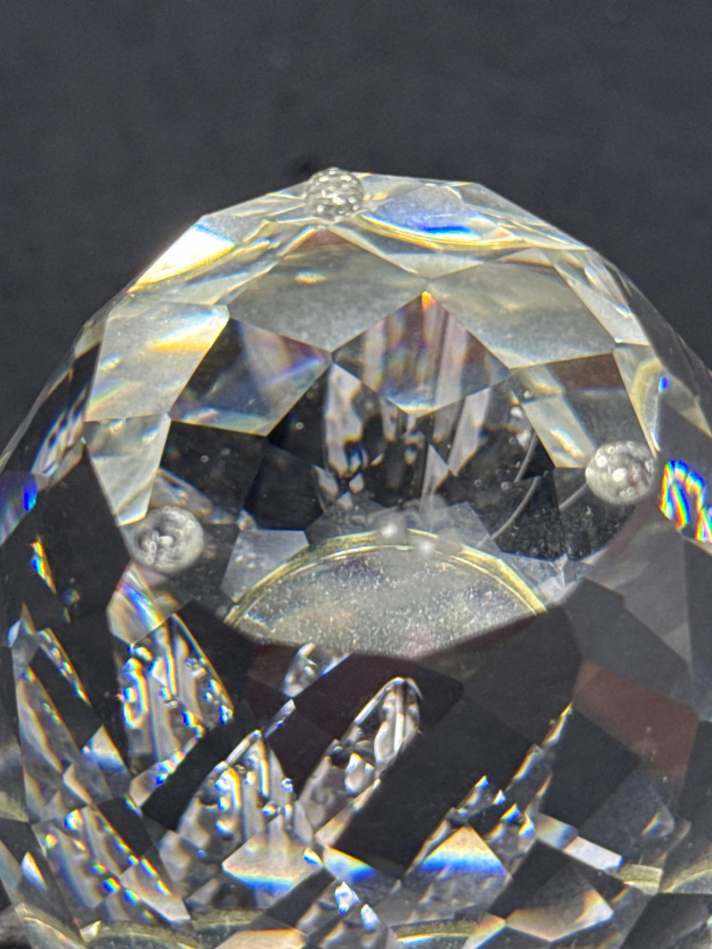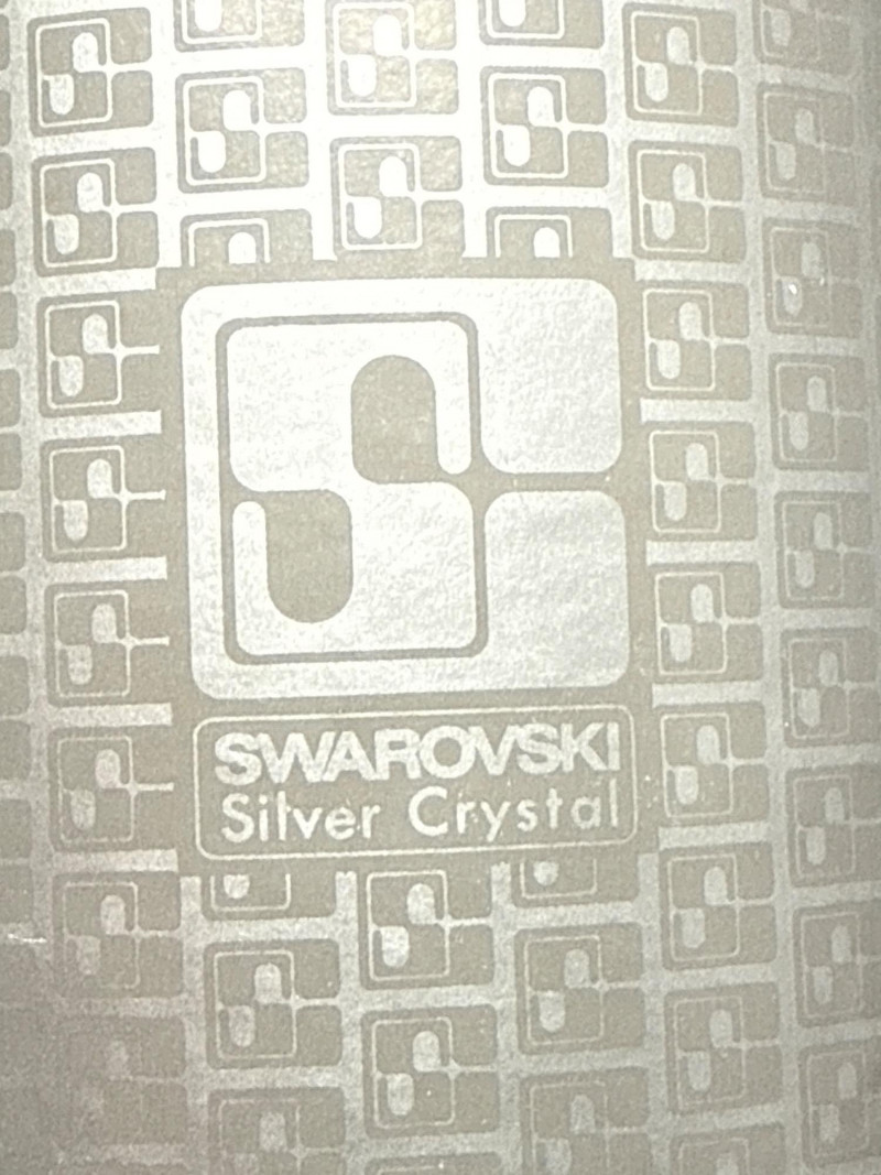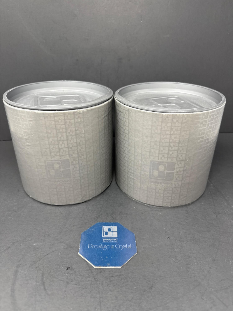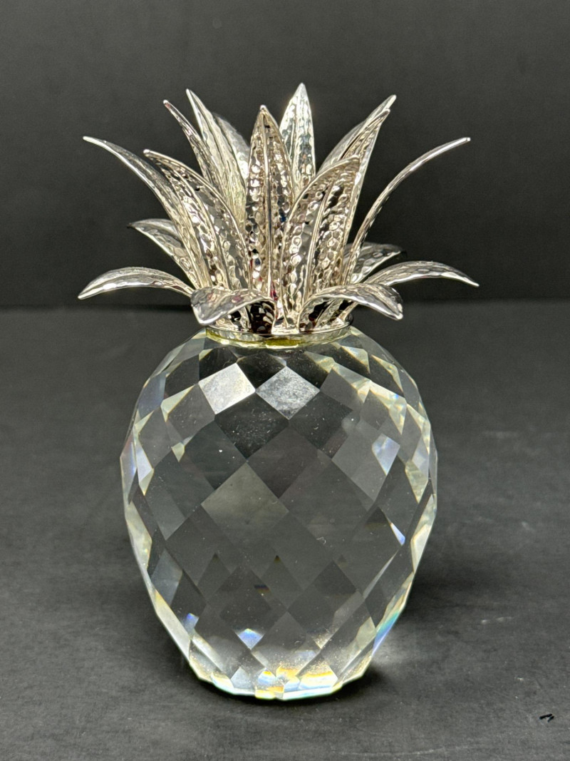Two decorative Swarovski crystal pineapple candle holders. Each has a faceted, transparent body that catches and refracts light in a prismatic way, producing bright highlights and subtle color reflections. The tops are Rhodium metallic, sculpted to mimic spiky pineapple leaves with fine detailing that contrasts with the smooth, faceted bodies. The composition emphasizes craftsmanship and ornamental appeal; there is no visible text or numerical content. Includes Swarovski candles. Unused, but with a warp in two. Includes original boxes and documents. Retired collection
