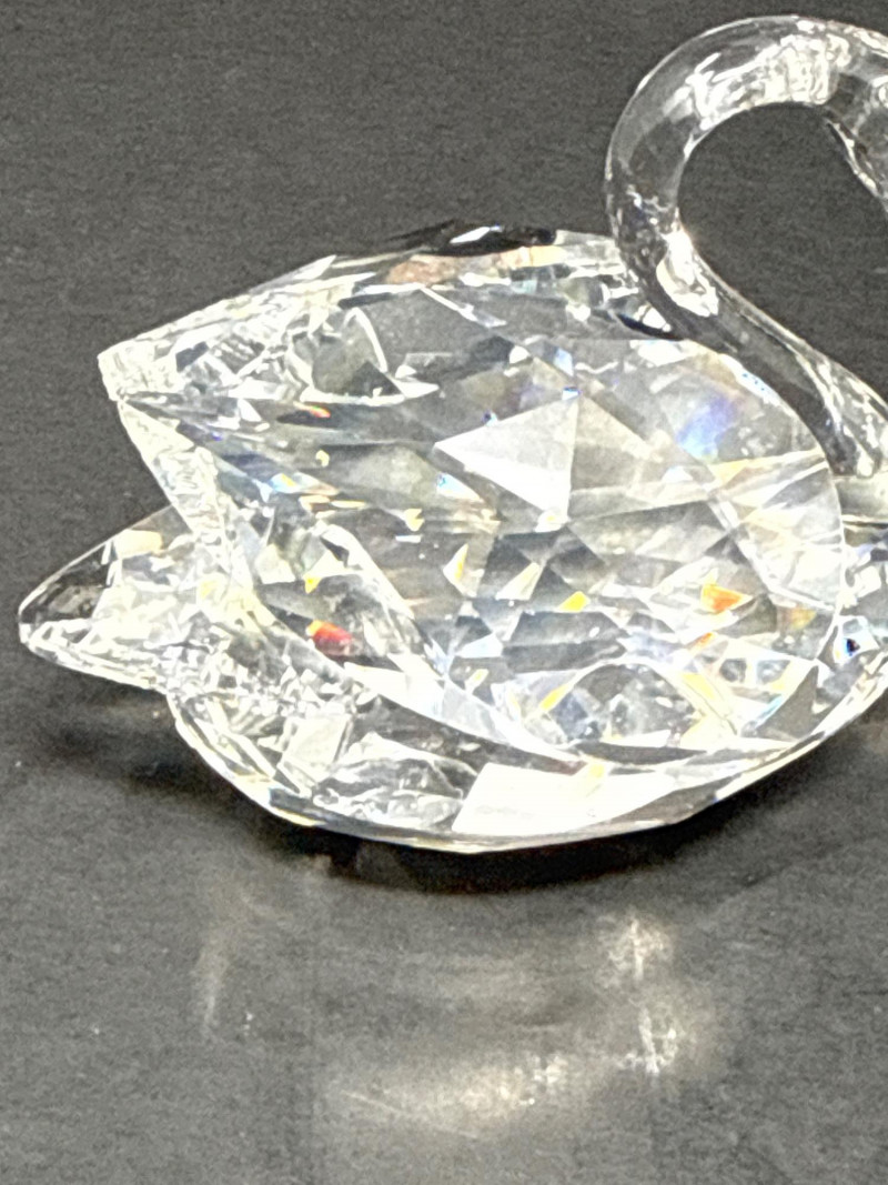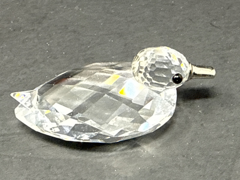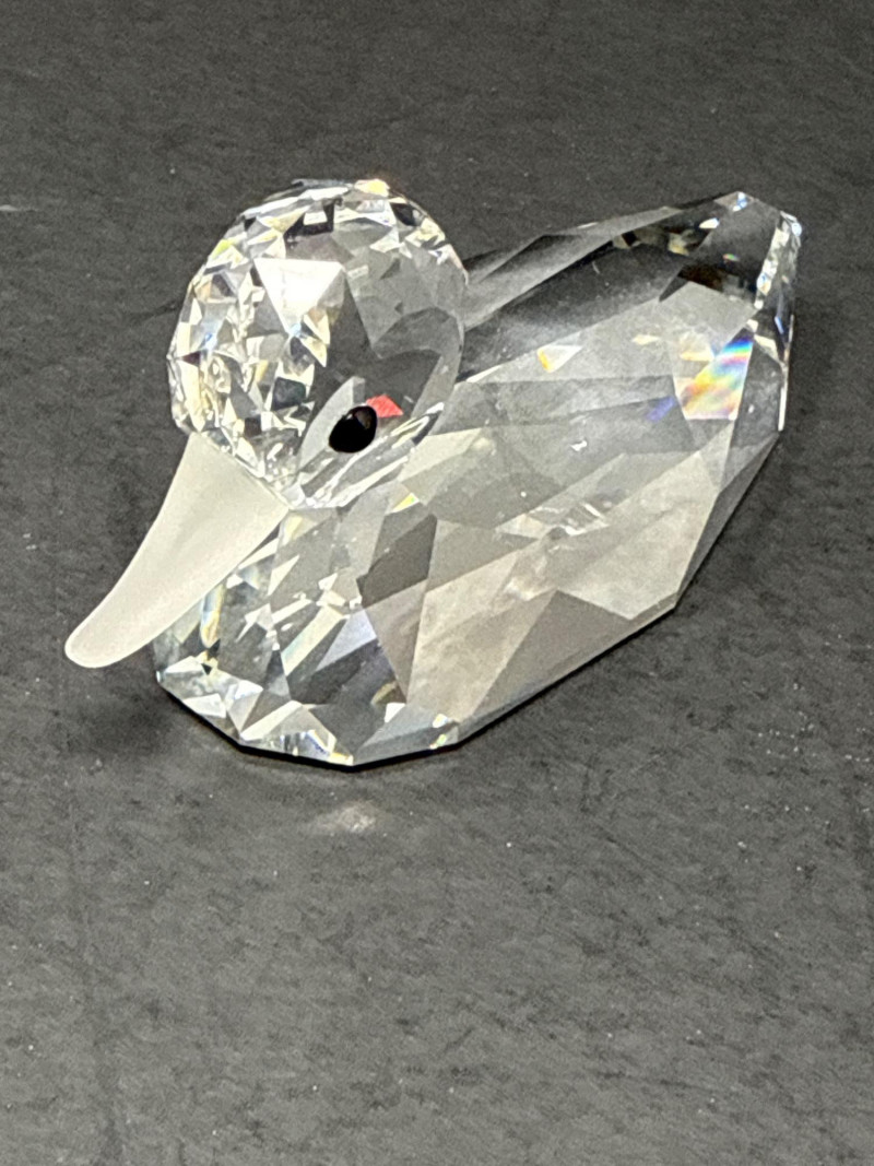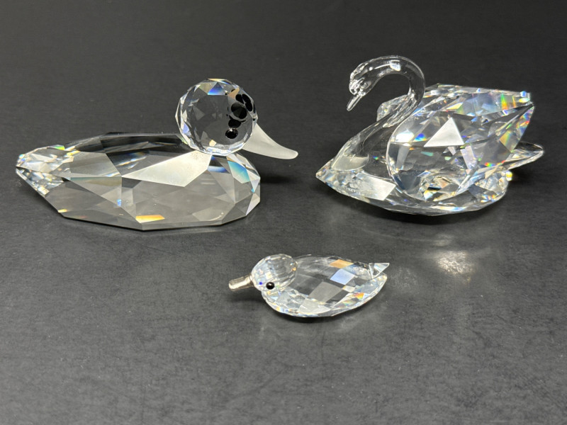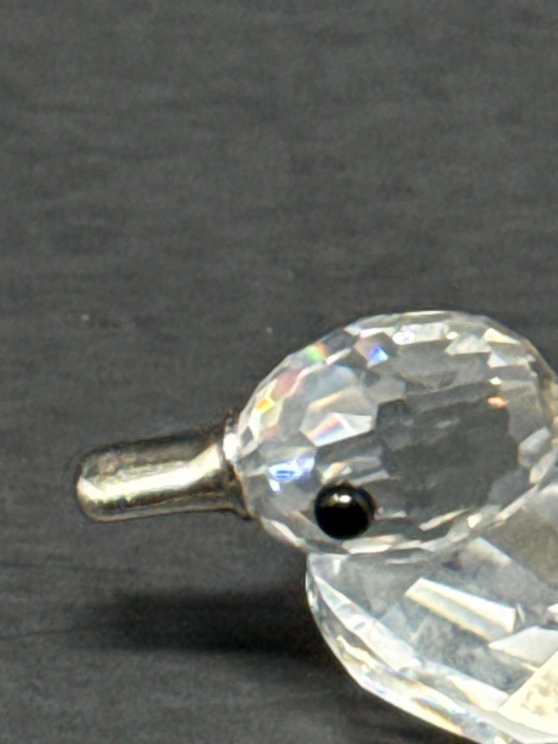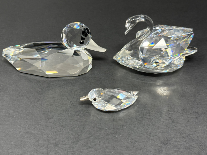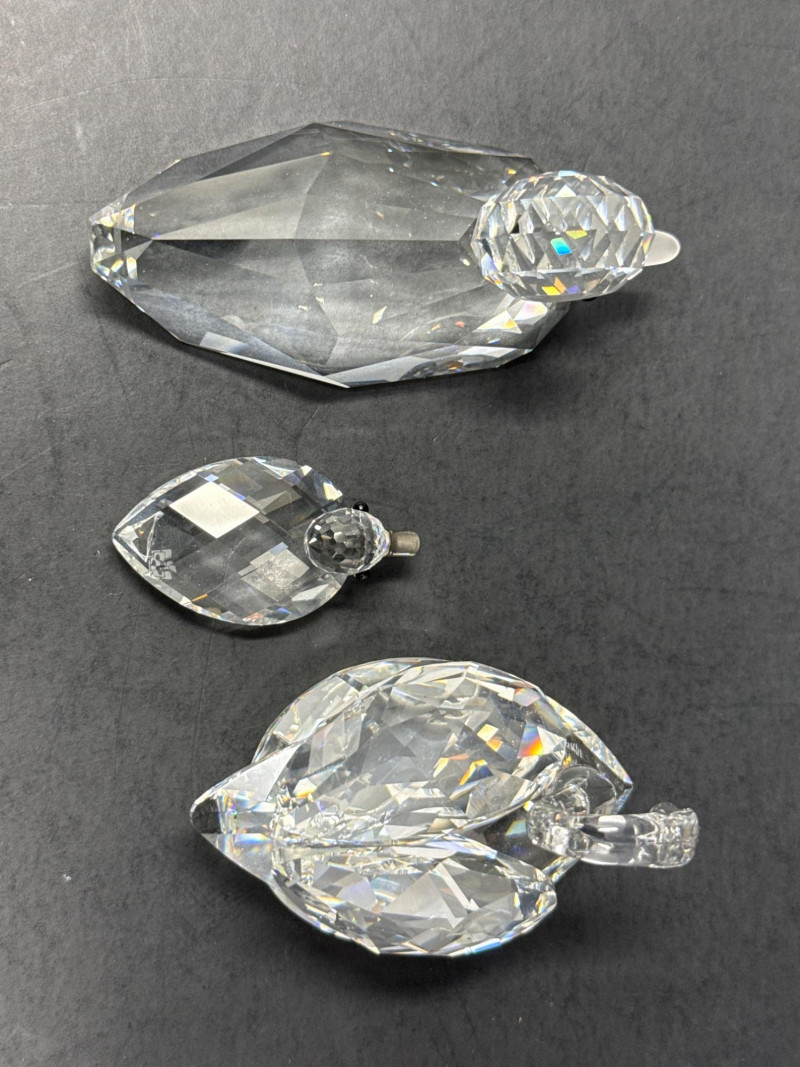 Subjects: Three clear Swarovski crystal bird figurines: a duck, a swan, and a smaller duckling. Swan dimensions are 3 inches long, 2 inch tall, 1.5 inch wide. Mallard 3.5 inch long, 1.5 inch wide, 1.5 inch tall. Miniature duck with metal beak 1.75 inch long, 1 inch wide,.5 inch tall. Appearance: Each piece is finely faceted so light refracts into sparkling, rainbow-like highlights. The duck has a rounded head with dark eyes and a flat beak; the swan shows a graceful, curved neck and a more detailed body; the duckling is noticeably smaller with a simpler silhouette and a metal beak. Notable details: The craftsmanship emphasizes clarity and cut, creating strong reflections and prismatic color play across the facets. The dark background increases contrast, making the crystal edges and internal refractions stand out. Each comes with original box.