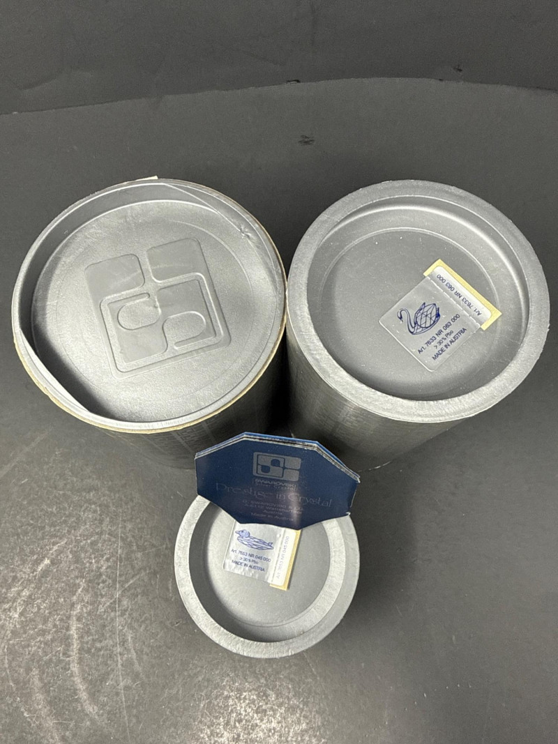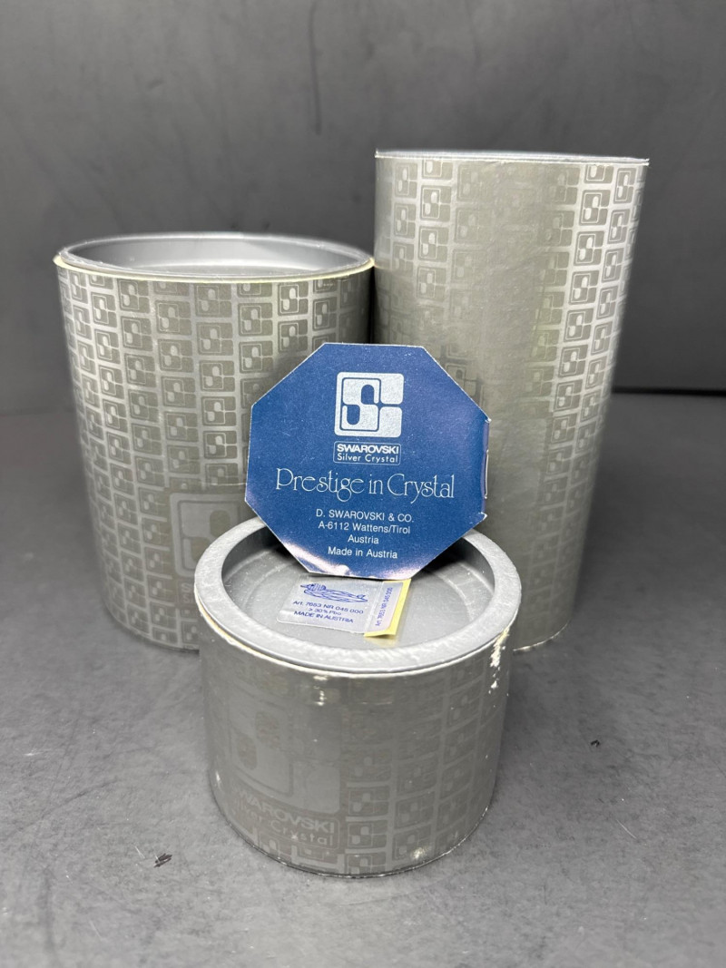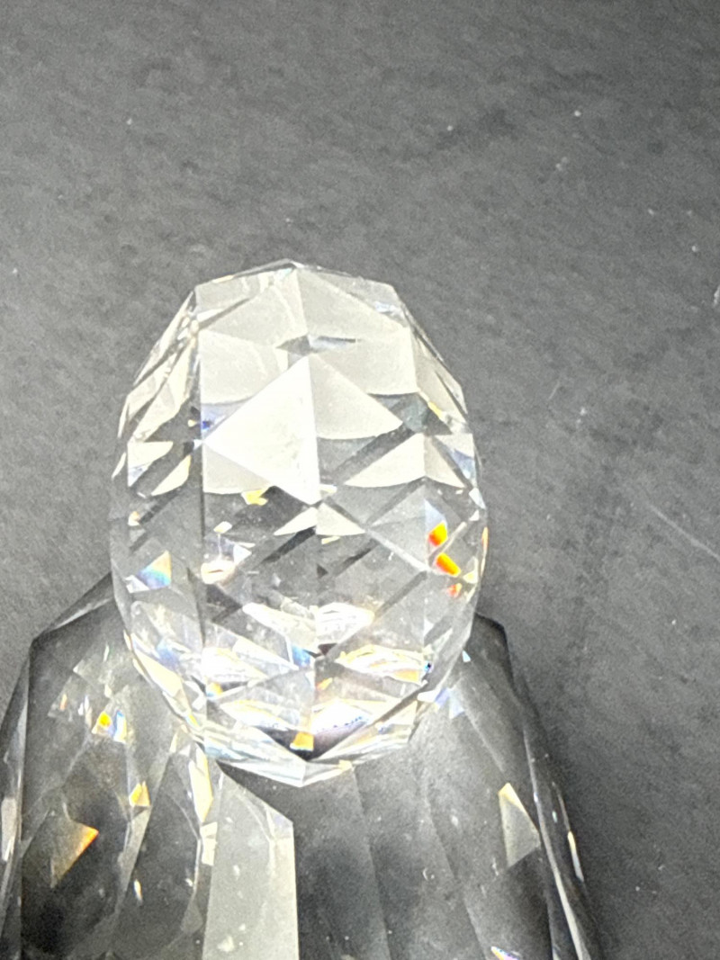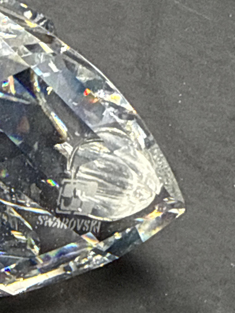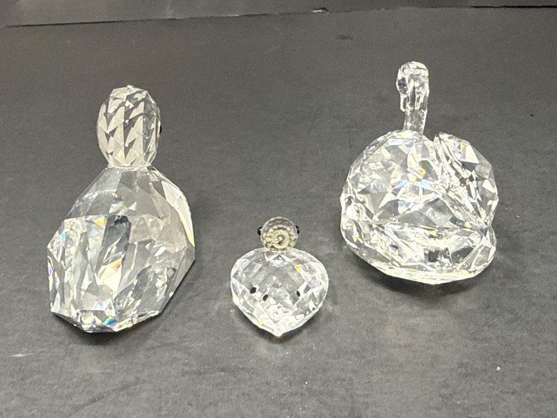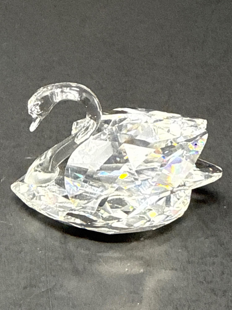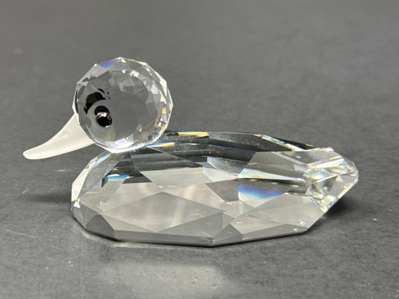 Subjects: Three clear Swarovski crystal bird figurines: a duck, a swan, and a smaller duckling. Swan dimensions are 3 inches long, 2 inch tall, 1.5 inch wide. Mallard 3.5 inch long, 1.5 inch wide, 1.5 inch tall. Miniature duck with metal beak 1.75 inch long, 1 inch wide,.5 inch tall. Appearance: Each piece is finely faceted so light refracts into sparkling, rainbow-like highlights. The duck has a rounded head with dark eyes and a flat beak; the swan shows a graceful, curved neck and a more detailed body; the duckling is noticeably smaller with a simpler silhouette and a metal beak. Notable details: The craftsmanship emphasizes clarity and cut, creating strong reflections and prismatic color play across the facets. The dark background increases contrast, making the crystal edges and internal refractions stand out. Each comes with original box.