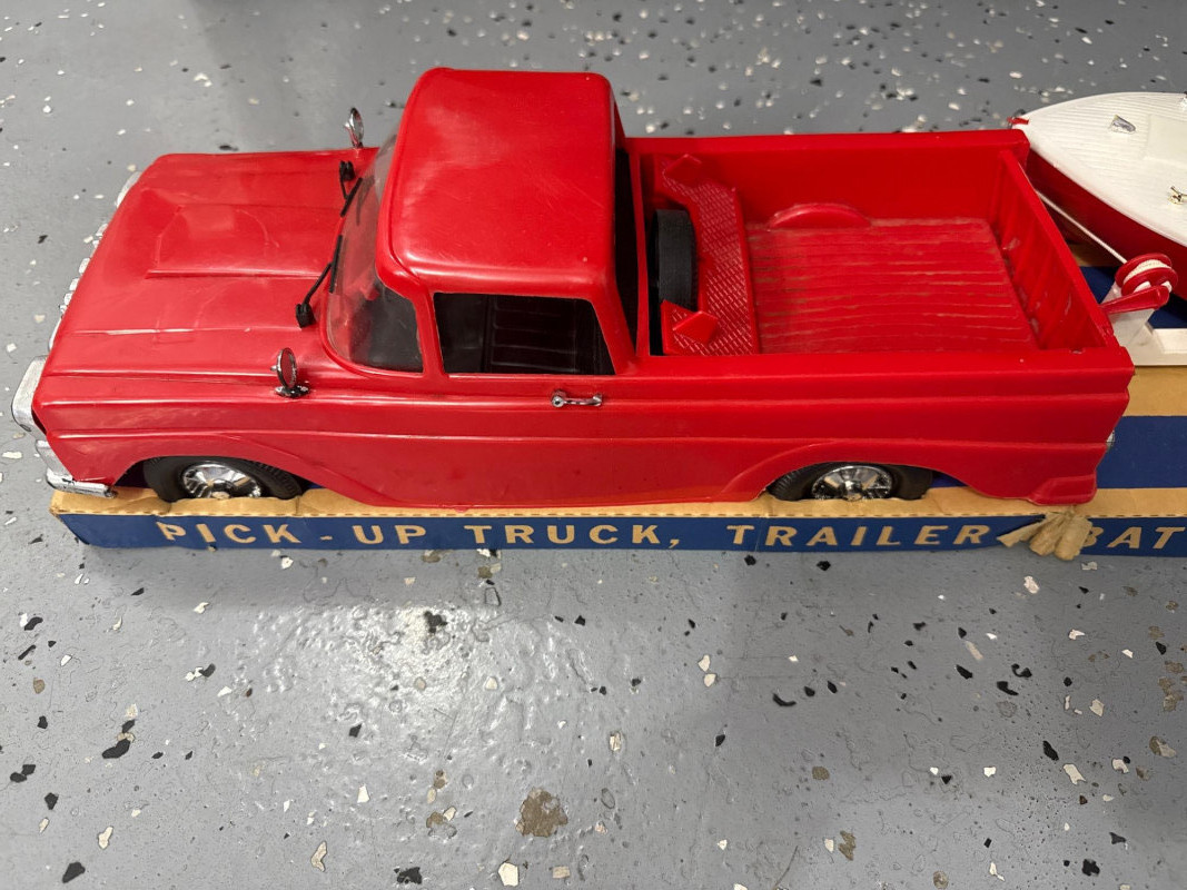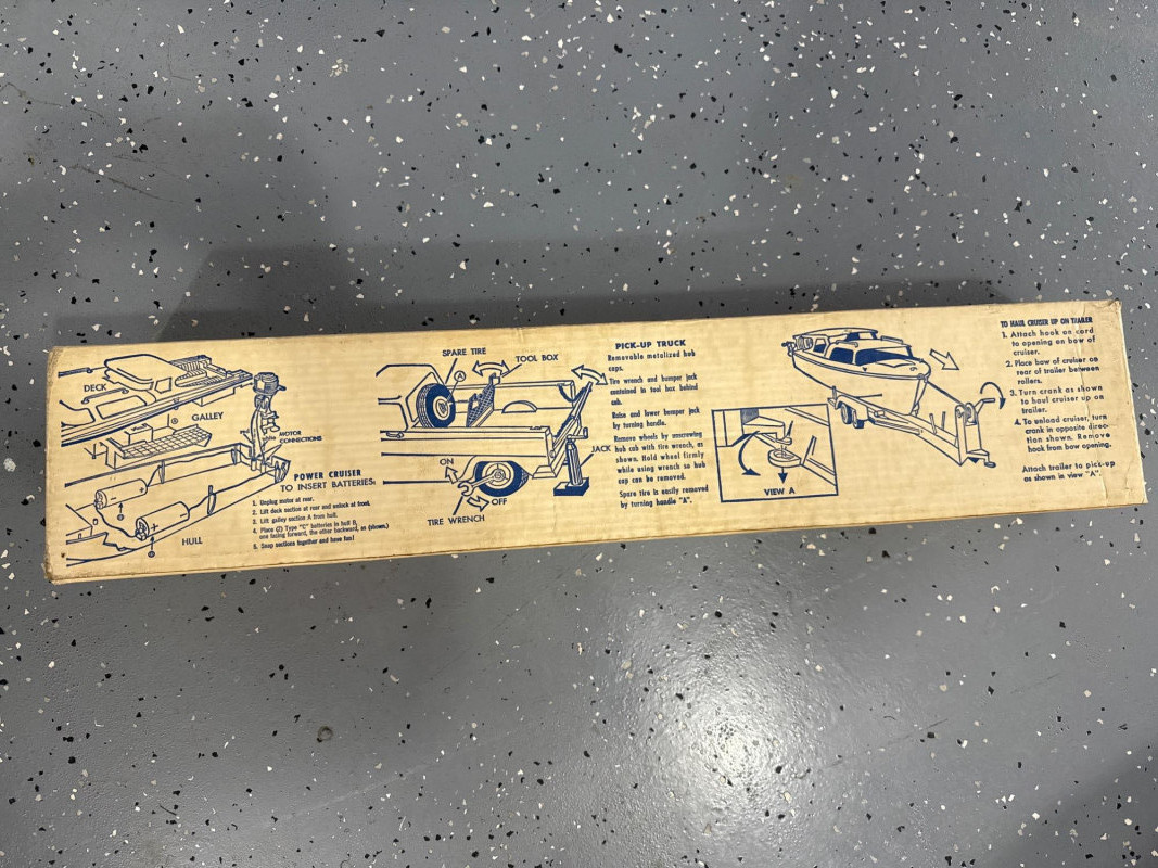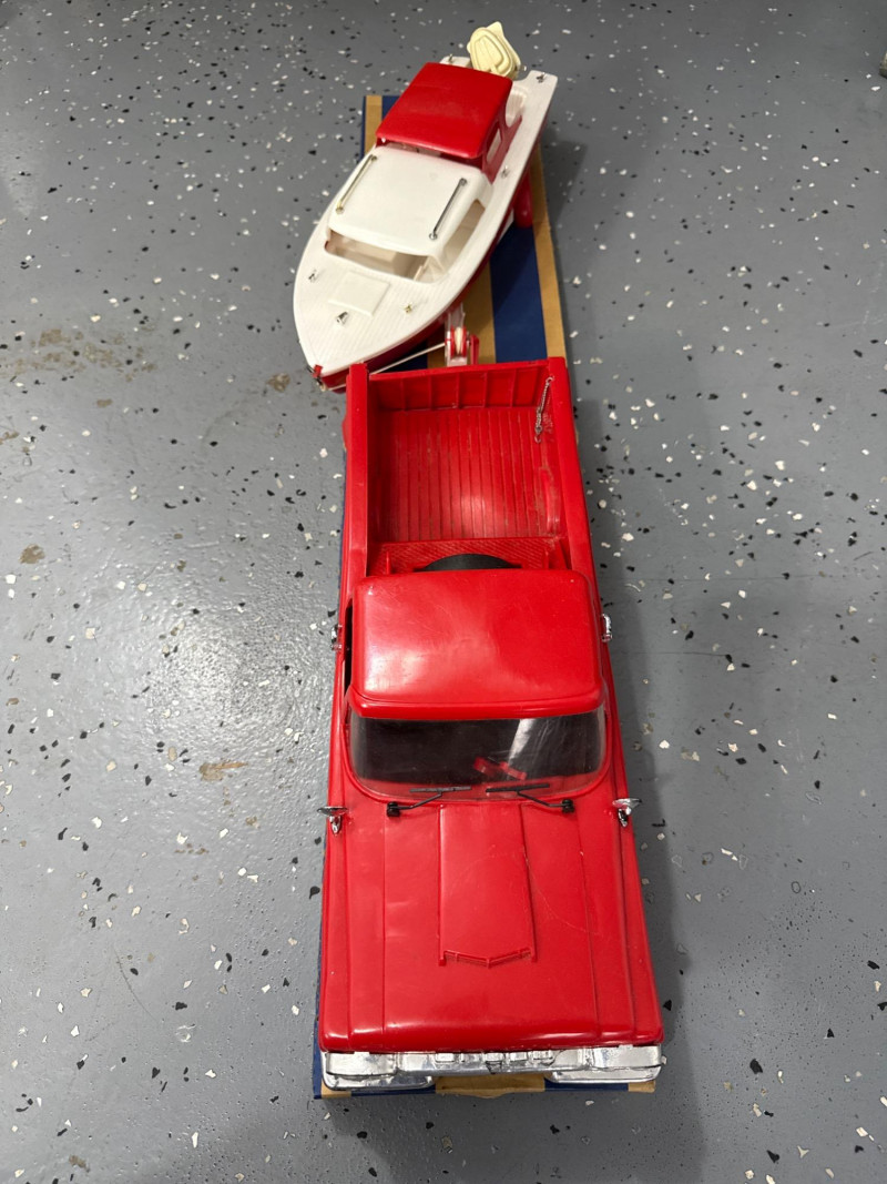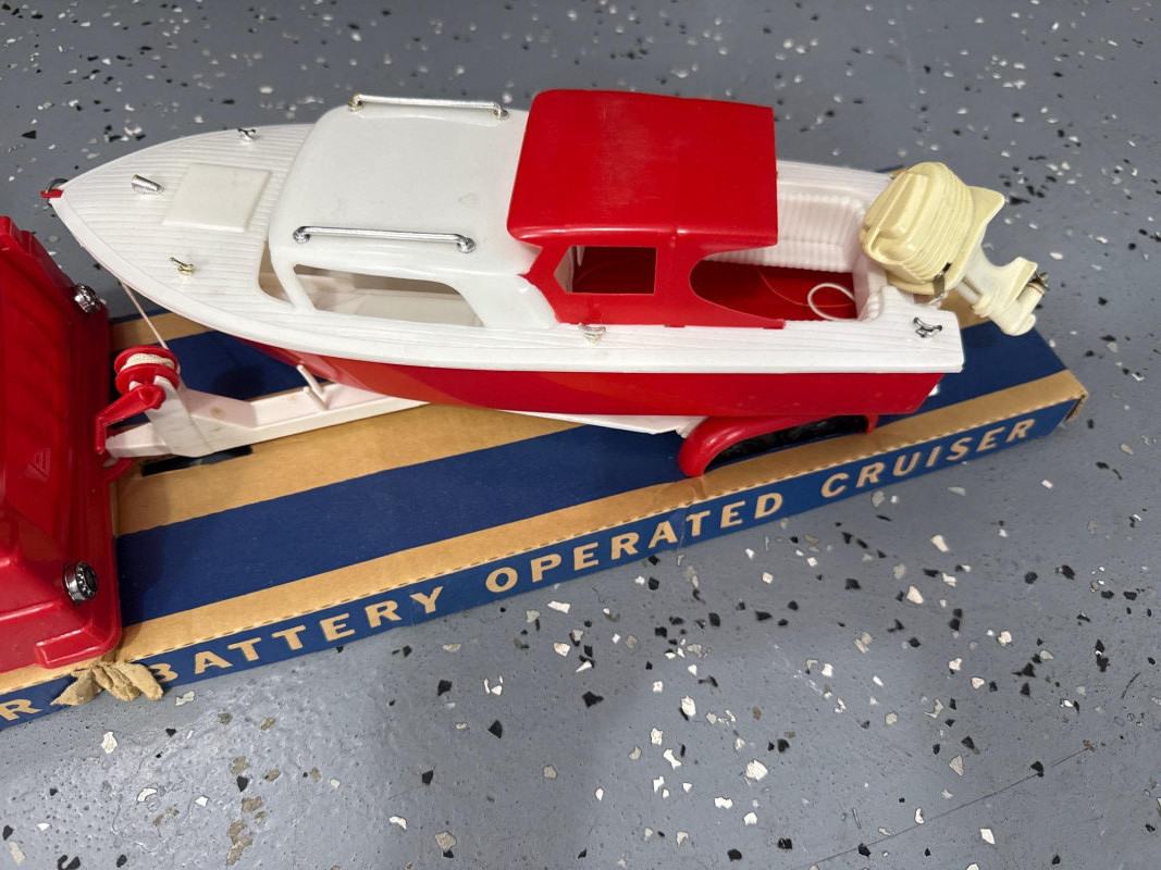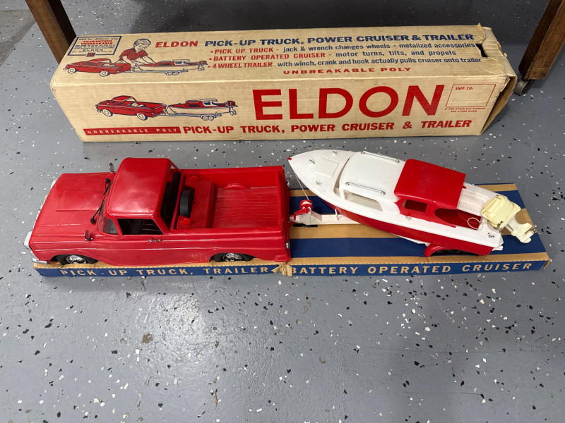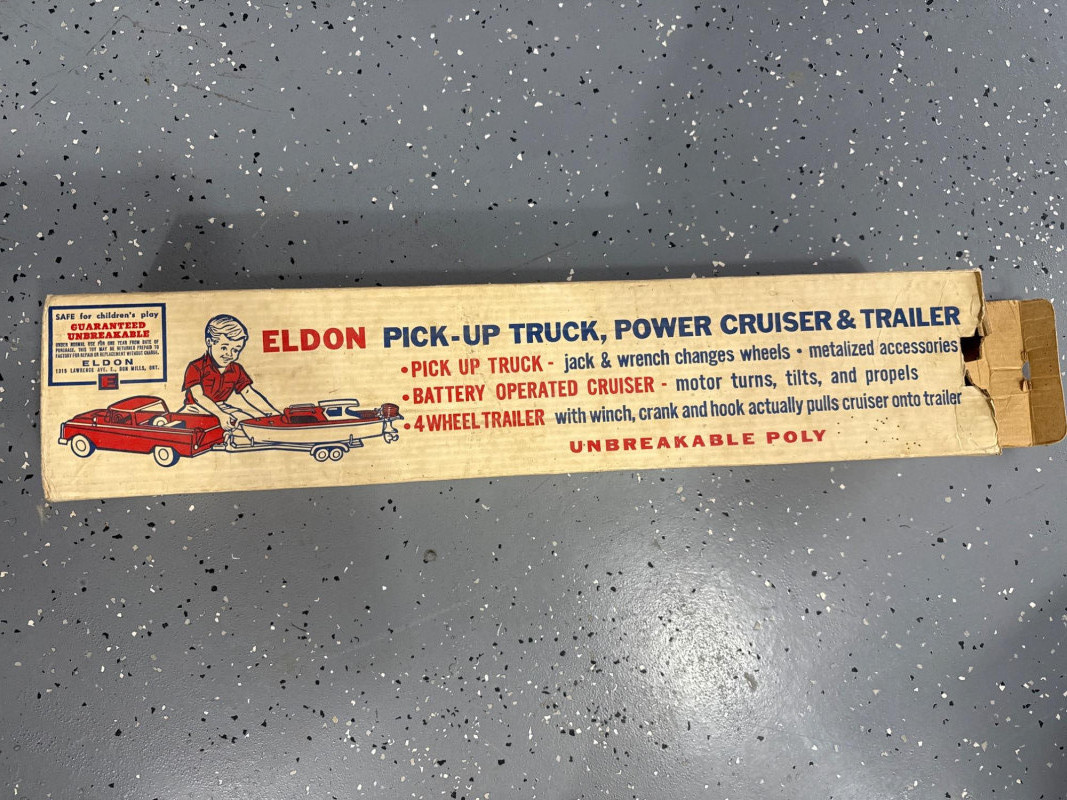 A vintage Eldon toy set NIB, is shown on a cardboard display. The set includes a red pick-up truck, a four-wheel trailer, and a white-and-red battery‑operated power cruiser boat. The toys sit in front of their original illustrated box, which repeats the product name and highlights features. Plastic Components and moving parts.